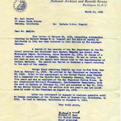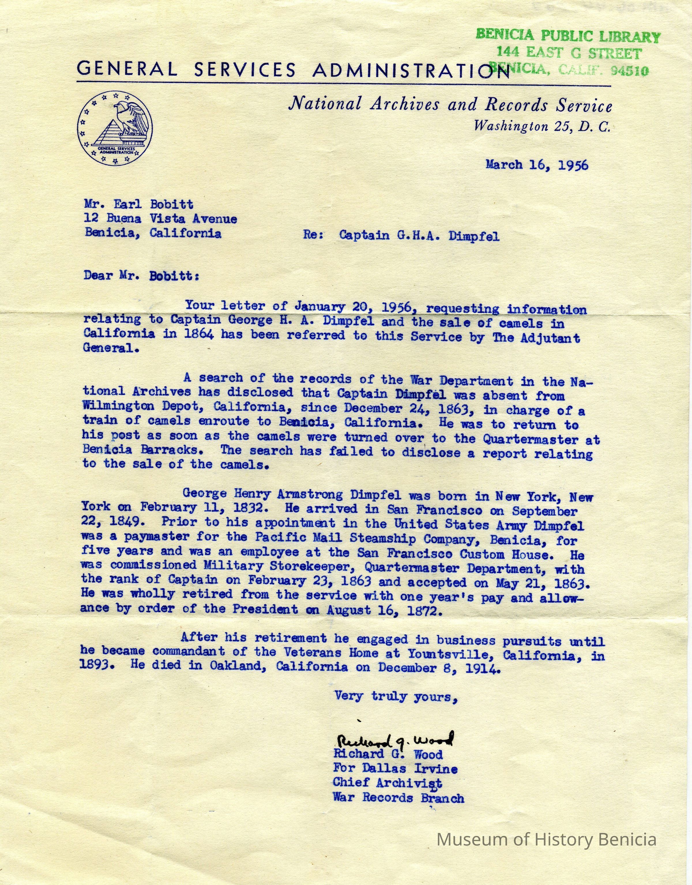 Letter to Earl Bobitt of Benicia from Richard G. Wood, Chief Archivist War Records Branch. On official stationary of General Services Admin, National Archives and Records Service, Washington, D.C.Collection