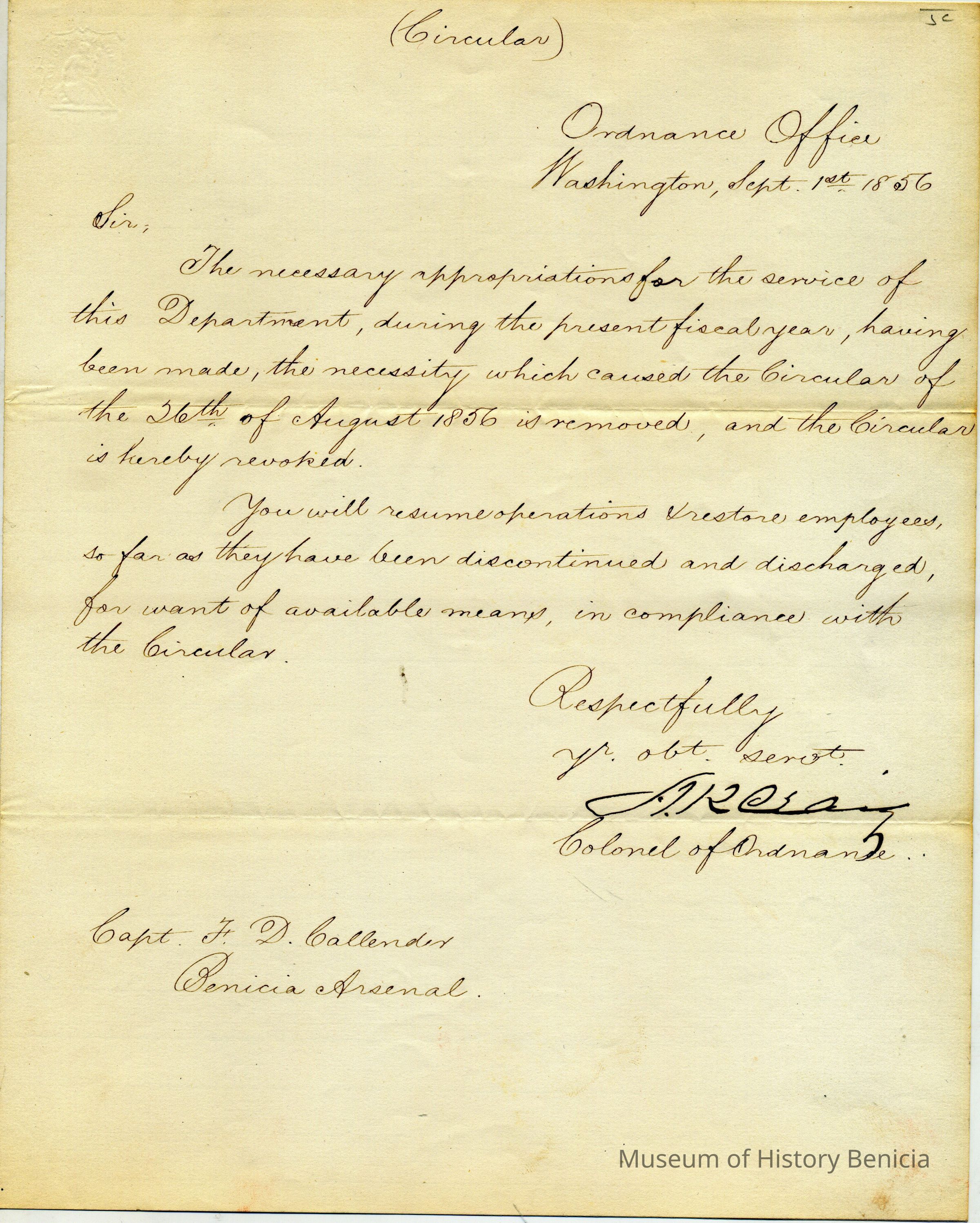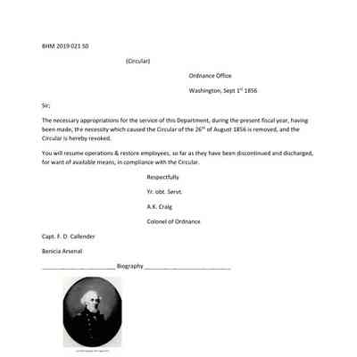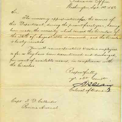 This circular reverses the orders in the circular of 08/26/1856 which was caused by the lack of a budget being passed for the Army. This circular allows re-hiring discontinued/discharged employees.Collection