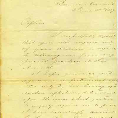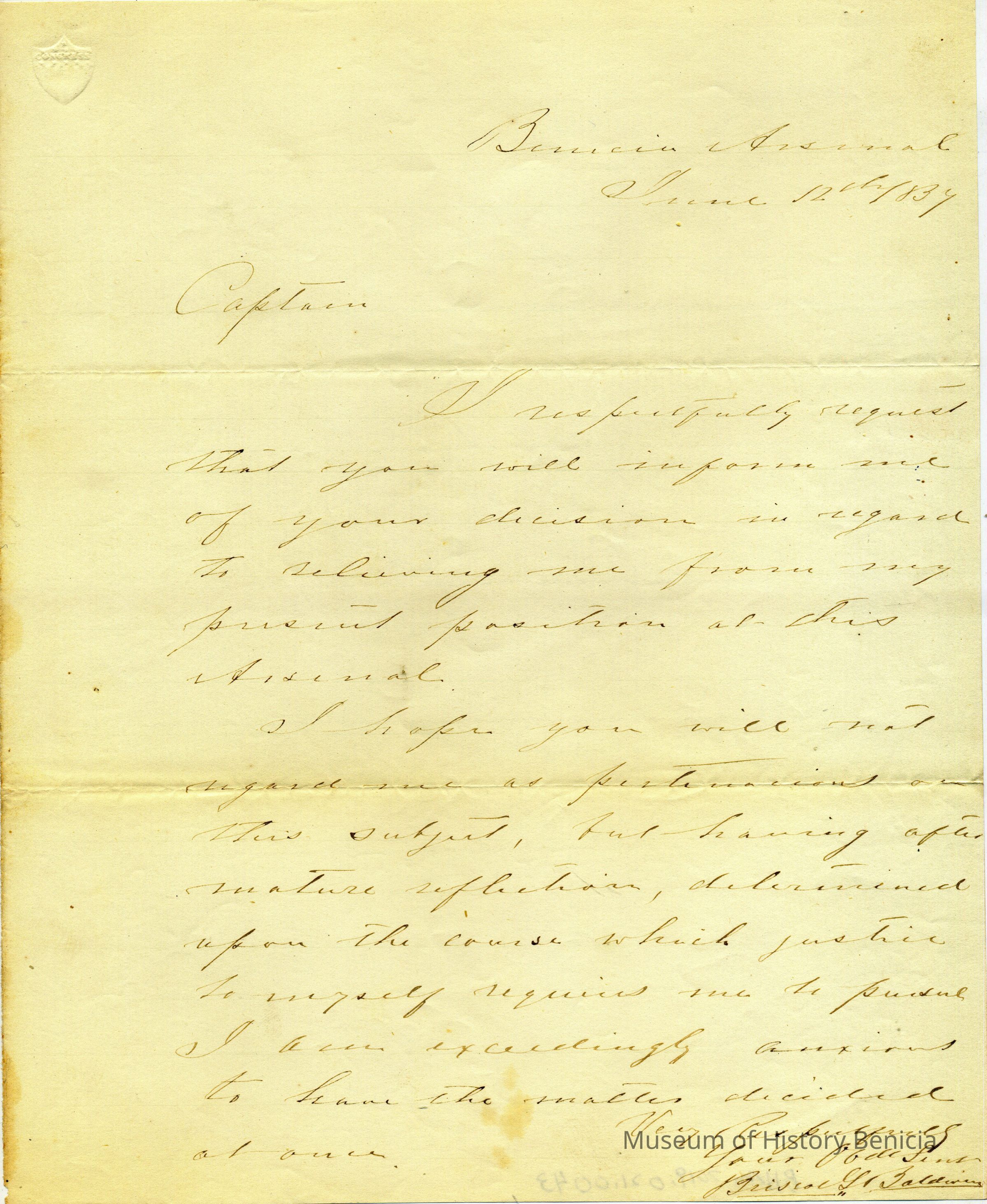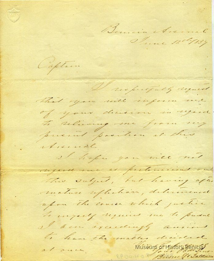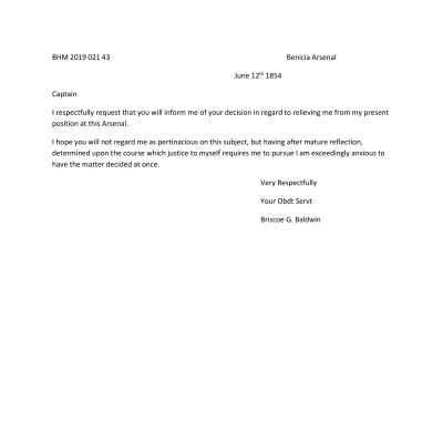 This is a letter from Briscoe Baldwin to Captain Callender at the Benicia Arsenal. He is asking for a decision from the Captain on what action he is going to take against him. This probably refers to Baldwin's refusal to carry out an order as explained in the letter in record 2019.021.0042 (07/30/1857).