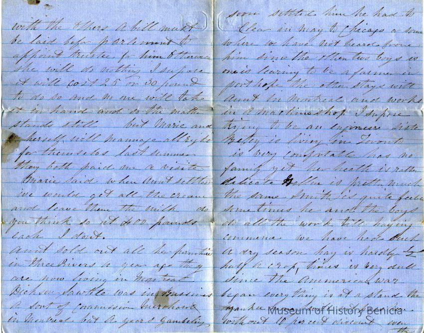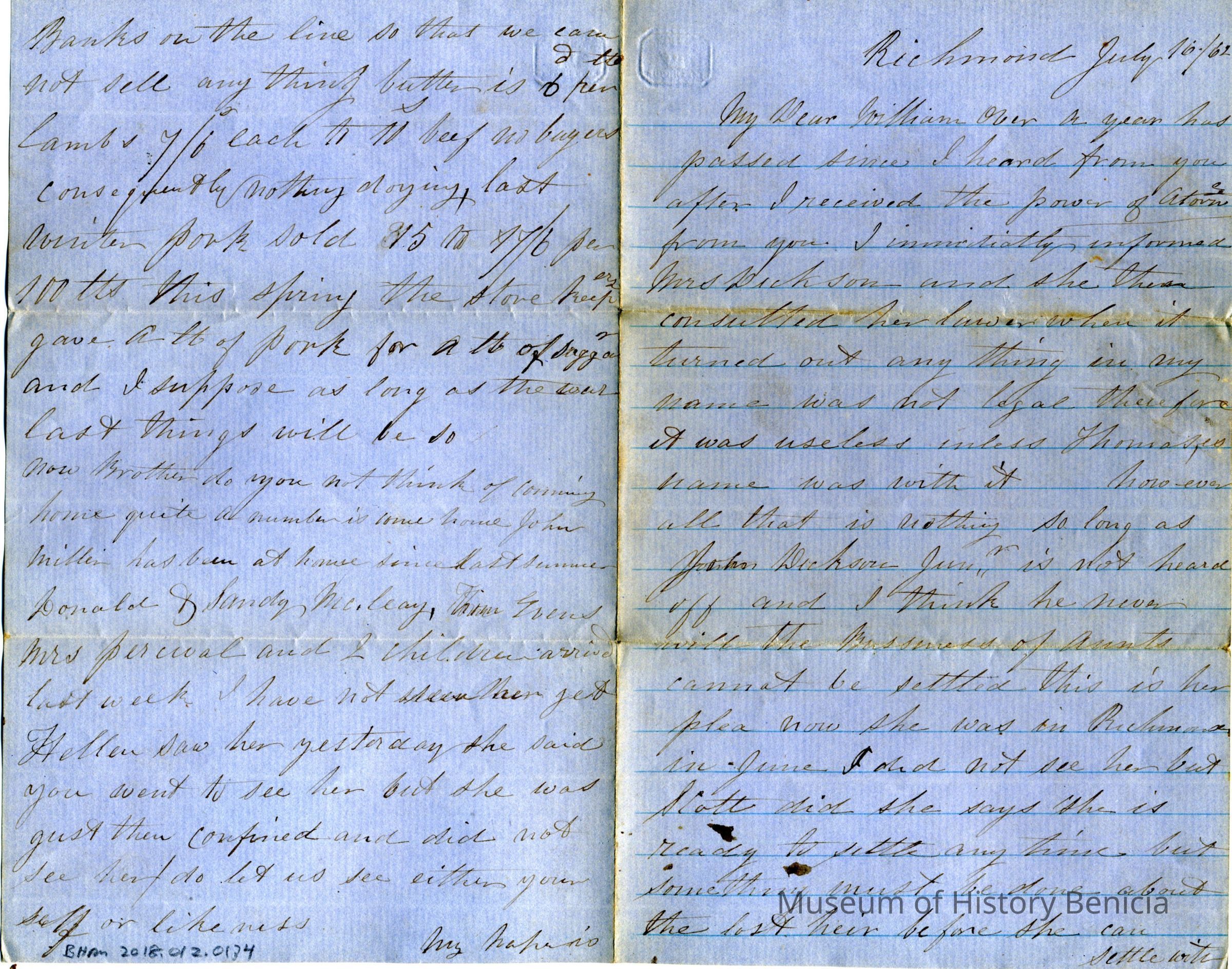 This is a letter dated 07/16/1862.It is from Richmond Virginia and was written to William ? from someone about an inheritance. It references John Dickson and finding the last heir. This may be William's Uncle and the letter speaks as if his Aunt has control of the distribution of the estate.Collection