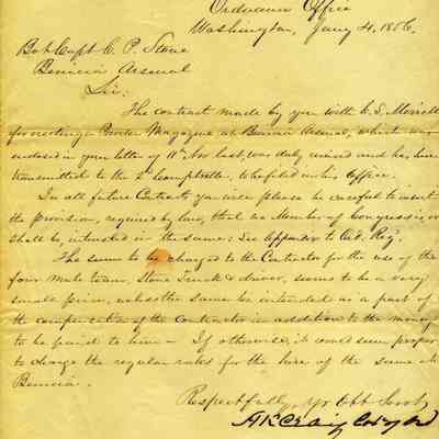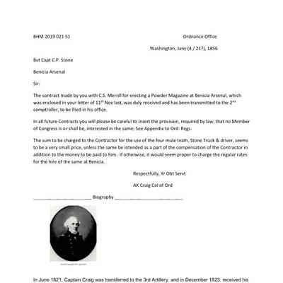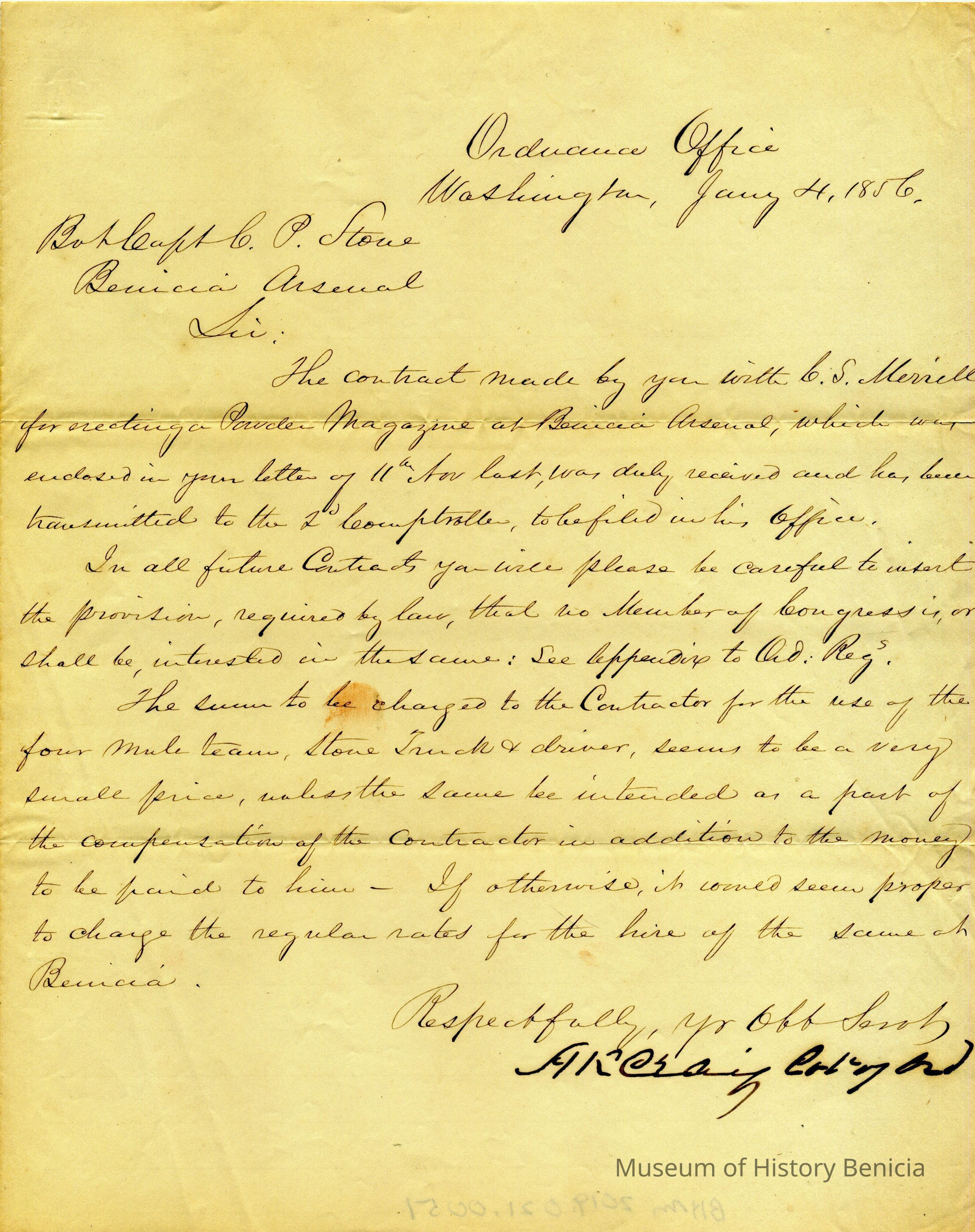This letter from A.K. Craig, Colonel of Ordnance, to Captain Stone refers to a contract with Mr. Merrill for the stone and the construction of a Powder Magazine at Benicia Arsenal. The point is made that contracts should contain a provision that no member of Congress shall be interested in the contract. The other point is regarding the cost of using the four mule team truck and driver being too low.Collection