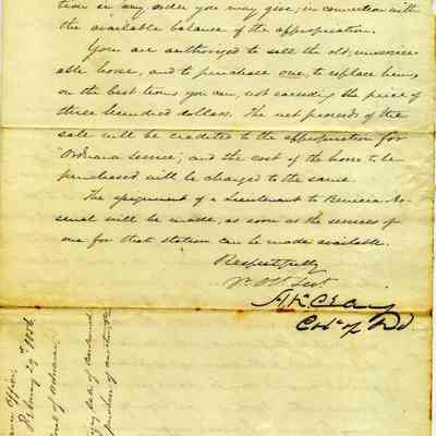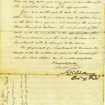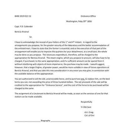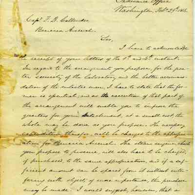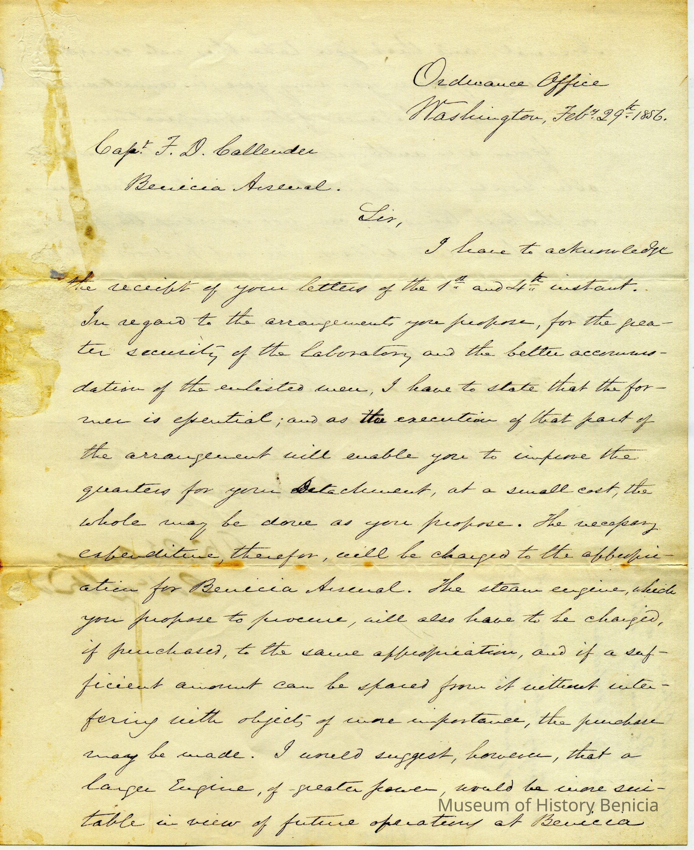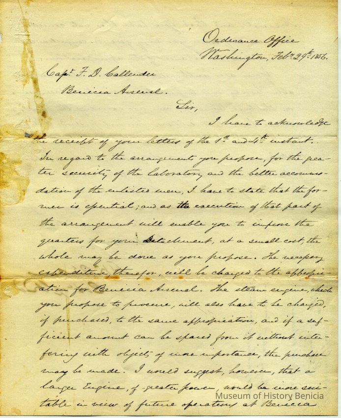 This letter is from the Colonel of Ordnance to Captain Callender in Benicia. He is approving construction plans from Callender to secure the laboratory and to better house the enlisted men. This is approved as well as the purchase of a larger steam engine than proposed and replacement of a horse.