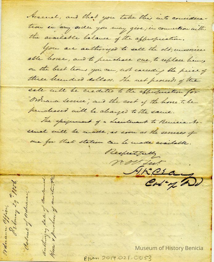 The last line talks of assigning a Lieutenant to Benicia Arsenal when one is available.Collection