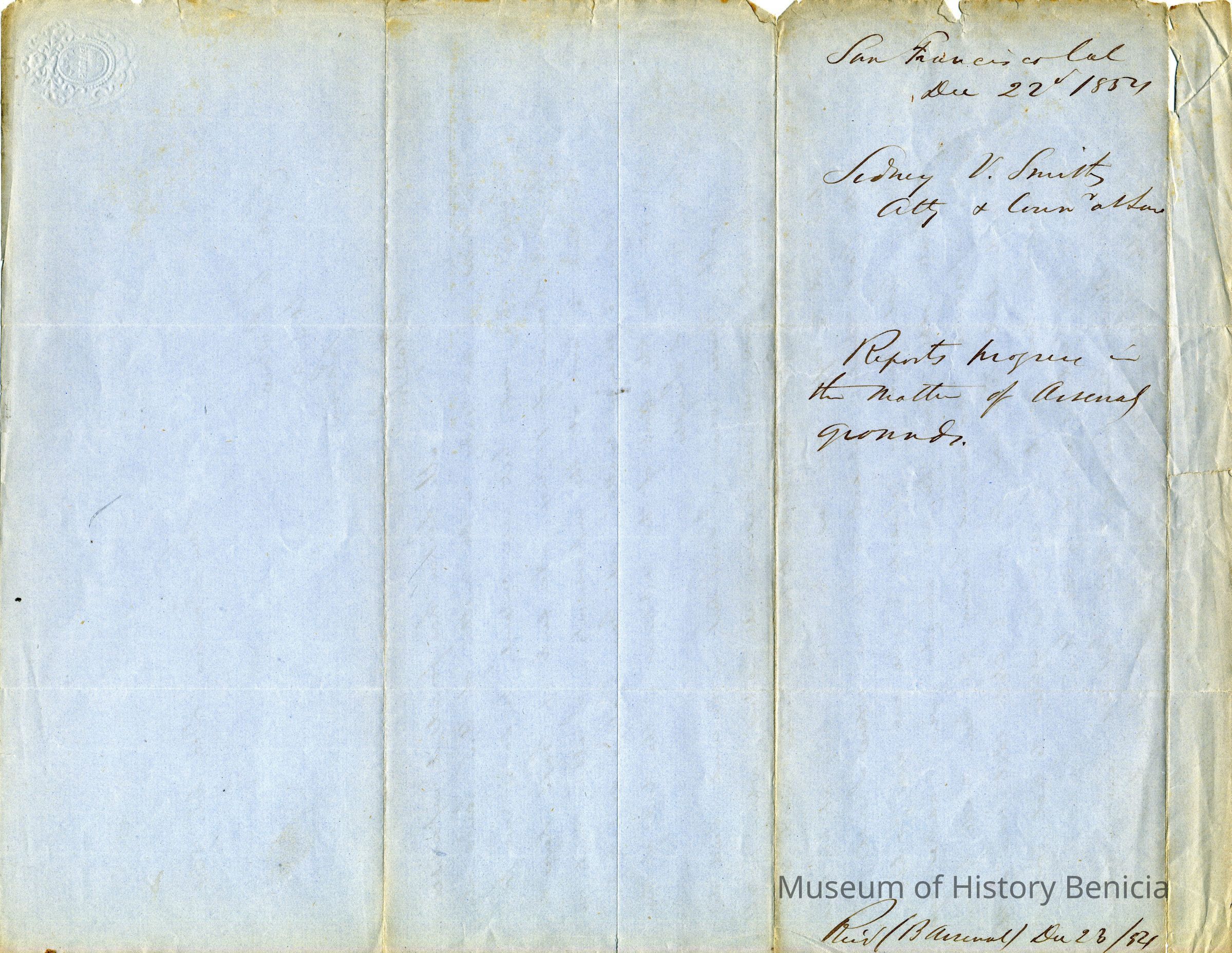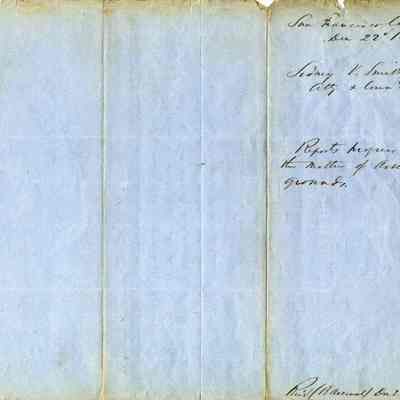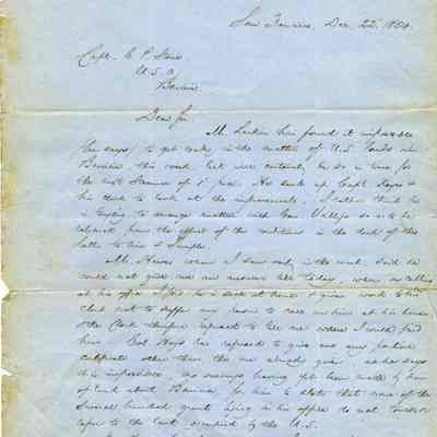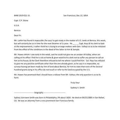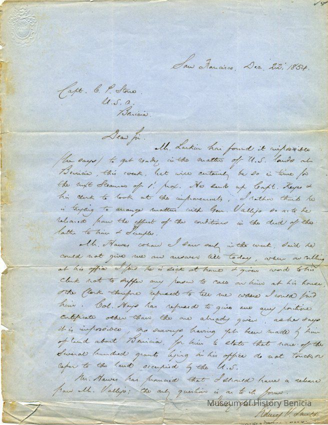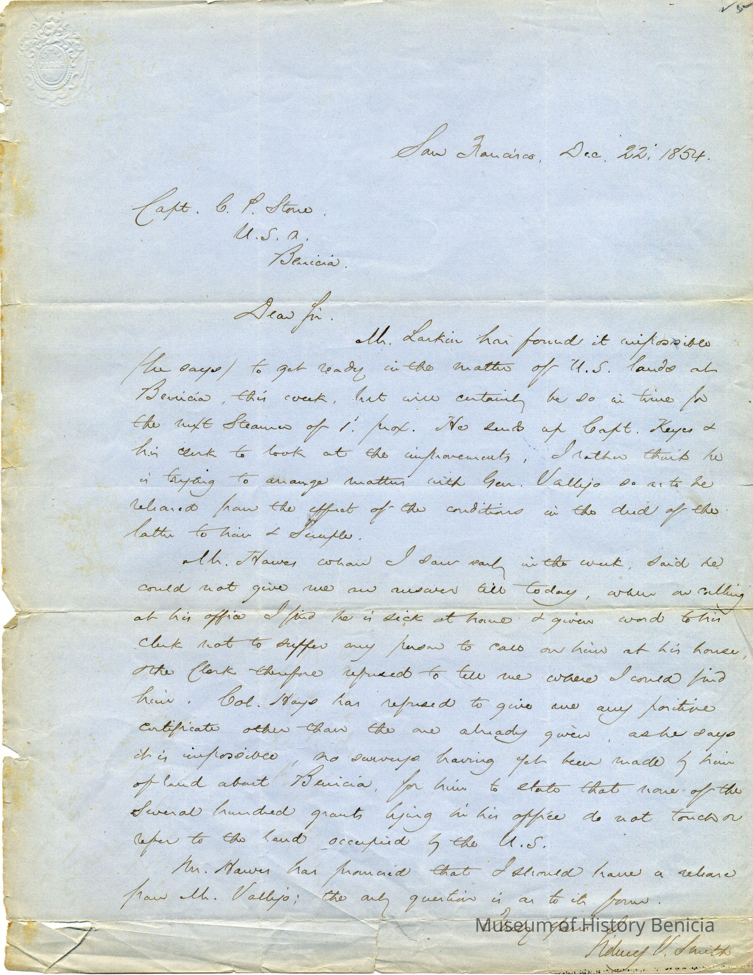 This is a letter dated 12/22/1854 from attorney Sydney Smith to Captain Charles P. Stone telling him of the progress he has made in getting the Government's deed straightened out with Mr. Larkin, the Land Commission, General Vallejo, and others.Collection