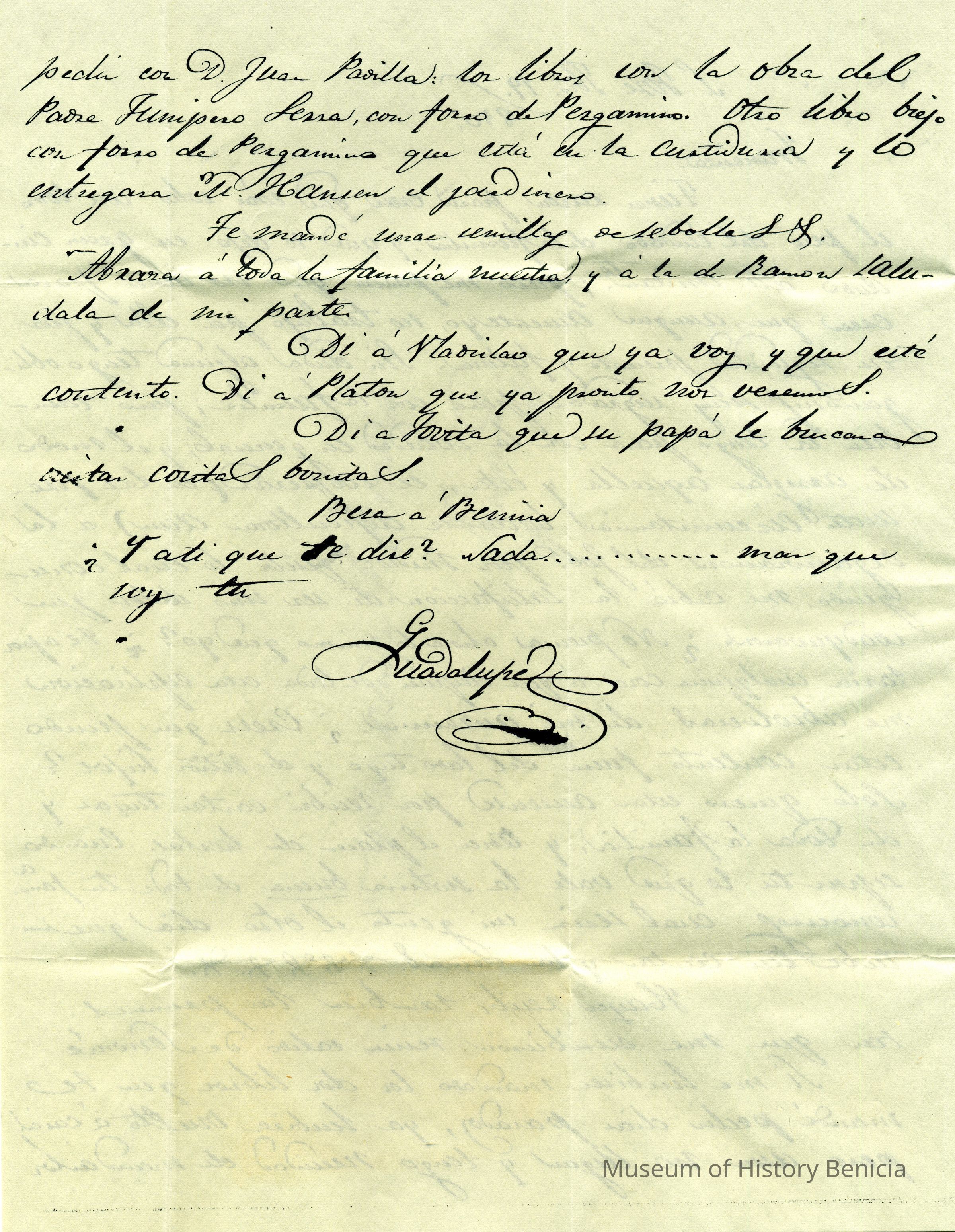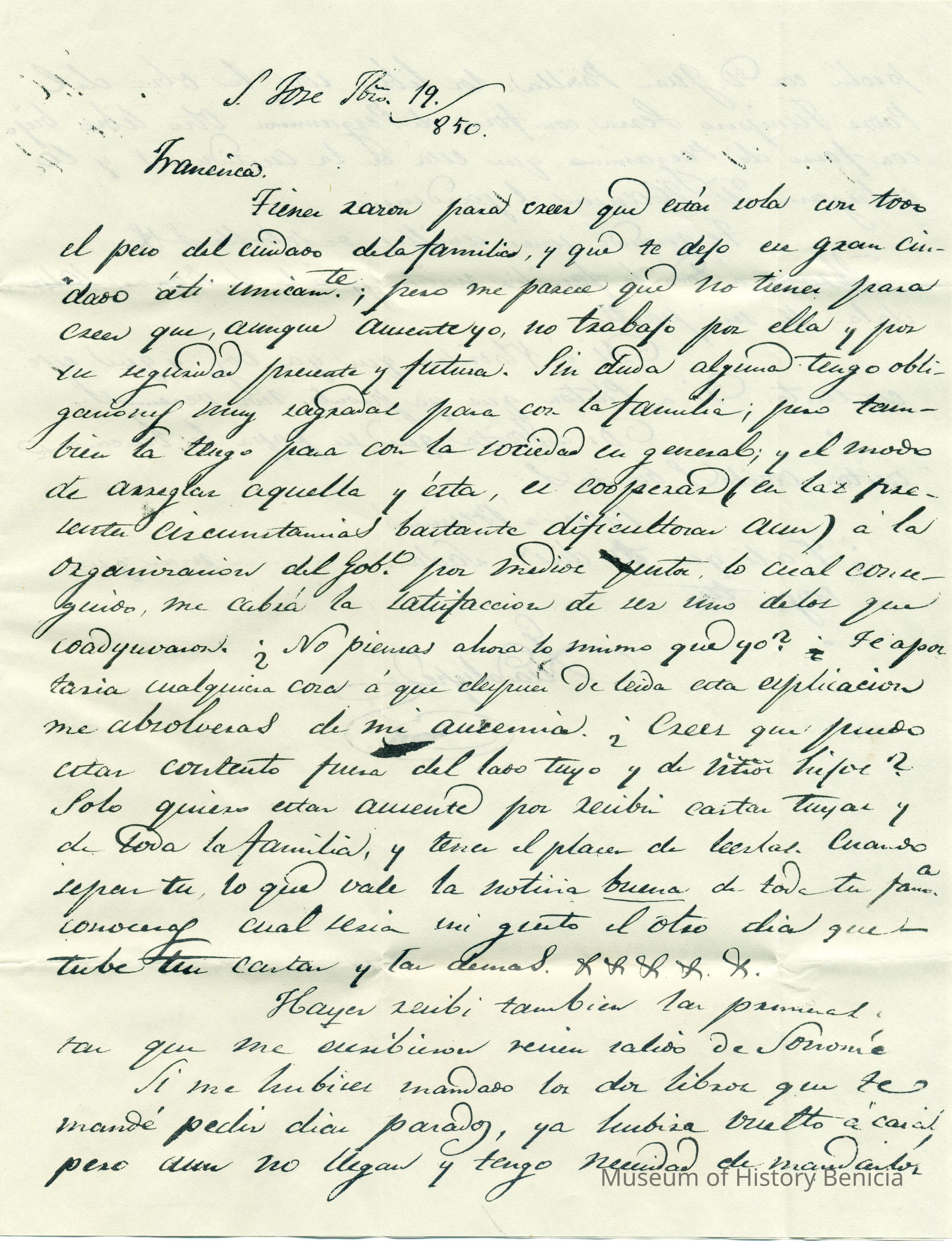 This is a copy(?) of a letter from Guadalupe to Dona Benicia F. de Vallejo in Sonoma dated 1850. It is written in Spanish so I am not sure what the contents may be.Collection