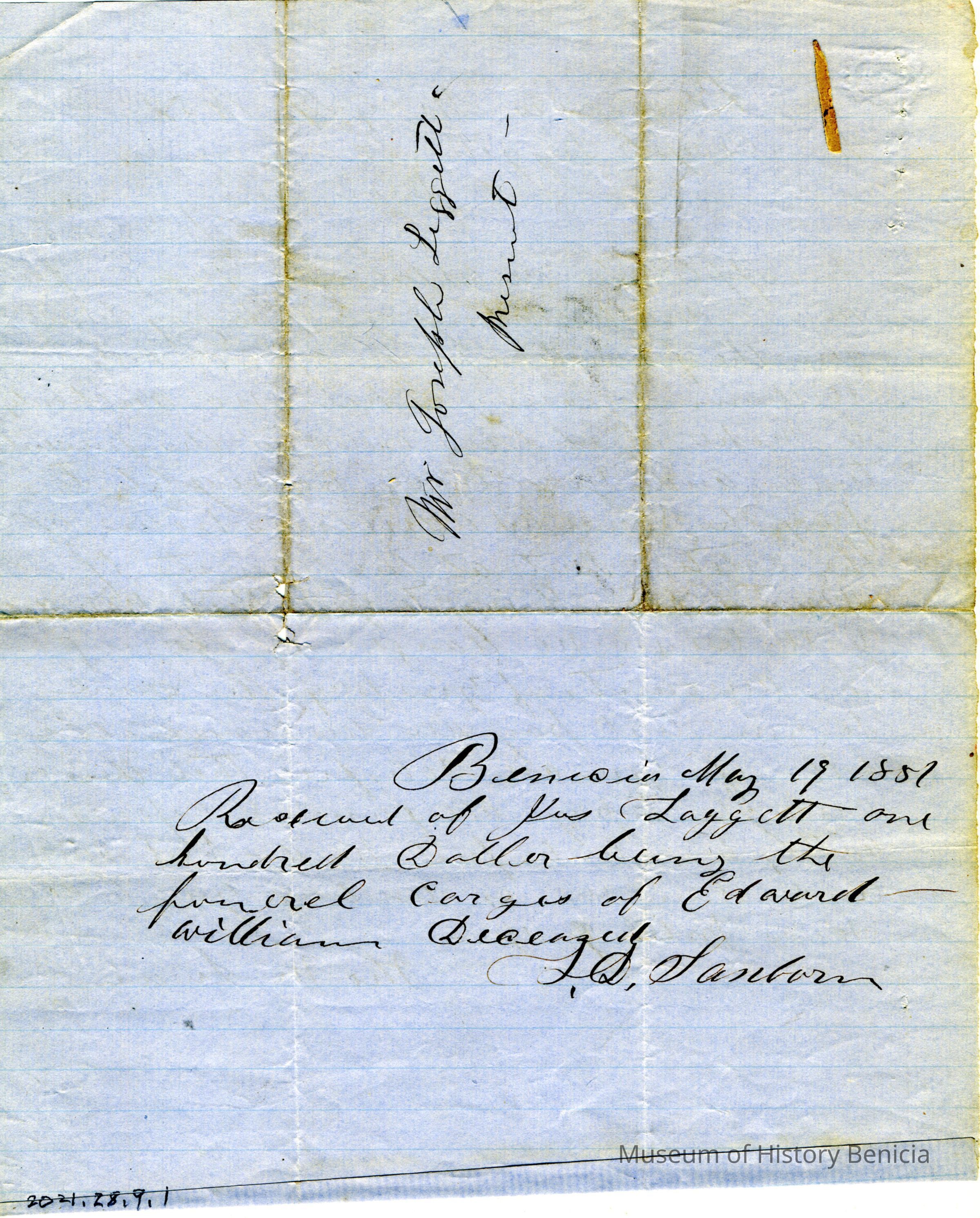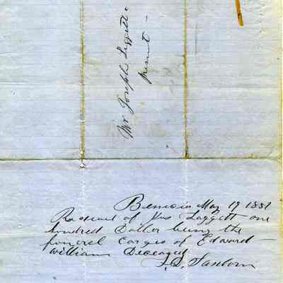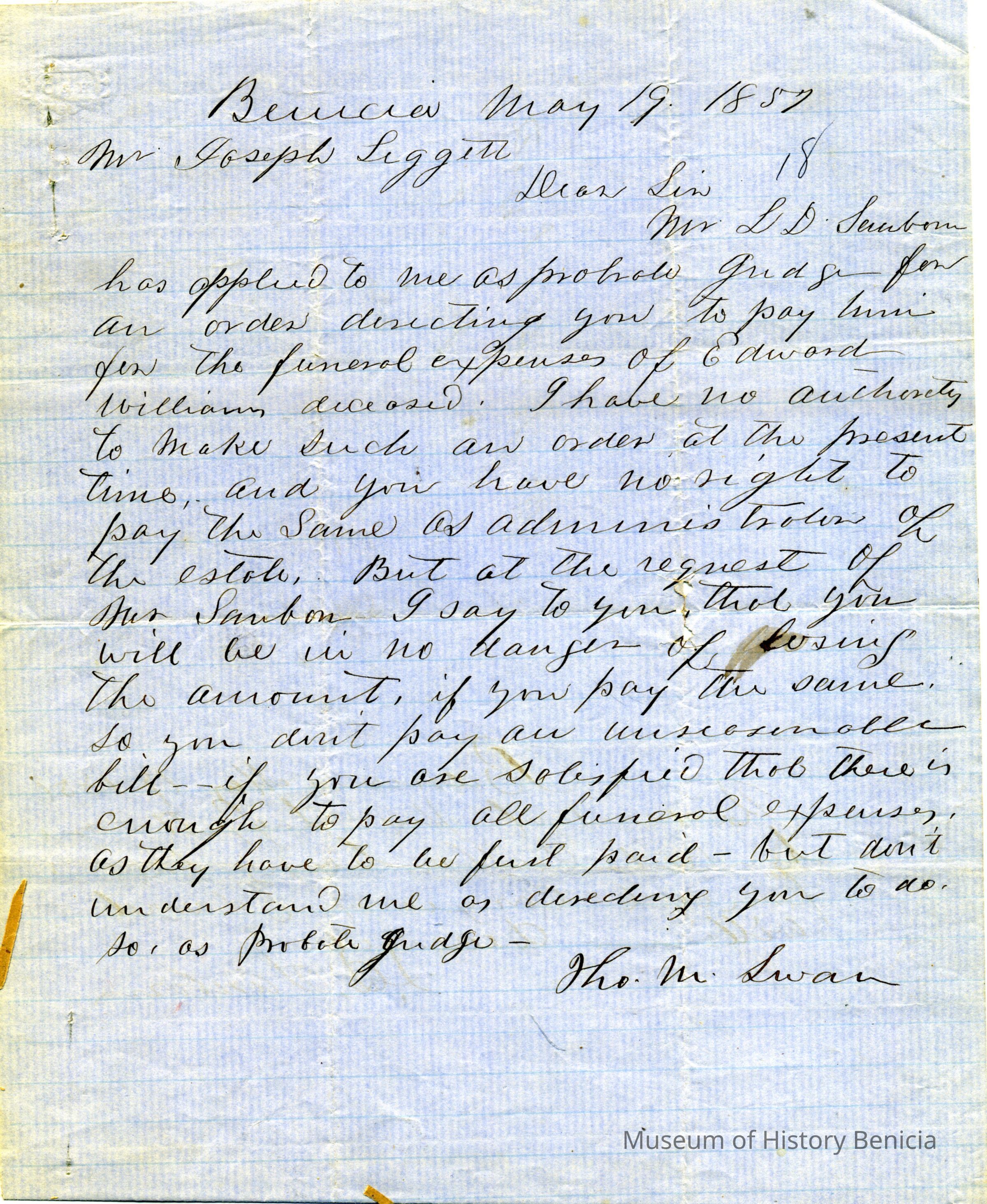 Letter dated 05/17/1857 from Tho. M Swan, Probate Judge, to Mr. Joseph Leggett regarding the funeral expenses for Edward William deceased.