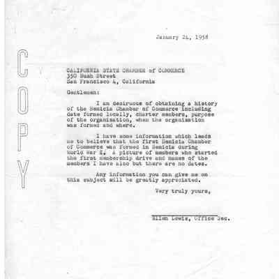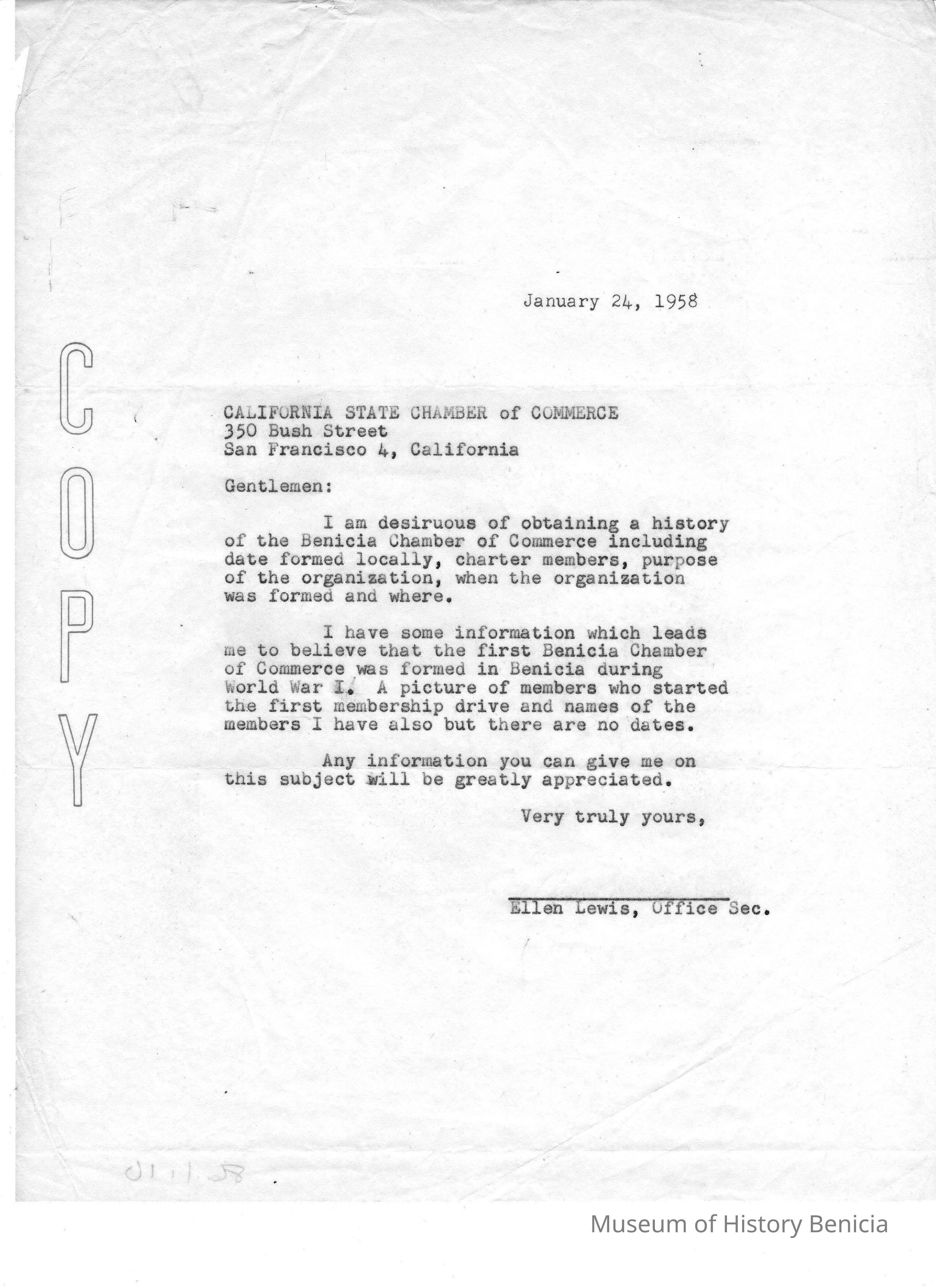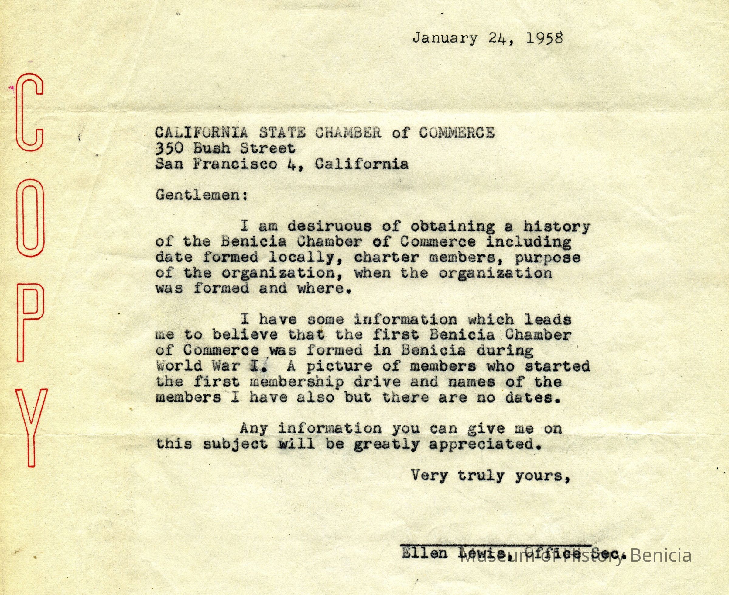 Copy on onion skin paper of a request from Ellen Lewis, Office Sec. for a history of the Benicia Chamber of Commerce. Dated Jan. 24, 1958. The request was sent to The California State Chamber of Commerce in San Francisco.