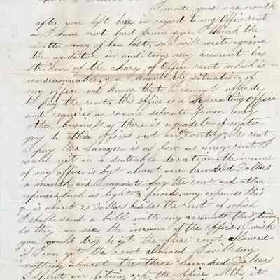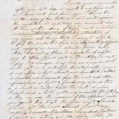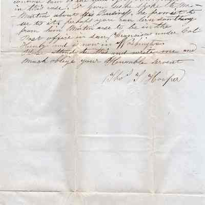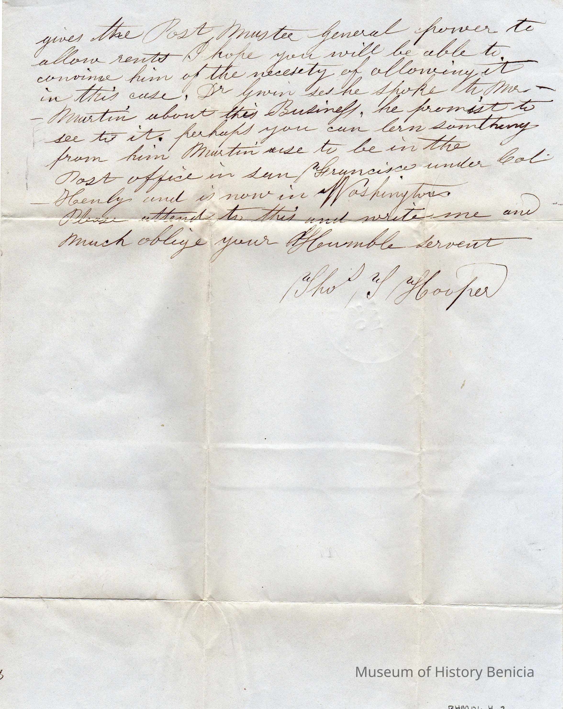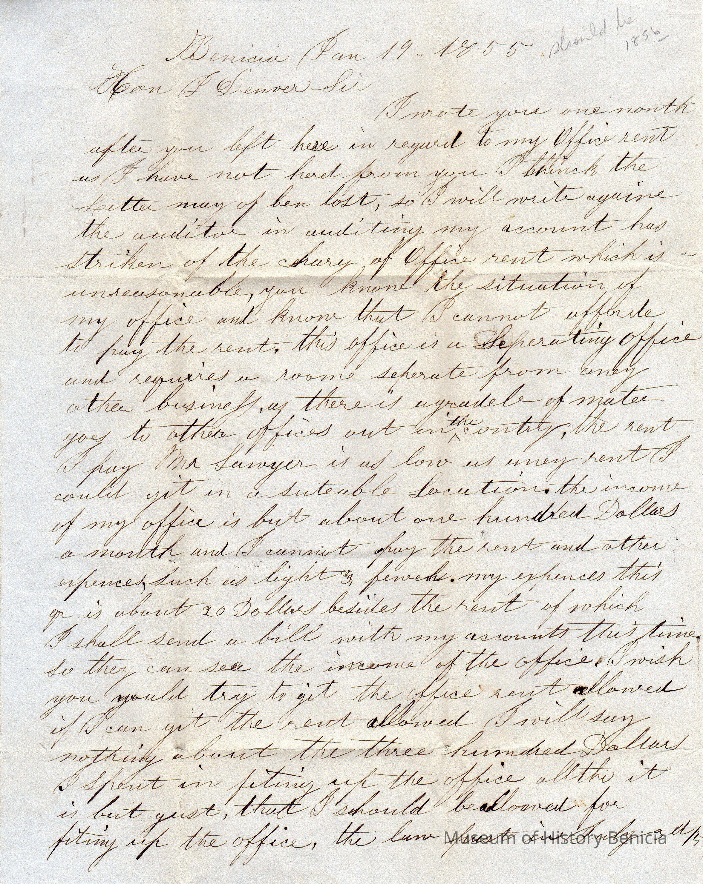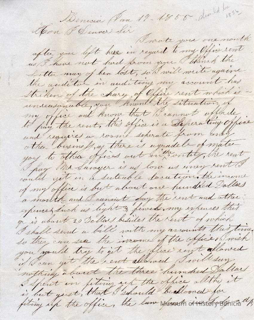 A letter written in Benicia and dated January 19, 1855. Written by Postmaster Thomas T. Hooper to Congressman John W. Denver in Washington D.C.