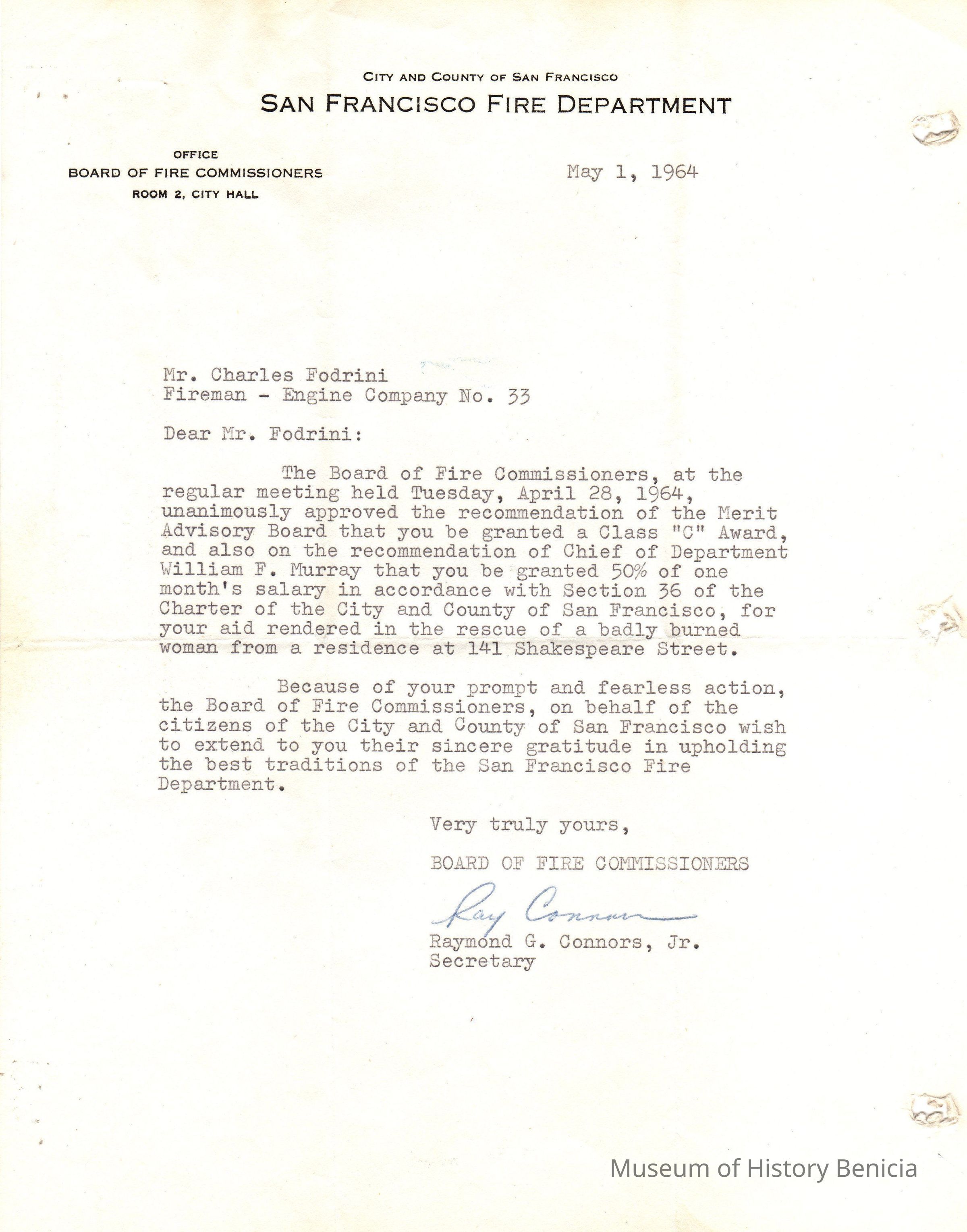 Letter of commendation to Charles Fodrini from the San Francisco Fire Department for his actions in rendering aid to a badly burned woman
