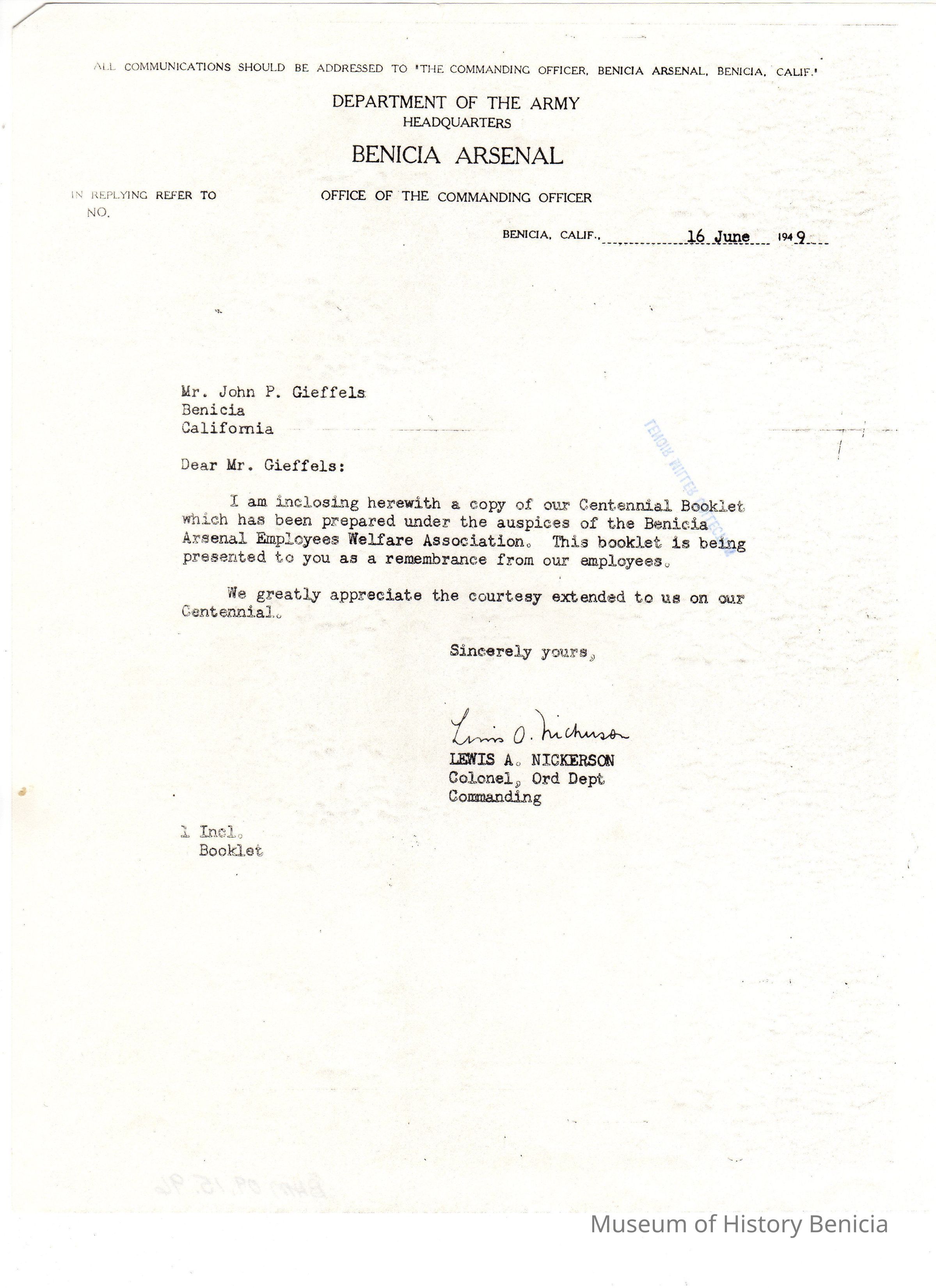 Letter dated 16 June 1949 from Col. Lewis Nickerson of Benicia Arsenal to Mr. John Gieffels; it accompanied a copy of the Arsenal Centennial Booklet 1849 - 1949