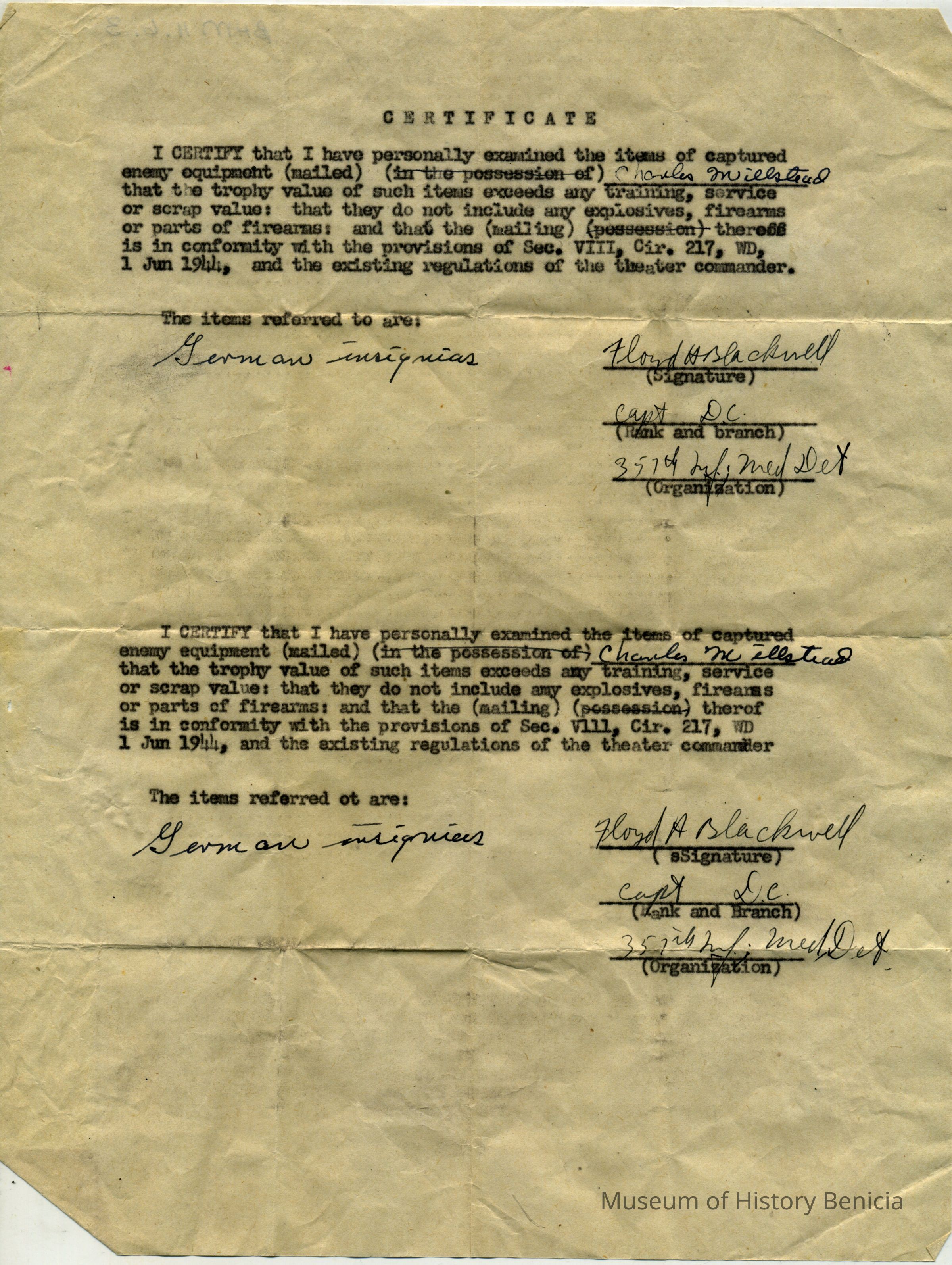 Letter of Certification (duplicated on one sheet) to allow Lt. Charles W. Millstead to mail/send to Dave Leedy some Nazi insignia (5) as "Captured Enemy Military Equipment" signed by a ranking officer (Capt.Floyd Blackwell) no date specified but approximately June/July of 1945 (same general time as the Nazi Flag was mailed)