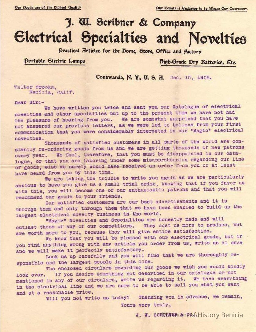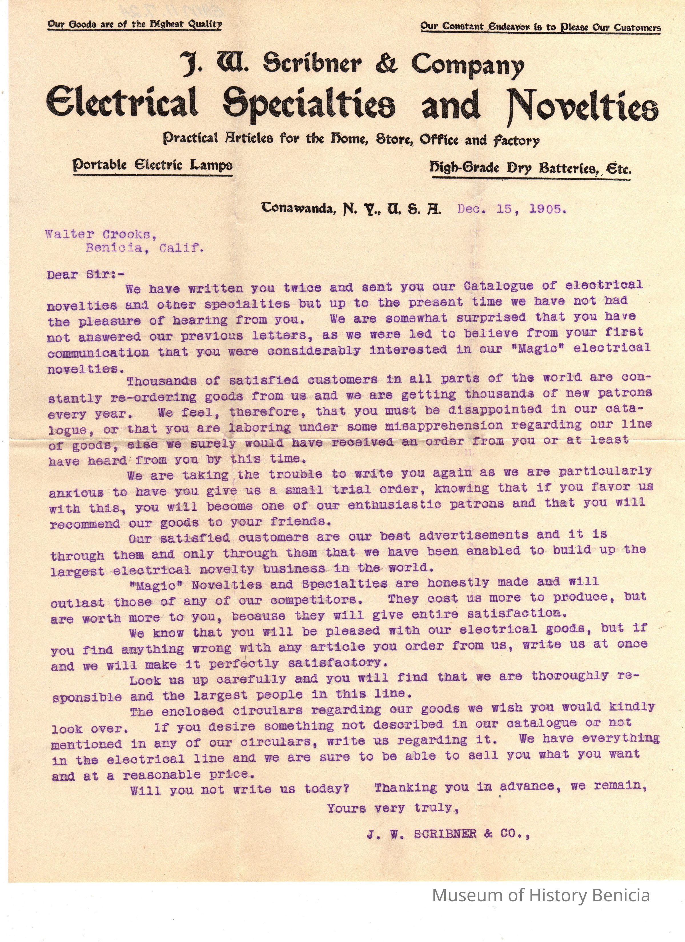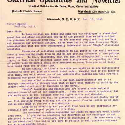 Letter sent to Walter Crooks from J. W. Scribner & Company Electrical Specialties and Novelties N.Y. USA