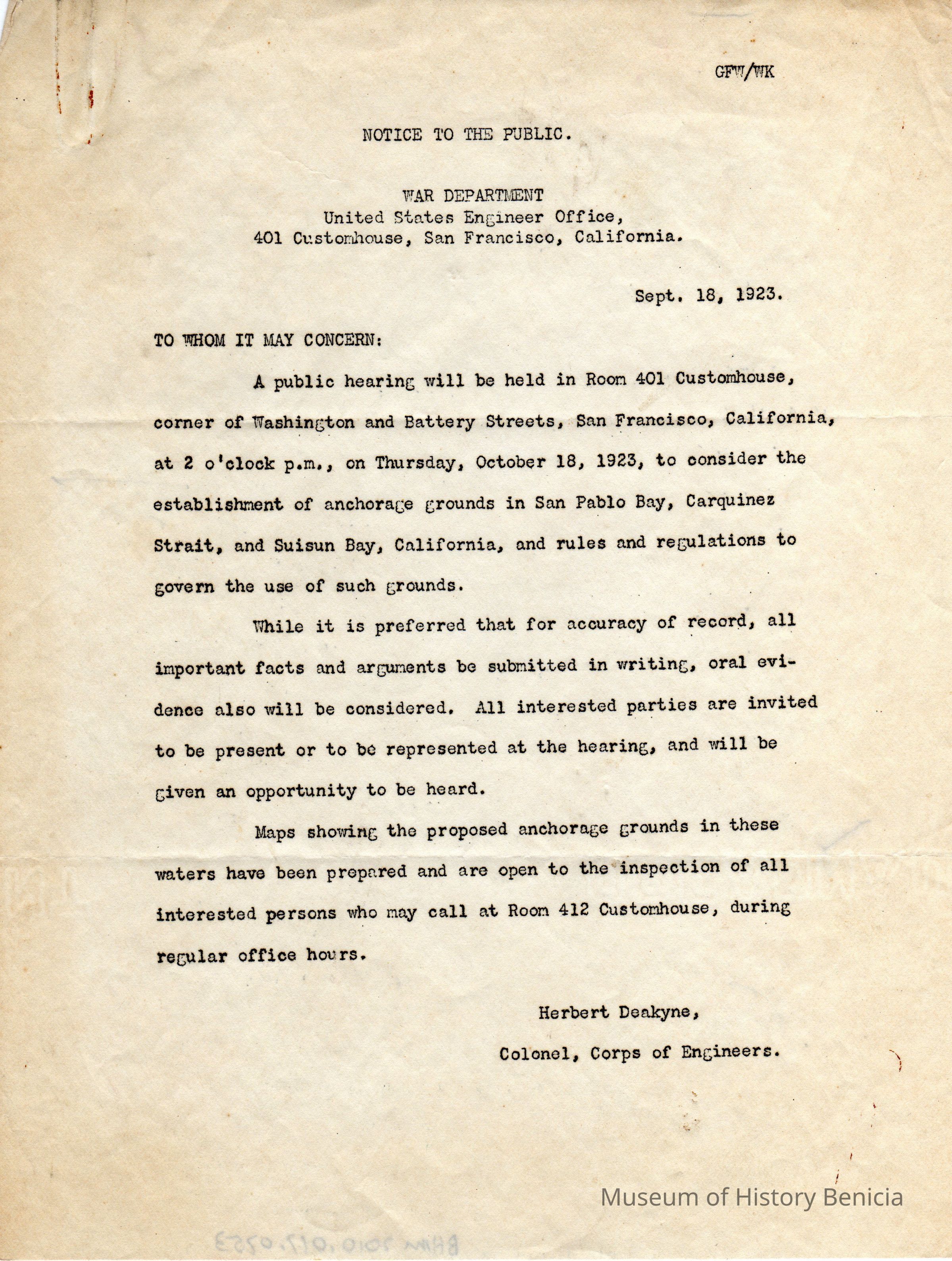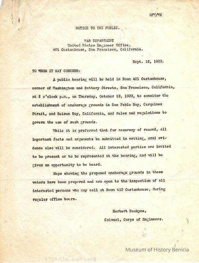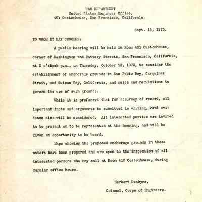 Public notice from the War Department re: a meeting 10/18/1923 about anchorage grounds in San Pablo Bay. Signed by Herbert Deakyne, Col Corps of Engineers.Collection