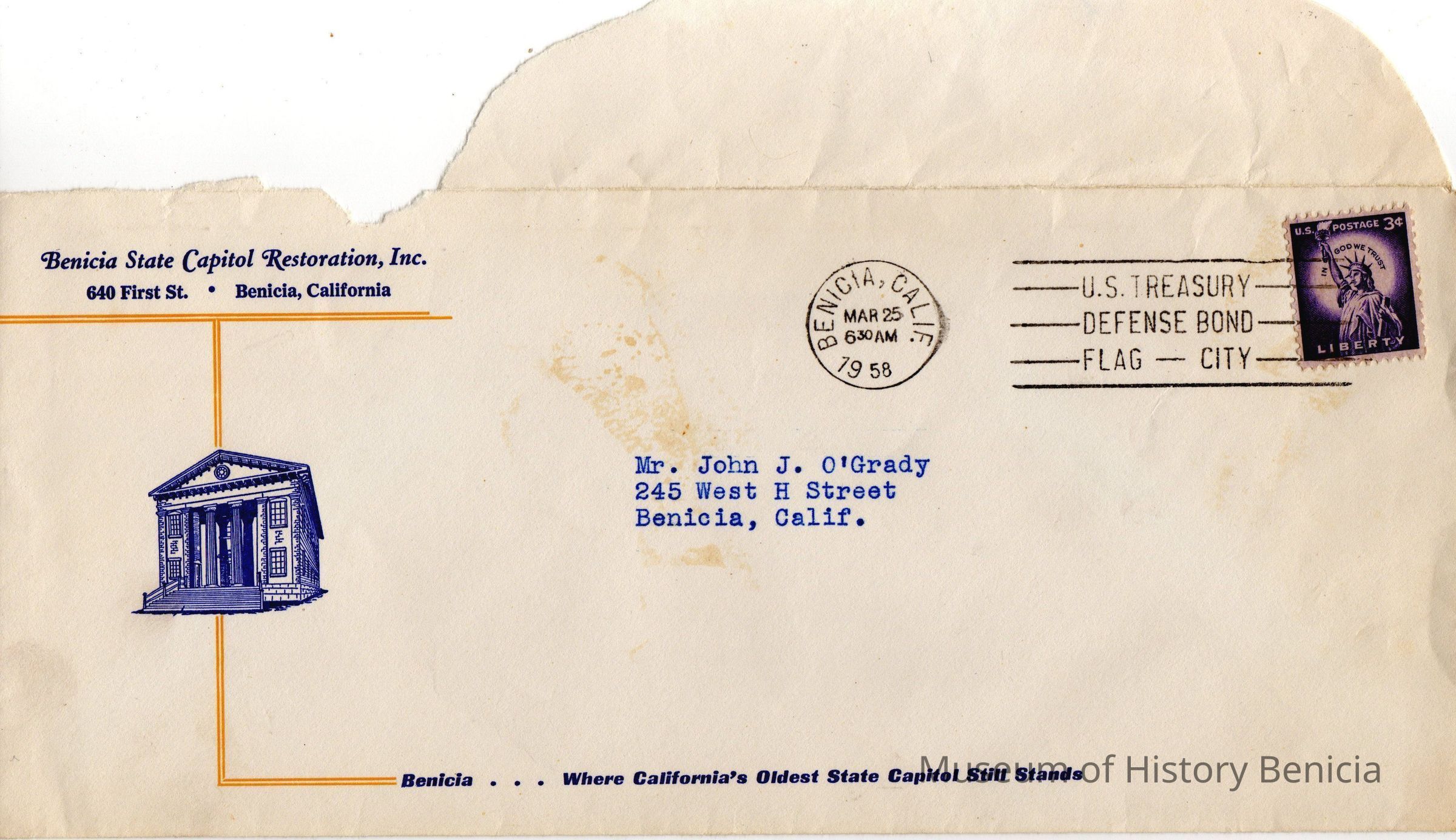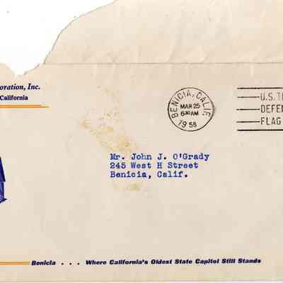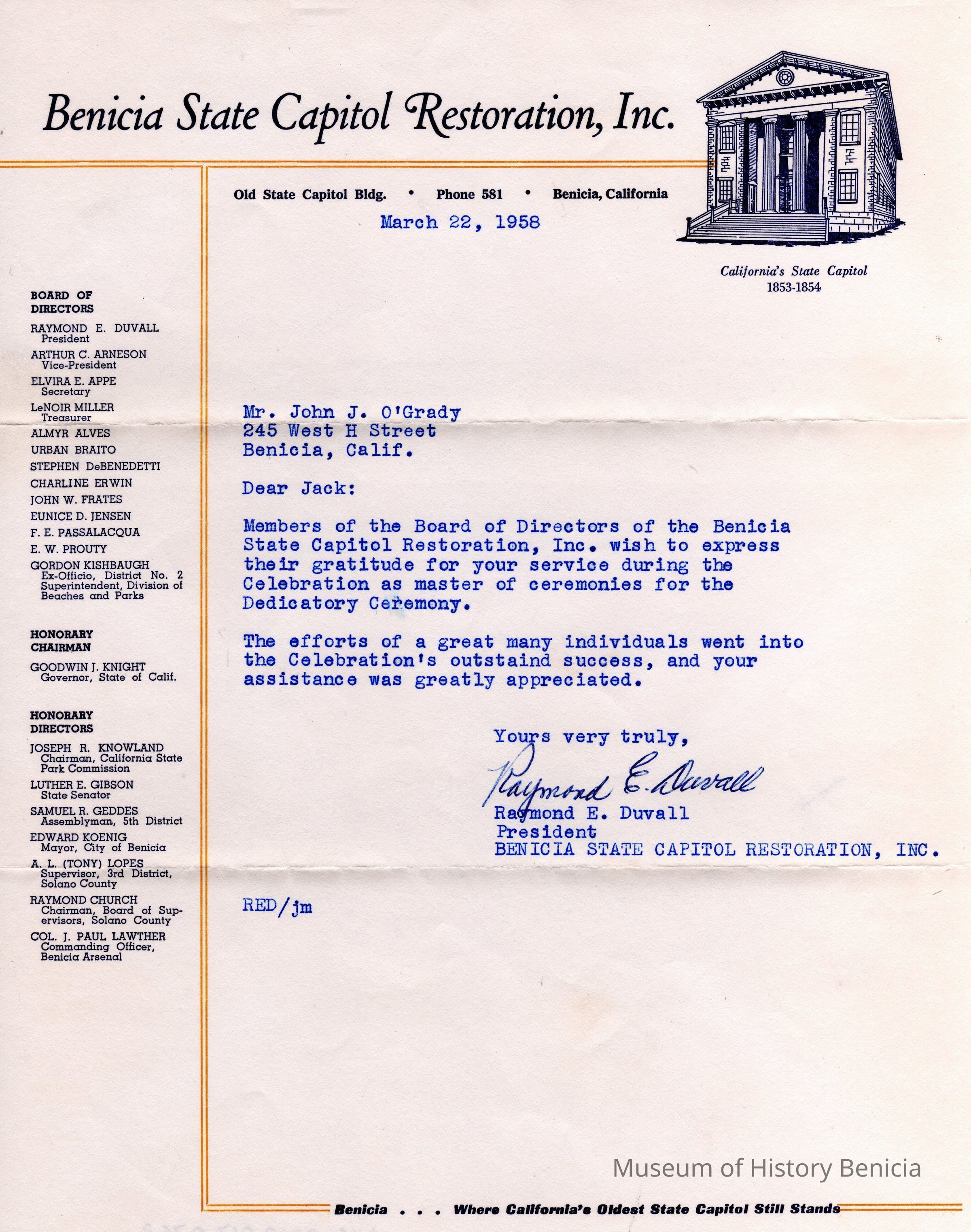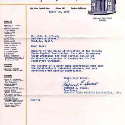 Letter from Raymond E Duvall President of the Benicia State Capitol Restoration, Inc to John O'Grady thanking him for being the master of ceremonies at the re-opening of the capitol in 1958.Collection
