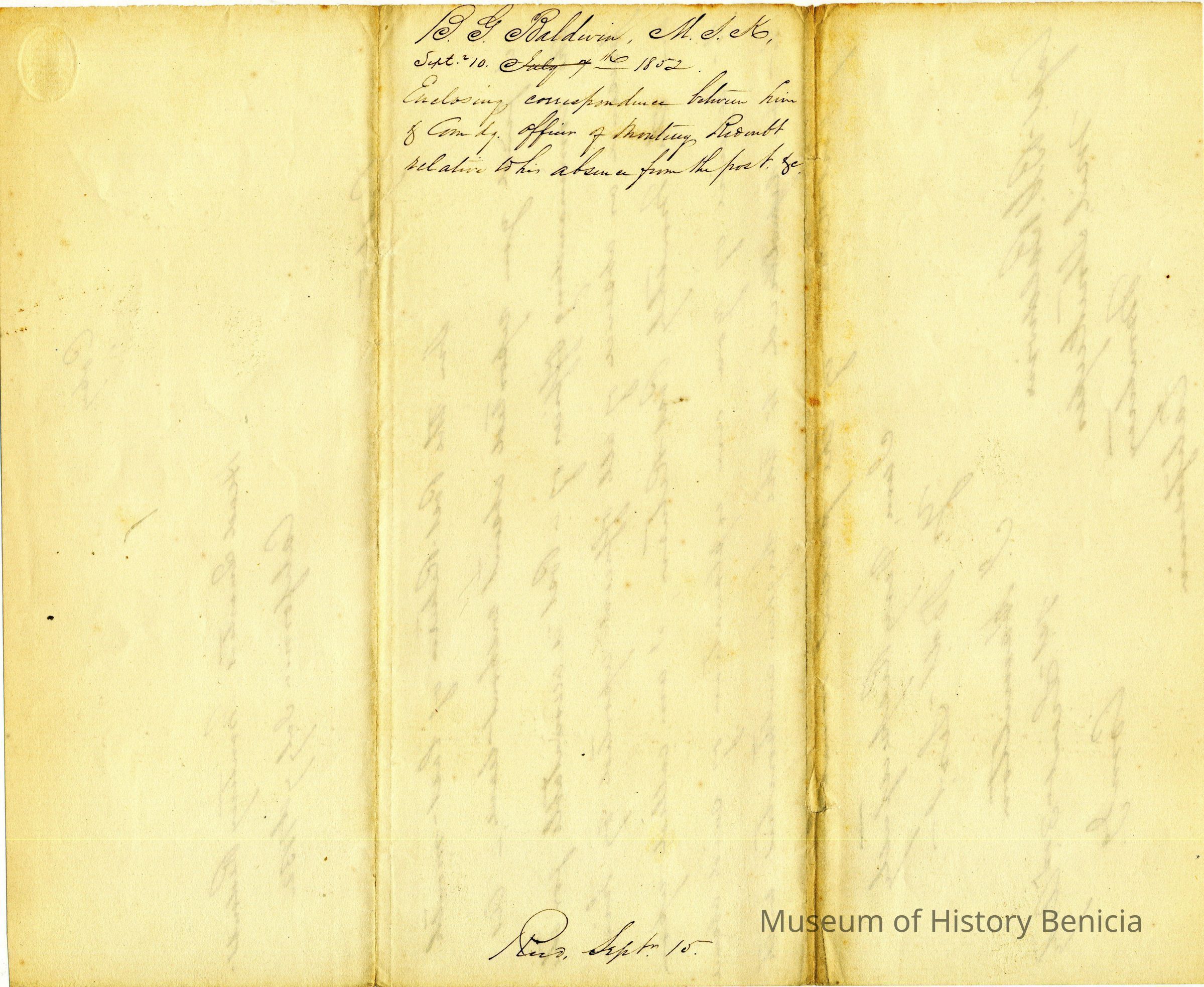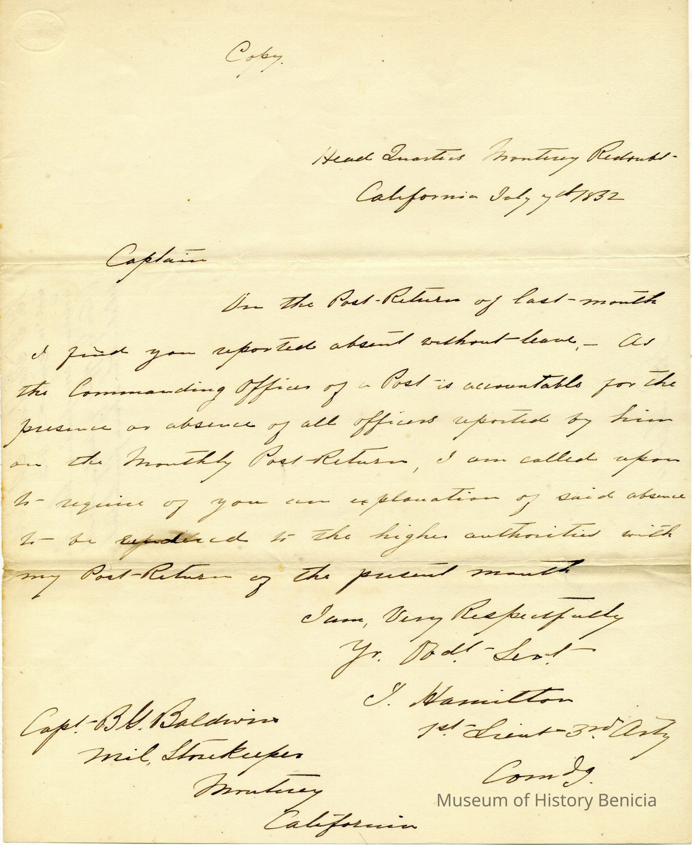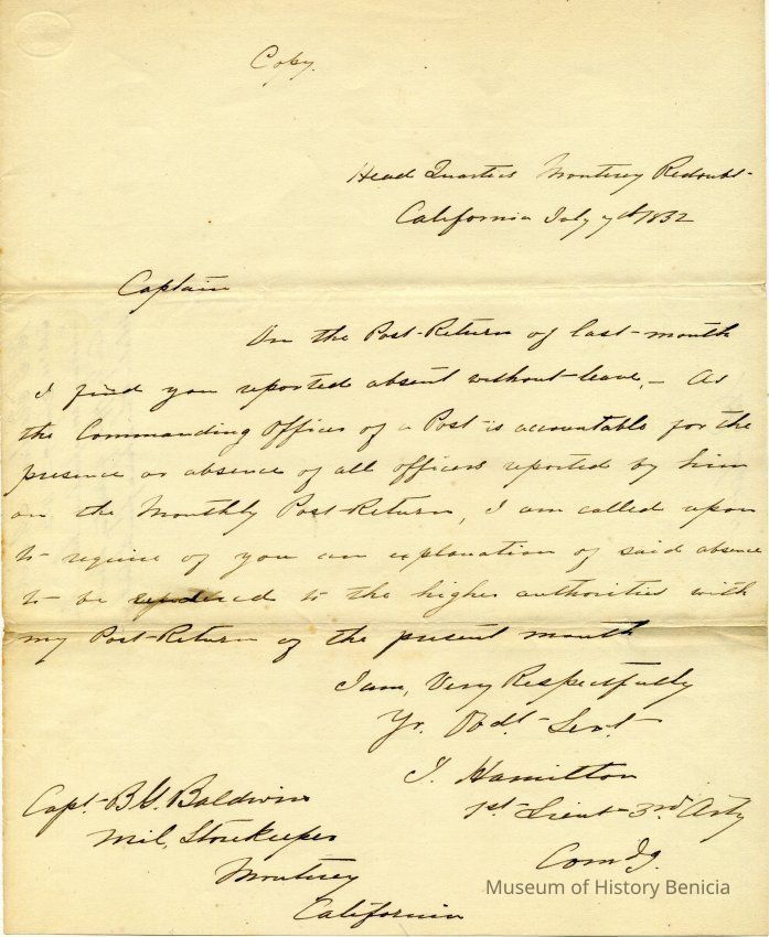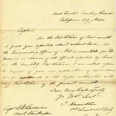 This is a letter from the commander of the Monterey Redoubt to the Ordnance Officer stationed in Monterey. He requests to know why the Ordnance officer was reported AWOL. This is the start of a series of letters around the question of whether the Ordnance Office must submit to the control of the local commander or whether they are part of the Ordnance Department and exempt from rules of the local commander.Collection