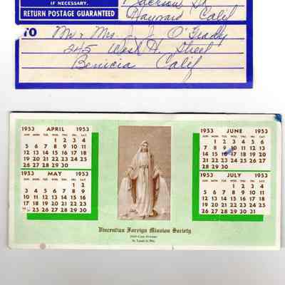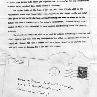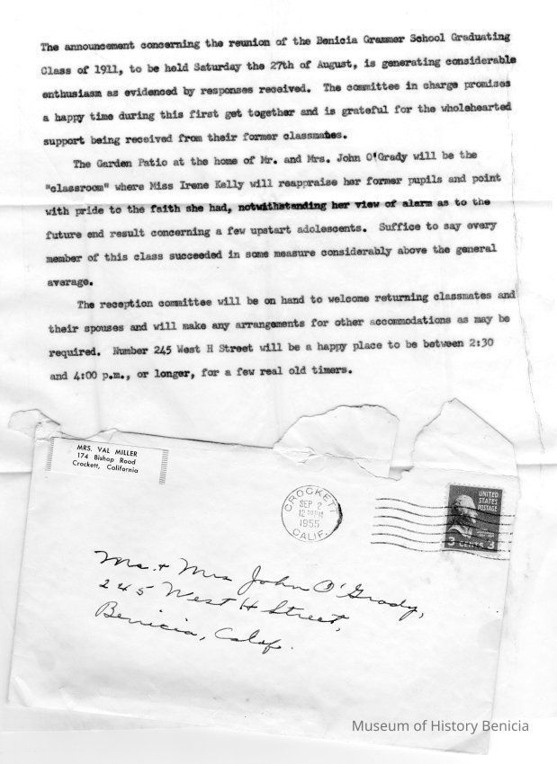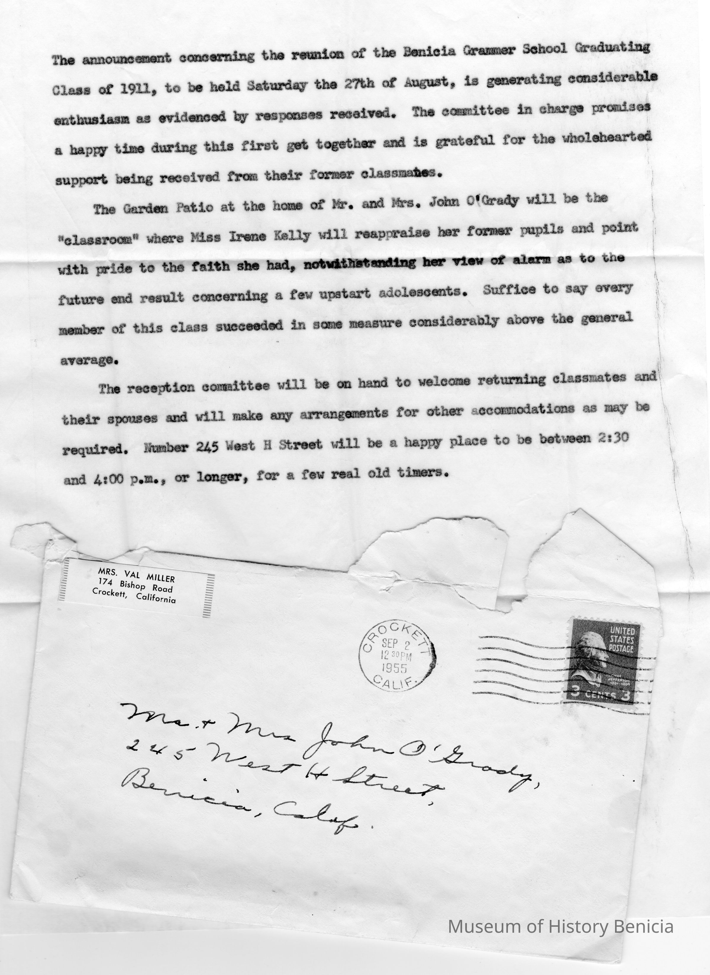 Envelope from Mrs Val Miller of Crockett to Mr & Mrs John O'Grady. Postmarked 09/02/1955. This is probably the woman that Mable talks about having called while at the class reunion. The envelope contains various items:
