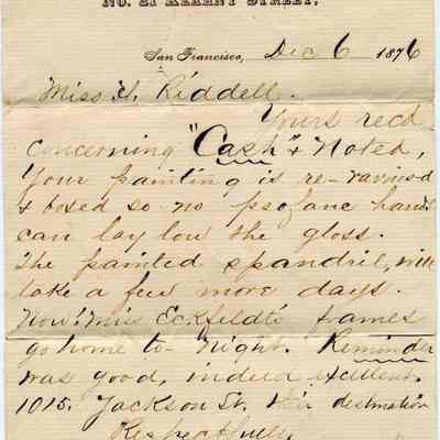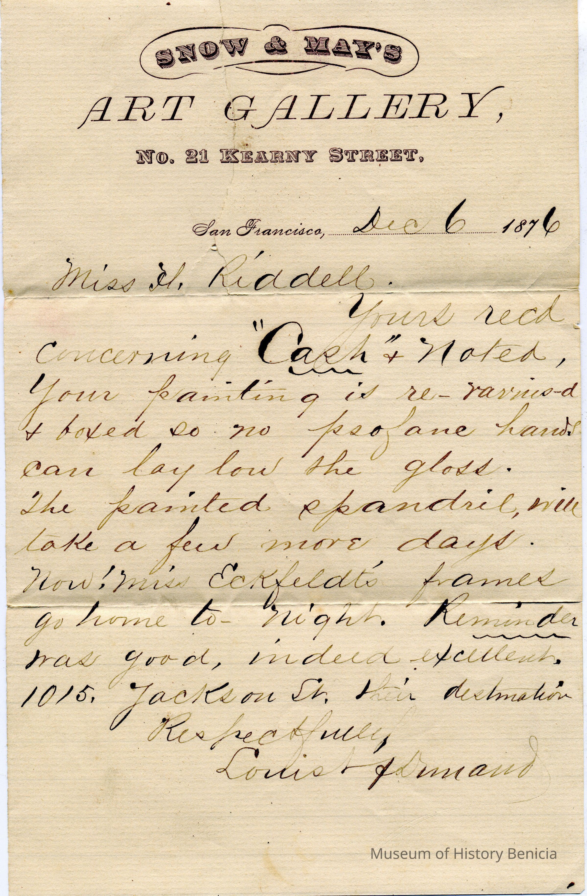 Letter dated 12/6/1876 from Snow & May's Art Gallery (No 21 Kearny St, SF, CA) to Miss Riddell. It talks about revarnishing a painting and about Miss Eckfeldt's frames. It mentions an address 1015 Jackson St as their destination.