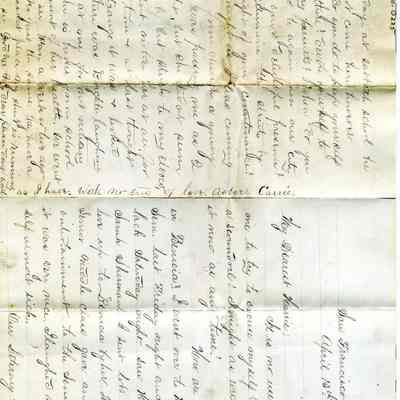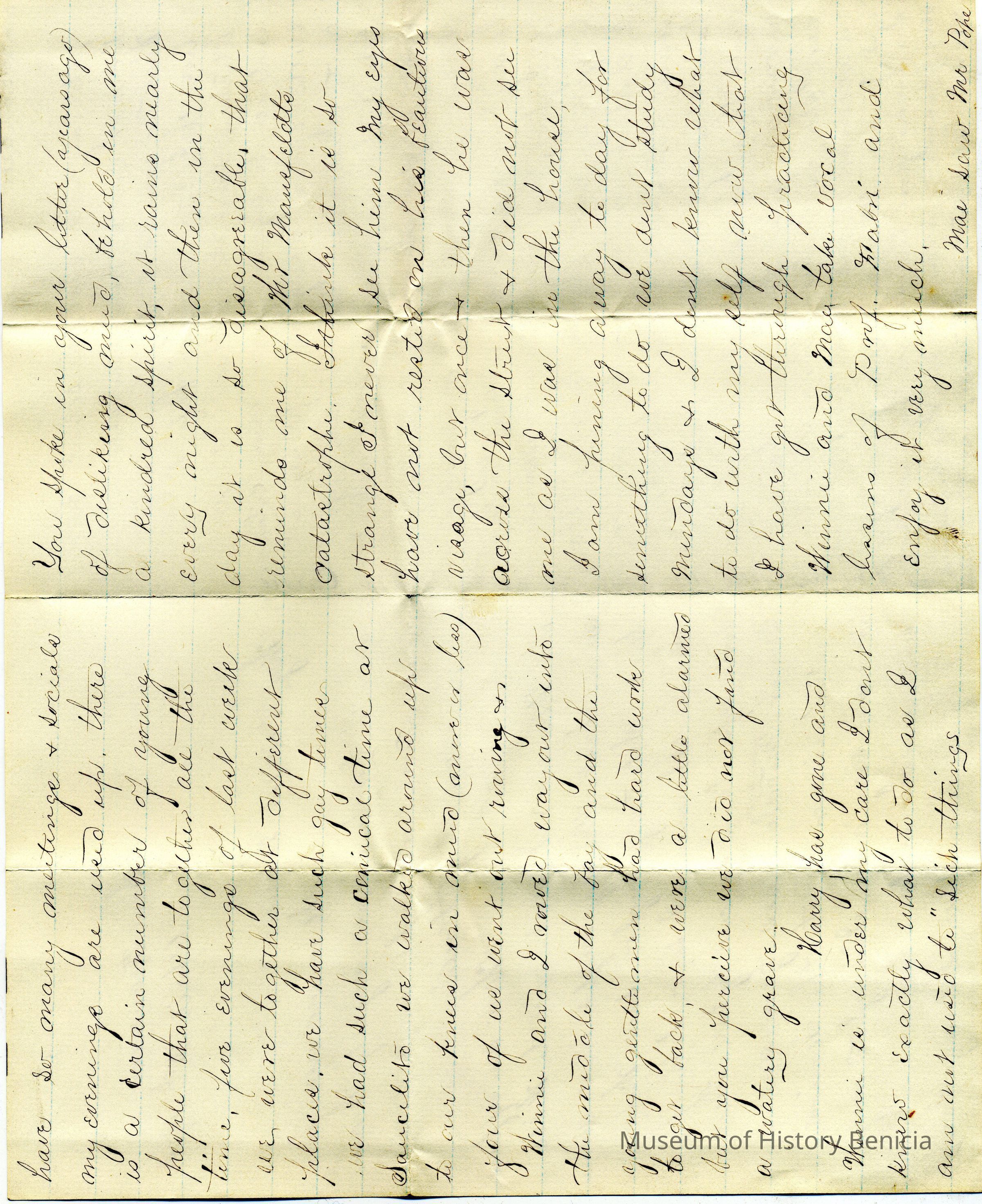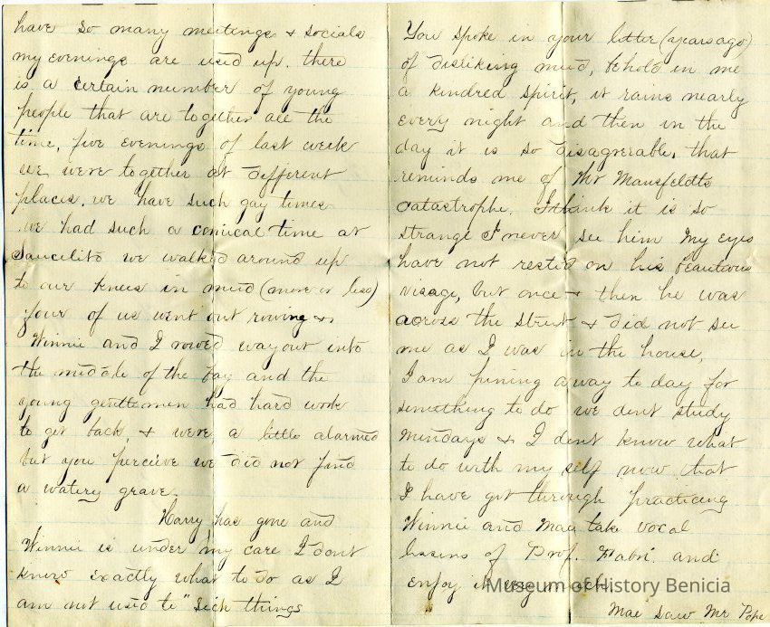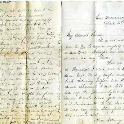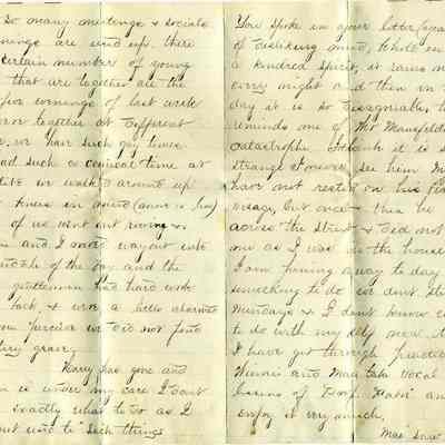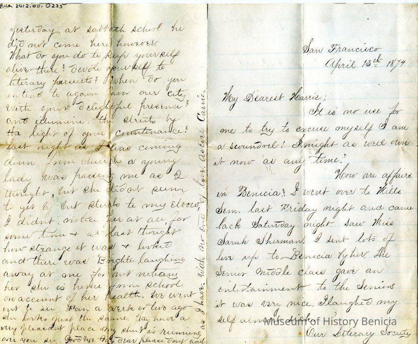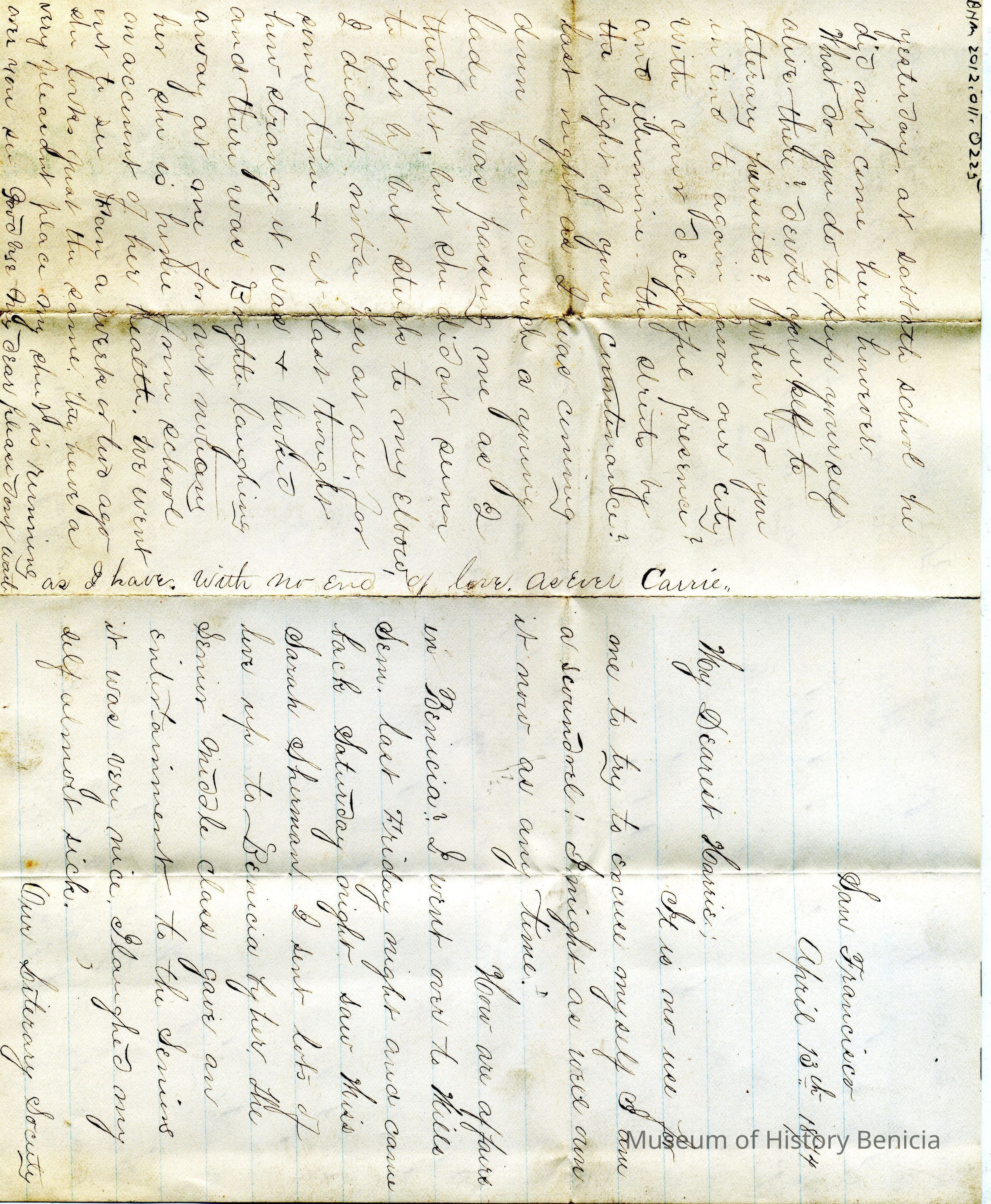 A letter dated 04/13/1874 from someone named Carrie to "Harrie" (Henrietta Riddell). It talks about people they both know. Mentioned are Miss Sarah Sherman, Winnie, Harry, Mr Mausfeldt, May, Prof Fabri, Mr Pope, Brighter,Collection
