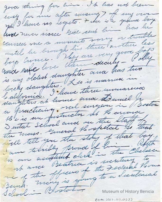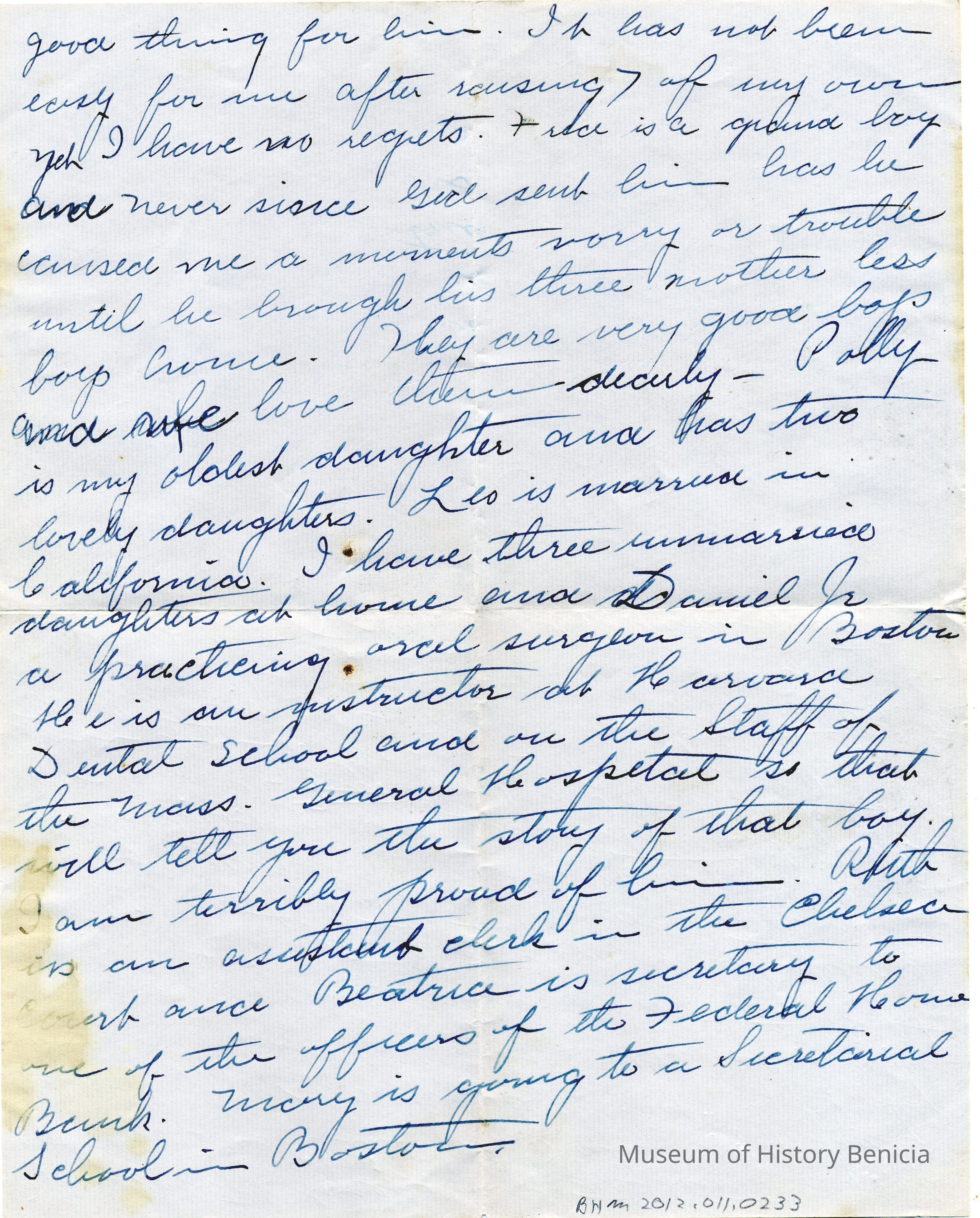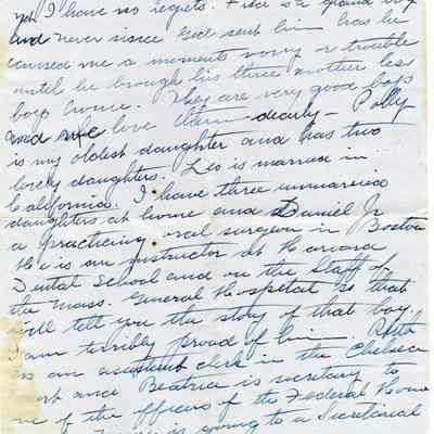 The writter mentions a man named Fred who's wife died in childbirth and left him with three small boys. The writer bought a bigger house and moved them in. The writter mentions her own children - Polly , Leo, two unmarried daughters at home, Daniel Jr (an oral surgeon), Ruth, Beatrice, Mary. She also mentions Gus, Arthur, and Geo., and MedfordCollection