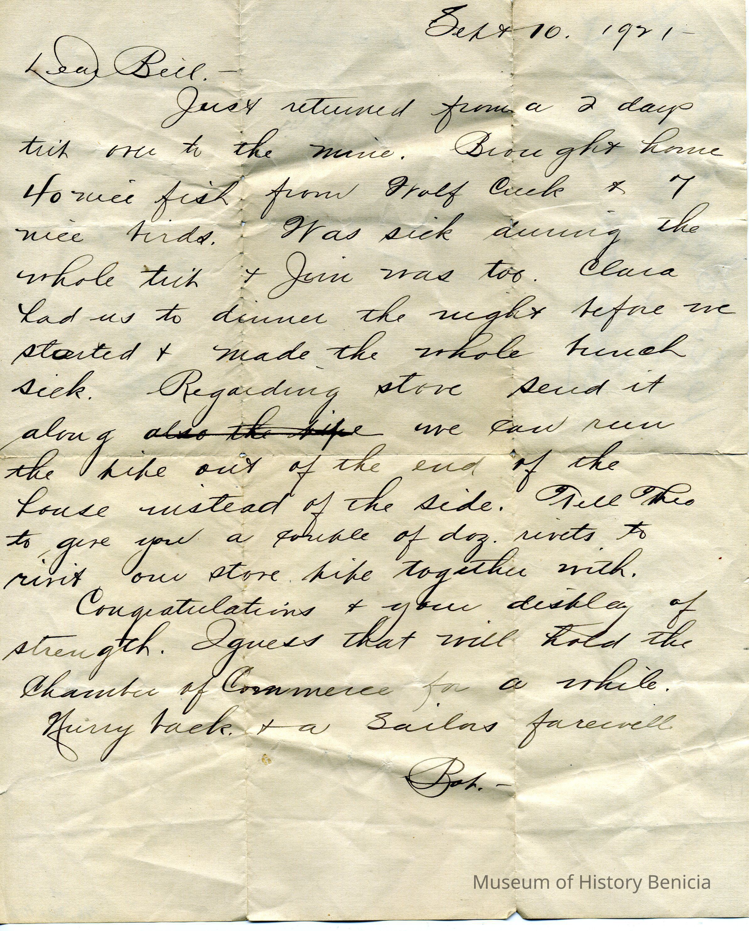 Just returned from a 2 days trip over to the mine. Brought home 40 nice fish from Wolf Creek + 7 nice birds. Was sick during the whole trip + Jim was too. Clara had us to dinner the night before we started + made the whole bunch sick. Regarding stove send it along we can run the pipe out of the end of the house instead of the side. Tell Theo to give you a couple of doz. rivets to rivit our stove pipe together with.