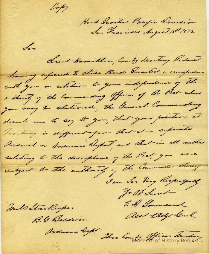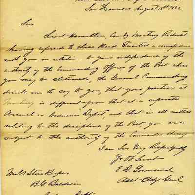 This letter is from the Commander Pacific Division regarding the question of Ordnance Storekeepers being under the Command of the Post Commander where they are stationed. It started when Ordnance Storekeeper Baldwin questioned Post Commander Talbott's authority over him.