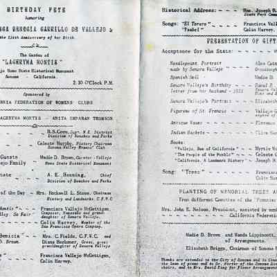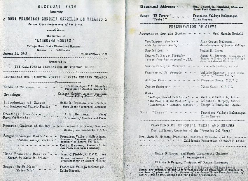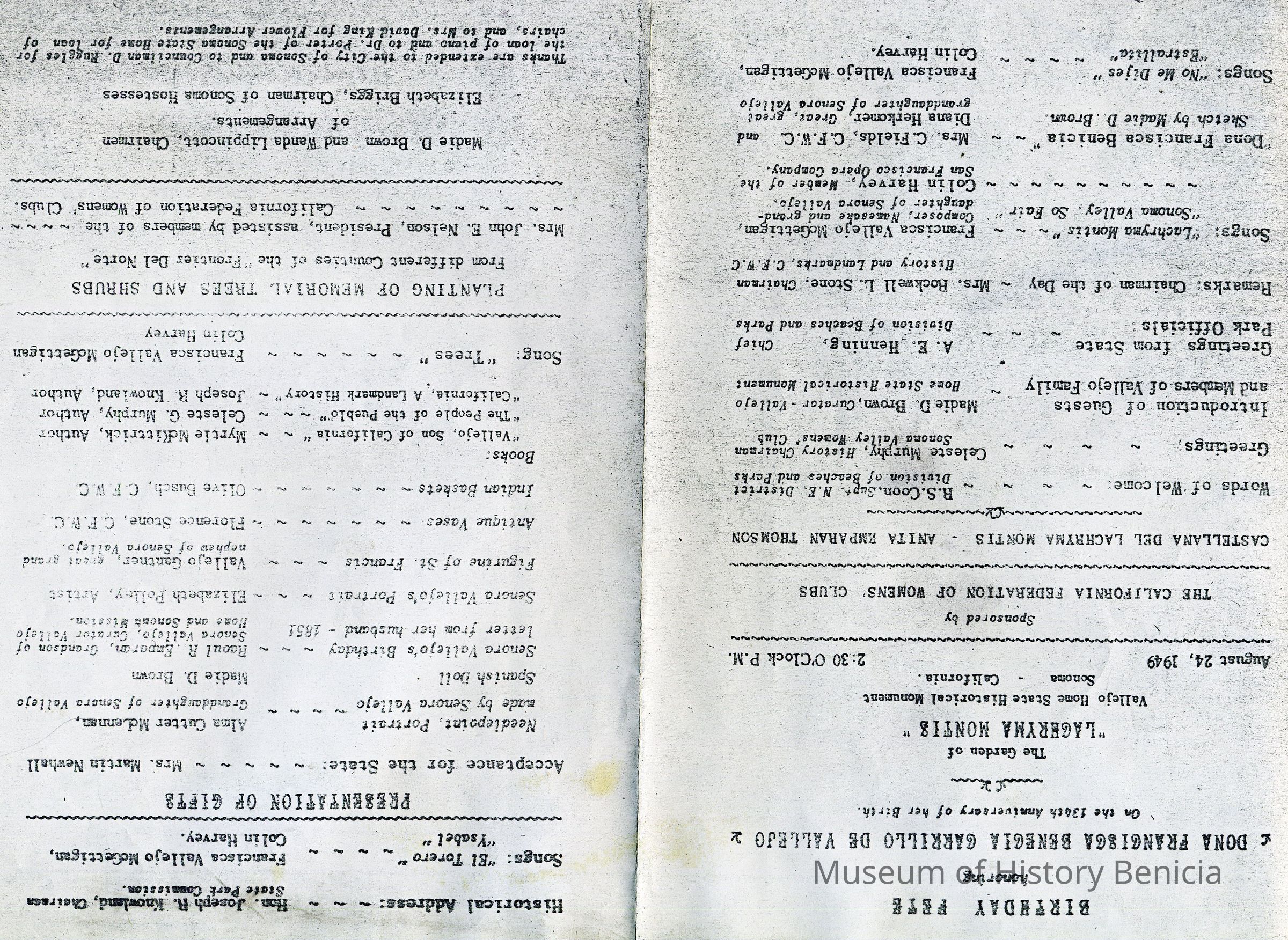 Copy of a program for the 08/24/1949 celebration of the 134th birthday of Dona Francisca Benicia Carrillo de Vallejo. It was sponsored by the Californi Federation of women's clubs.Collection