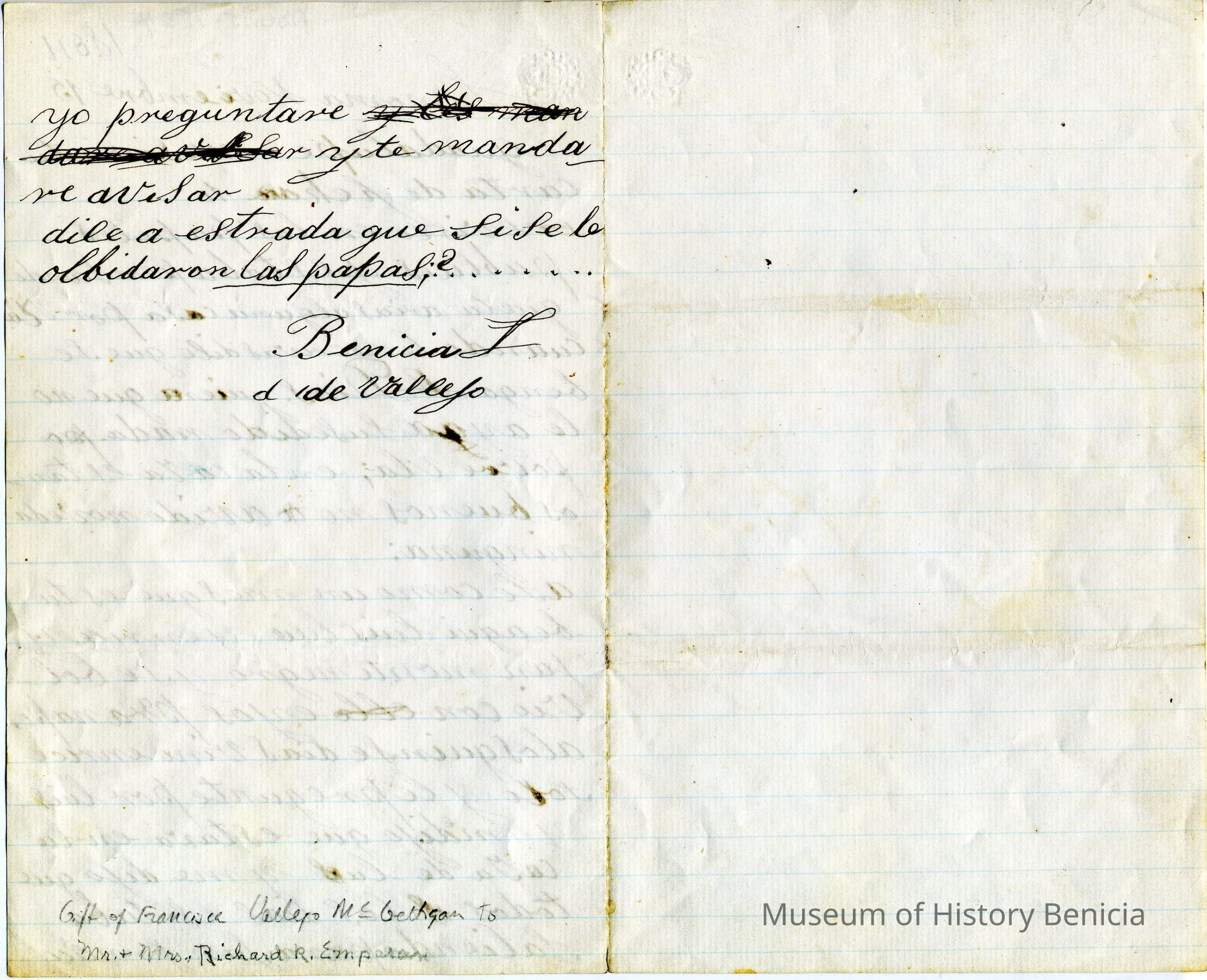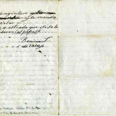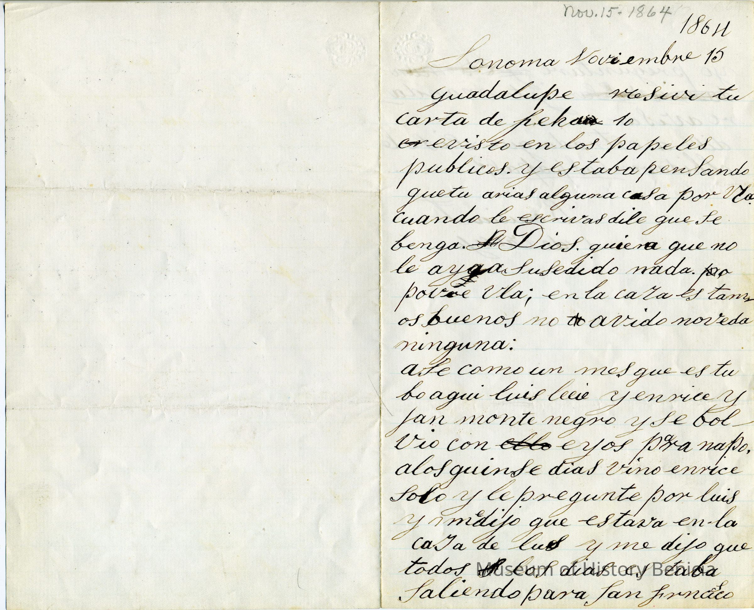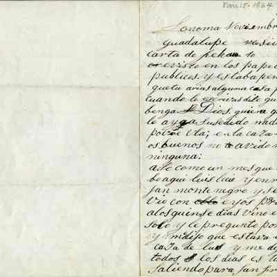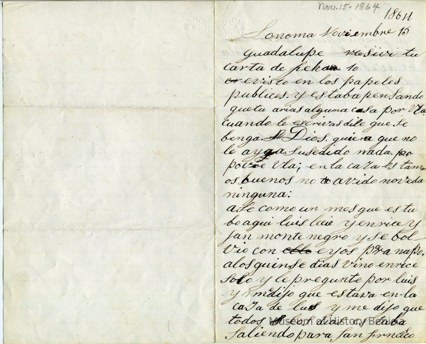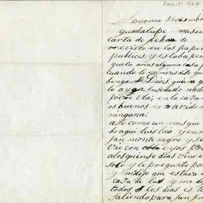 Letter written November 15th, 1864 by Dona Benicia d 'de Vallejo to Guadalupe. The letter is written on a lined piece of folded paper. On the bottom of the inside page is written in pencil "gift of Francisca Vallejo McGethgan (sic) to Mr & Mrs Richard R Emparan". It is in Spanish. Ms. Martha McGettigan (gr g'daughter of General Vallejo and Dona Benicia) says the name "Ula" refers to Uladislao, the 10th child of the General and Dona Benicia (1845 - ?). She is not sure why the sentences following that name are in the feminine but is researching it.