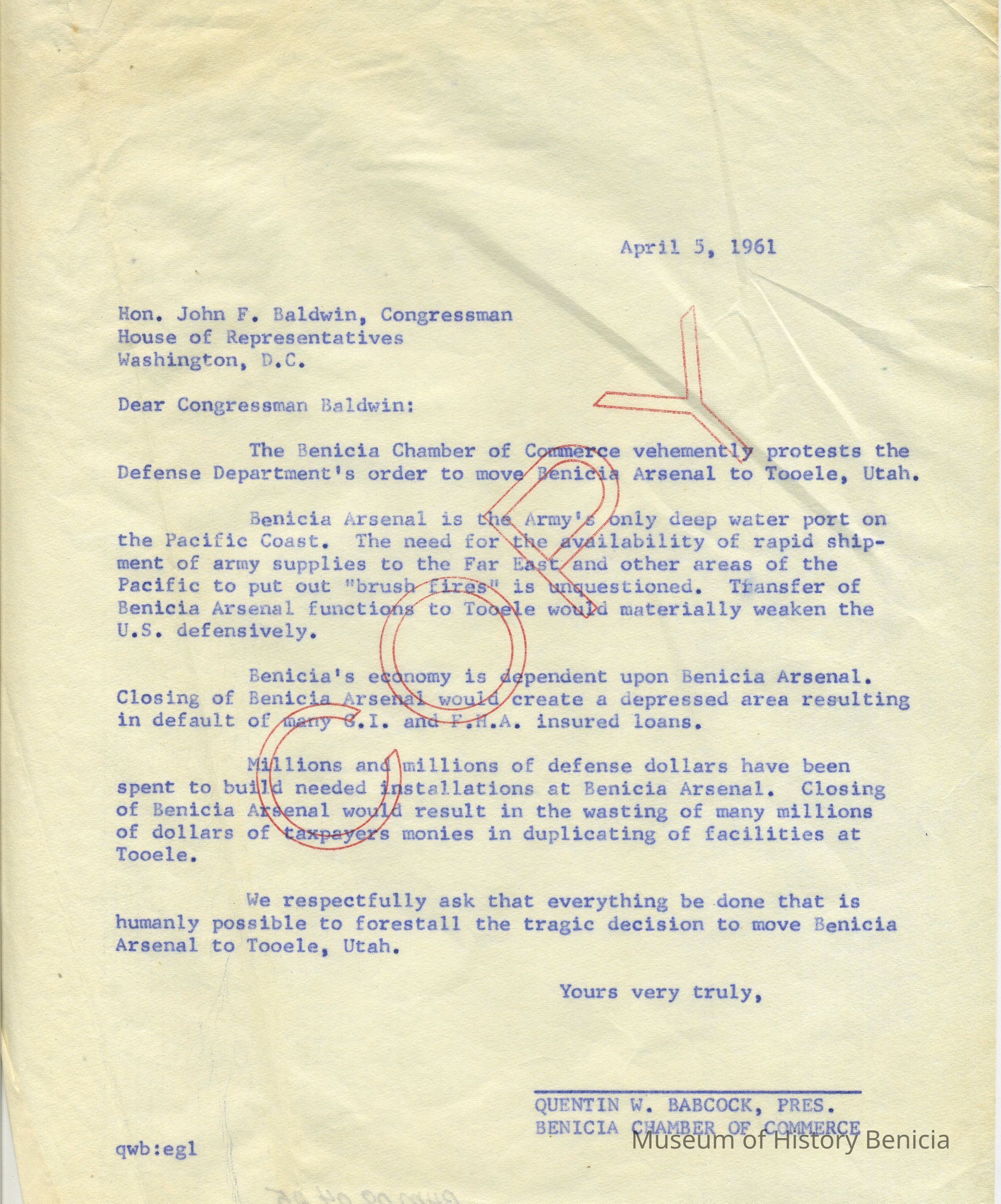 It is signed by Quentin W. Babcock, Pres. / Benicia Chamber of Commerce