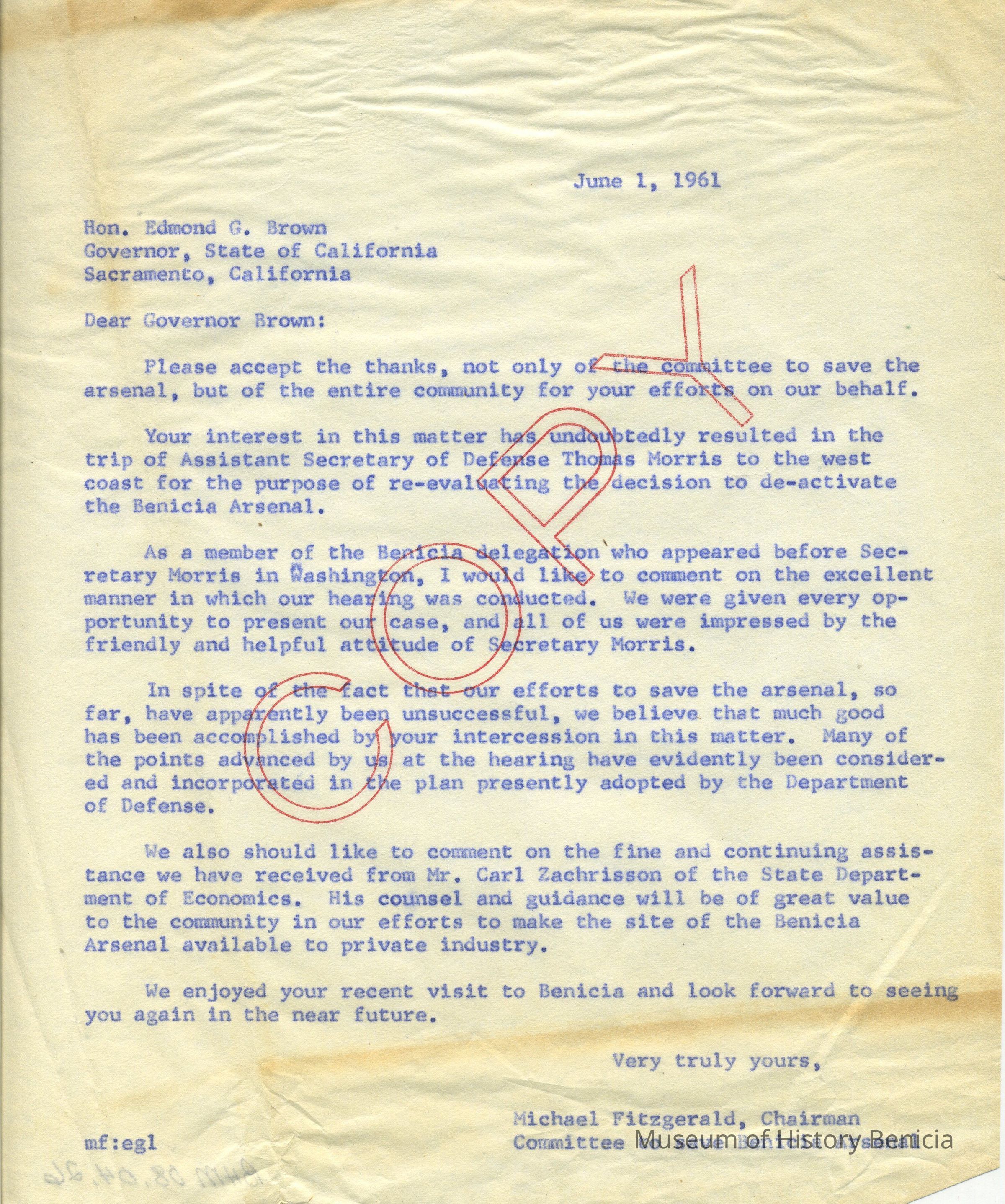 Carbon copy of a letter dated June 1,1961 to Hon. Edmond G. Brown / Governor, State of California / Sacramento, California