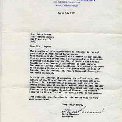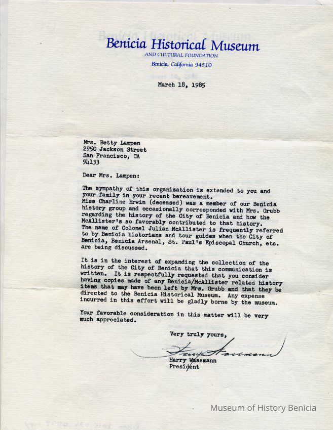 This is letter to Mrs. Betty Lampen from Harry Wassmann, President of the Benicia Historical Museum. Mr Wassmann expresses his condolences and suggests that copies of any Benicia/McAllister related historical items be copied and directed to the Museum.Collection