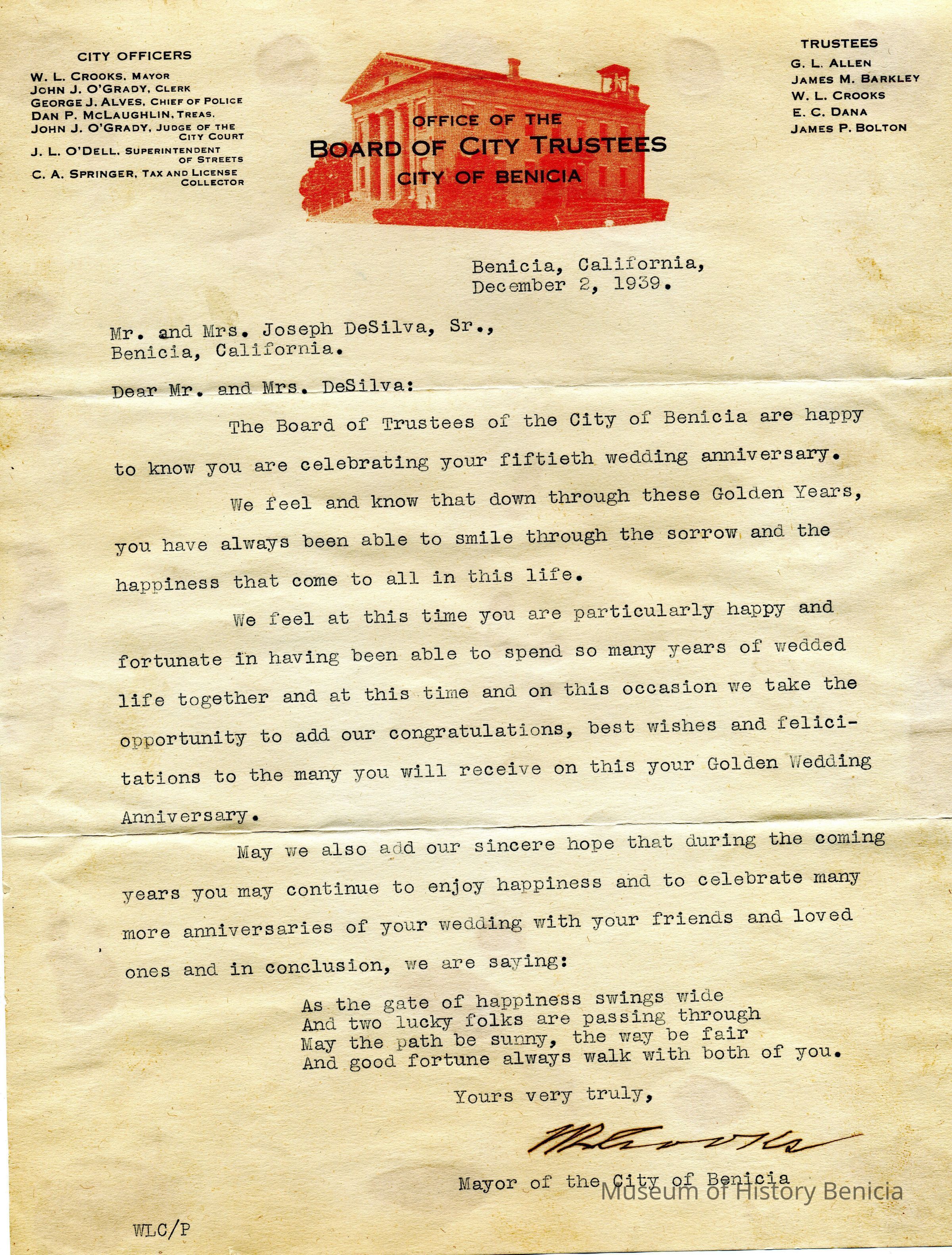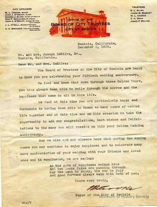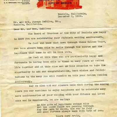 This is a letter of congratulations from the Mayor of Benicia on stationary showing the Trustees and city employees.Collection