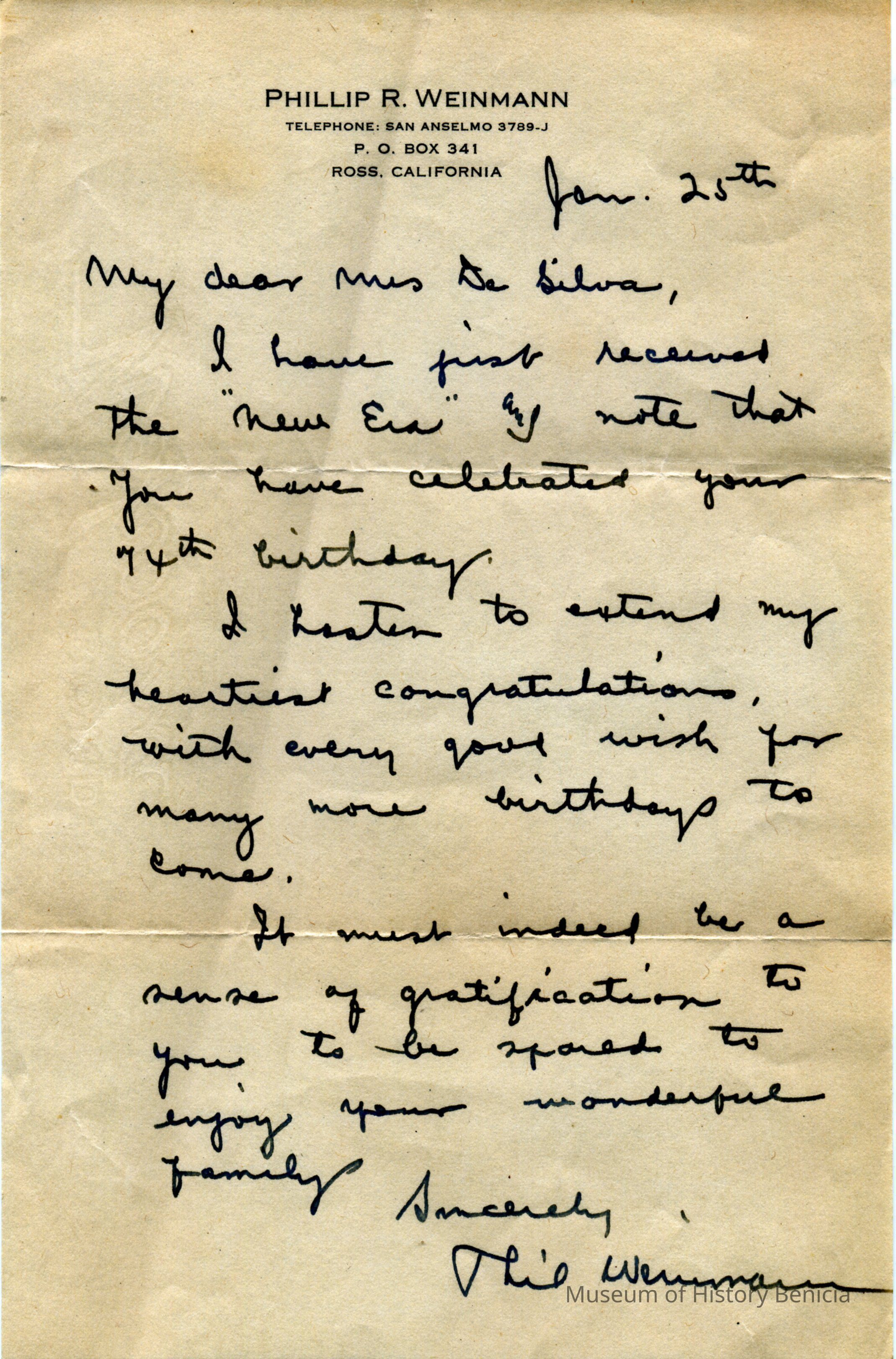 This is a letter of congratulations Philip R Weinmann of Ross, CA to Mrs De Silva on her 74th birthday.Collection