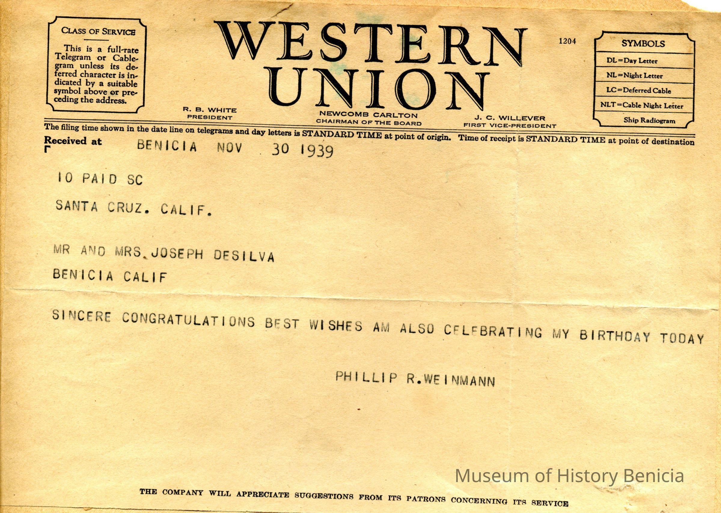 This is a telegram of congratulations from Philip R Weinmann of Ross, CA to Mr and Mrs De Silva on there anniversary. He is also celebrating his birthday.Collection
