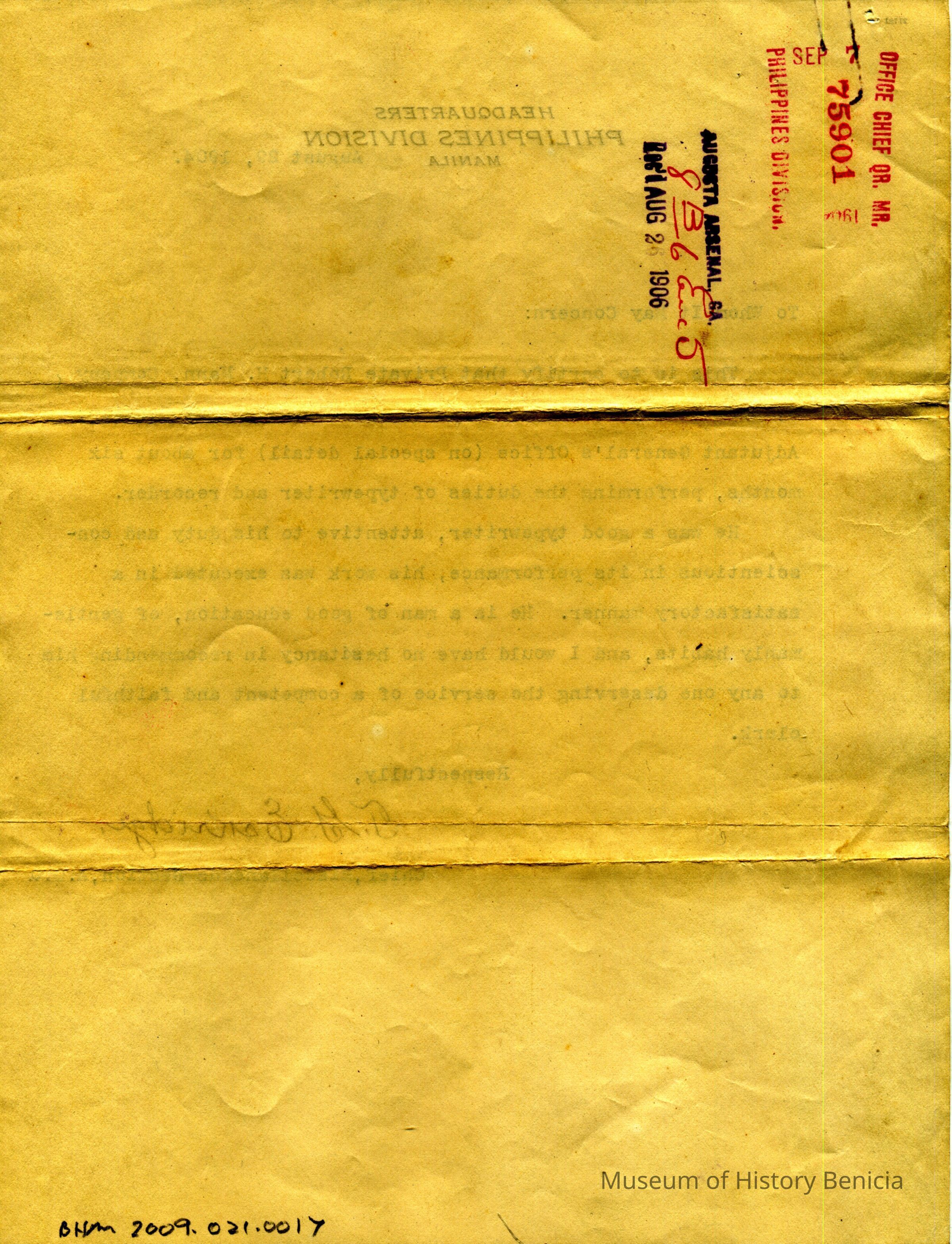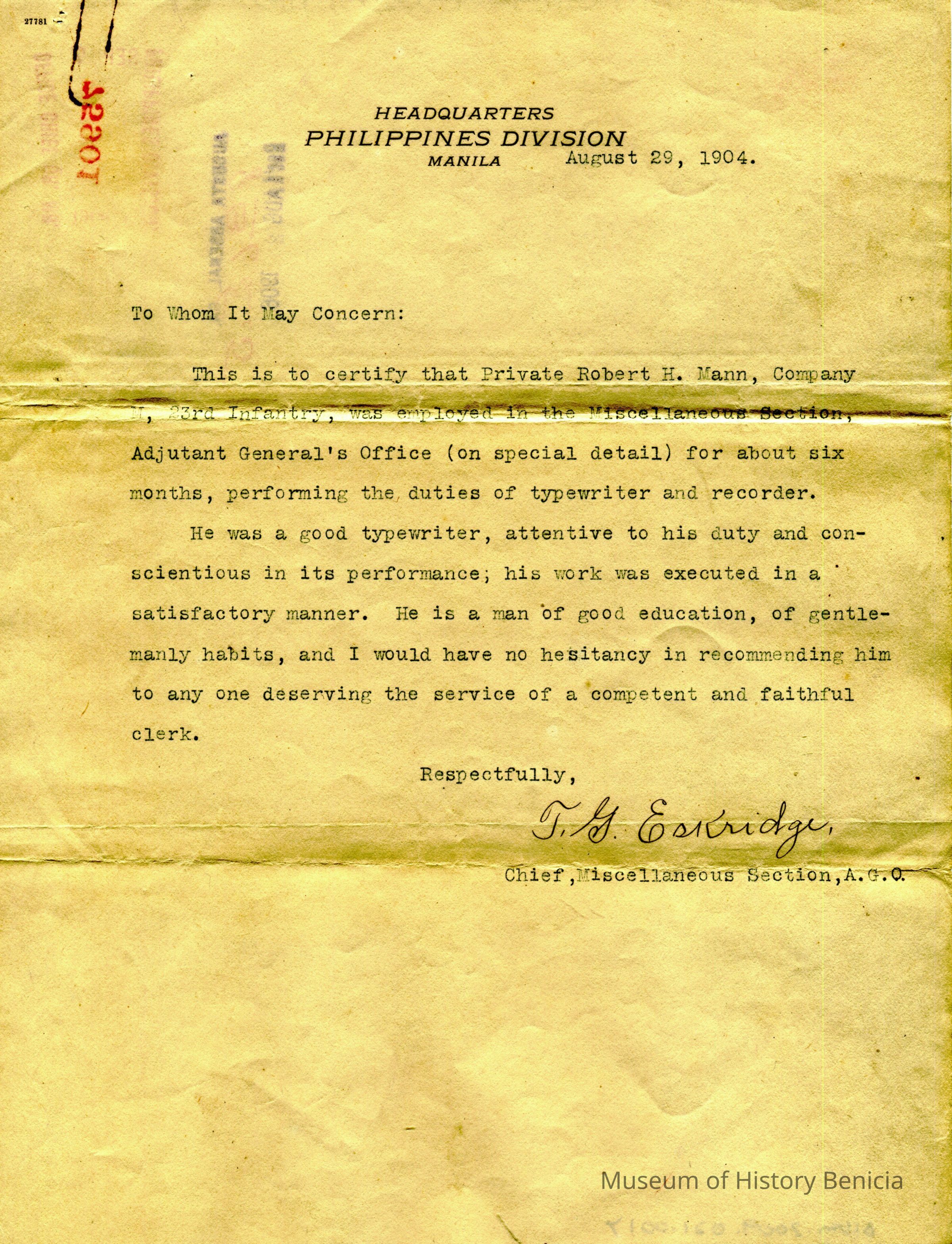 Letter of recommendation for Robert H. Mann from Chief T.G. Eskridge. The letter is dated 08/29/1904 and comes from the Headquarters Philippines Division, Manila.Collection