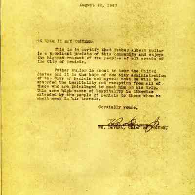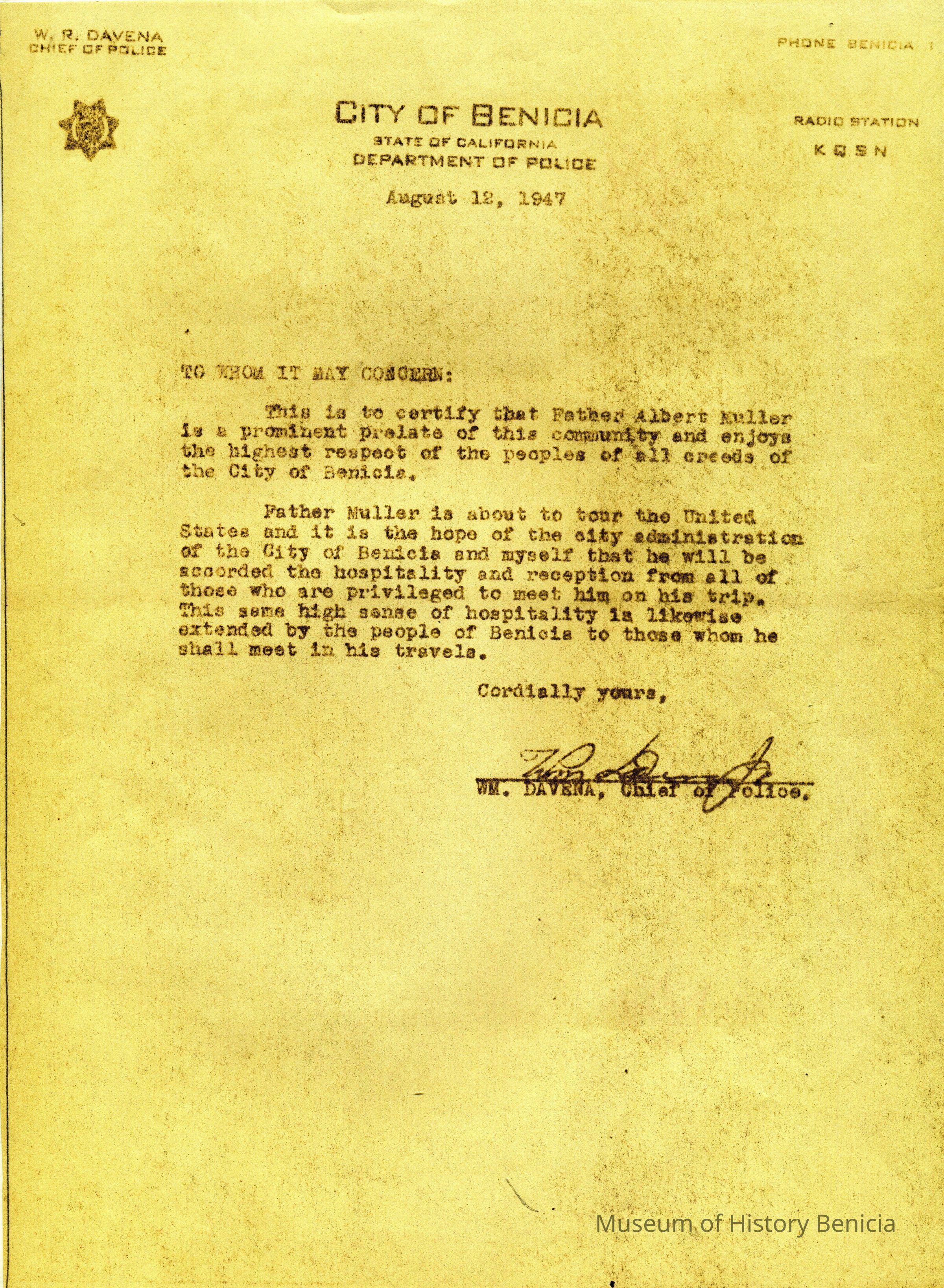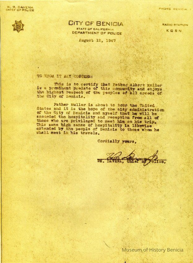 This is a copy of a letter from William Davena, Benicia Chief of Police, certifying that Father Muller is an upstanding member of our community. The letter is being used to recommend the Father while he tours the United States.Collection