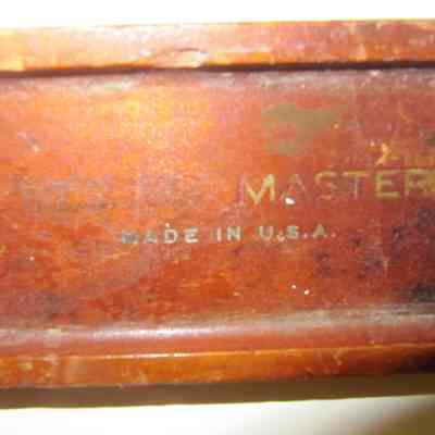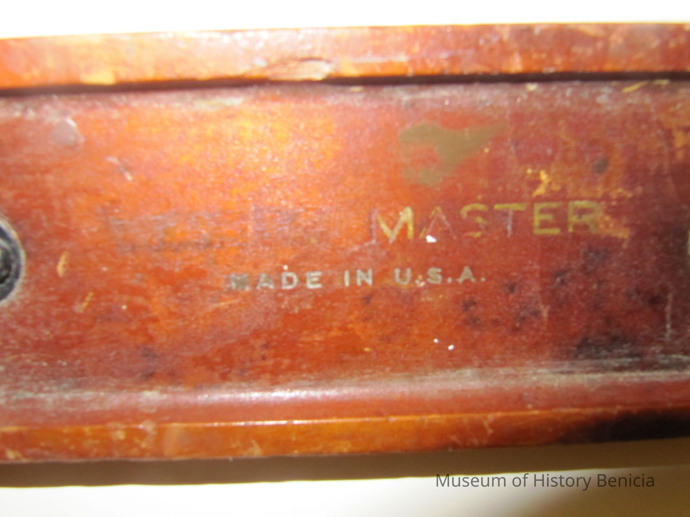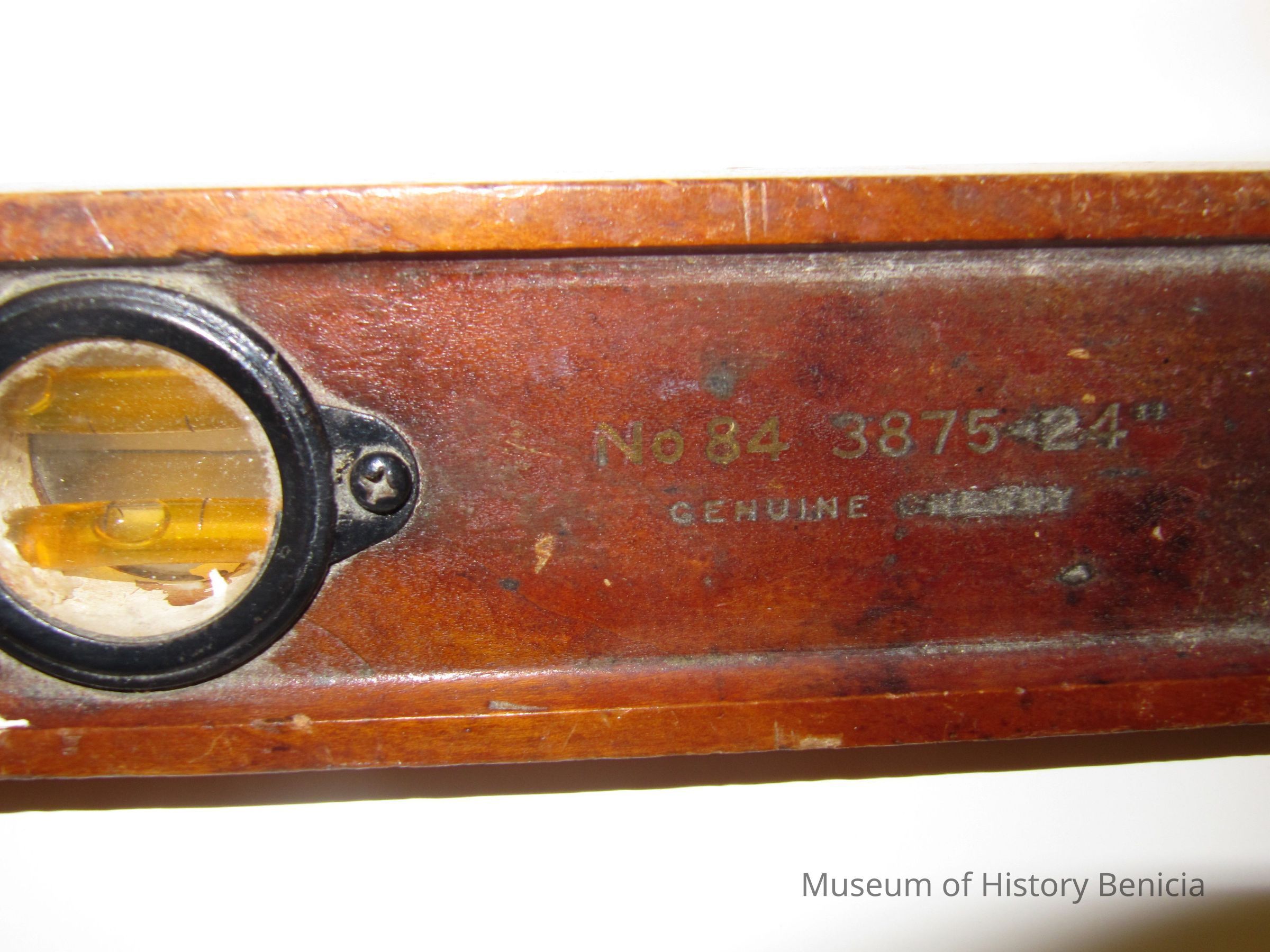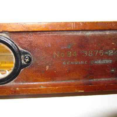 The wooden level is made of cherry wood. It is 2' in length and has 2 vertical and 1 horizontal level. "Master No. 3875-24", genuine cherry, made in USA."Collection