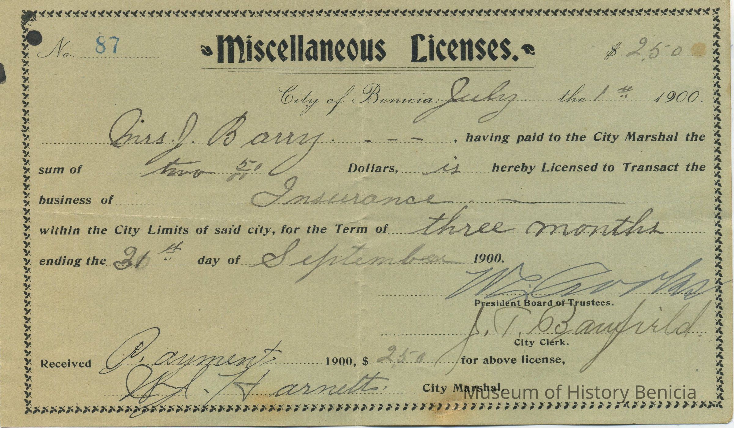 Mrs. J. Barry having paid to the City Marshal the sum of two 50/00 Dollars, is hereby Licensed to Transact the business of Insurance with the City Limits of said city, for the Term of three months ending the 31st [sic] day of September 1900.