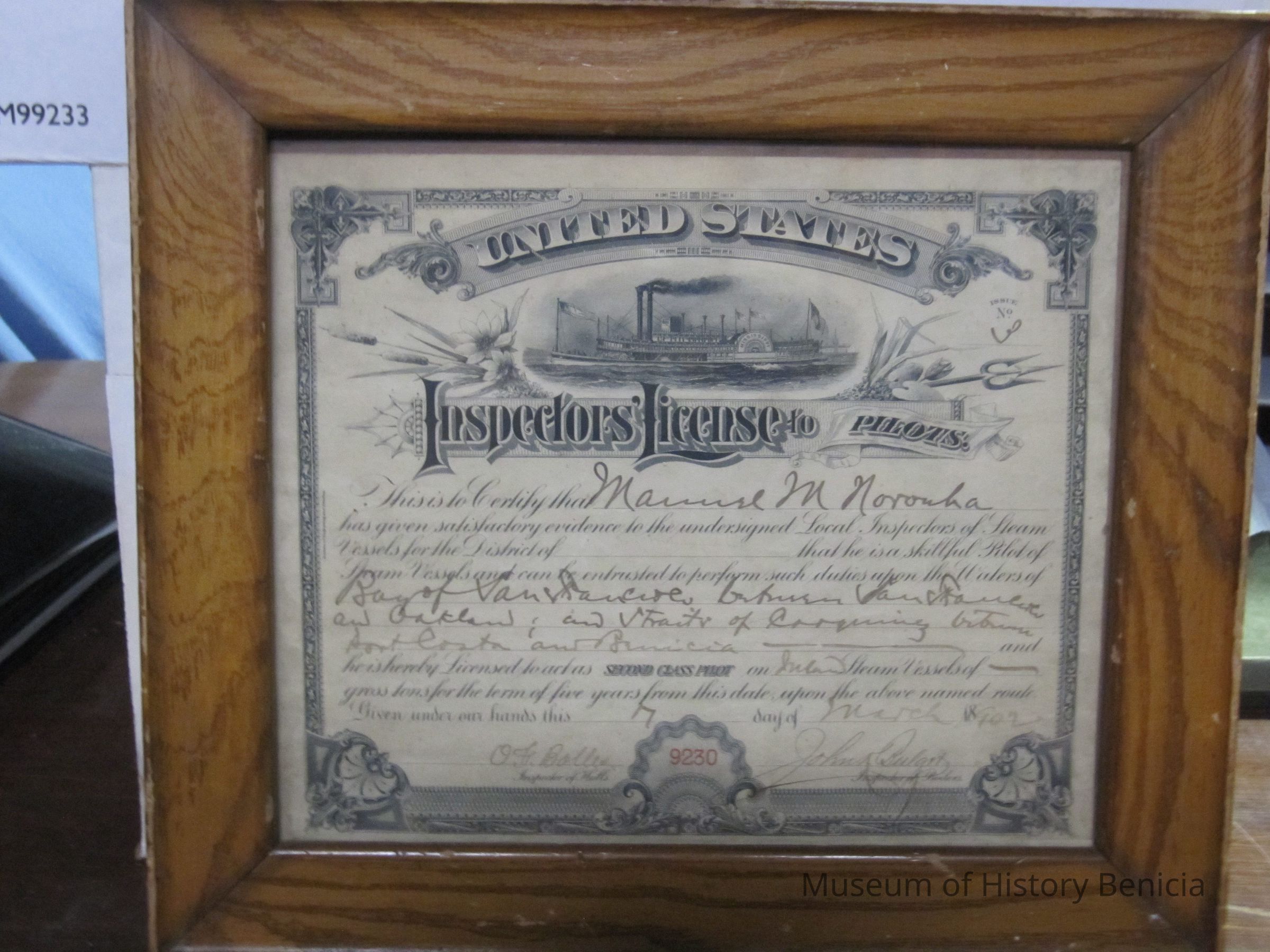 This is a framed inspector's license for pilots issued to Manuel Norouka in 1902.
