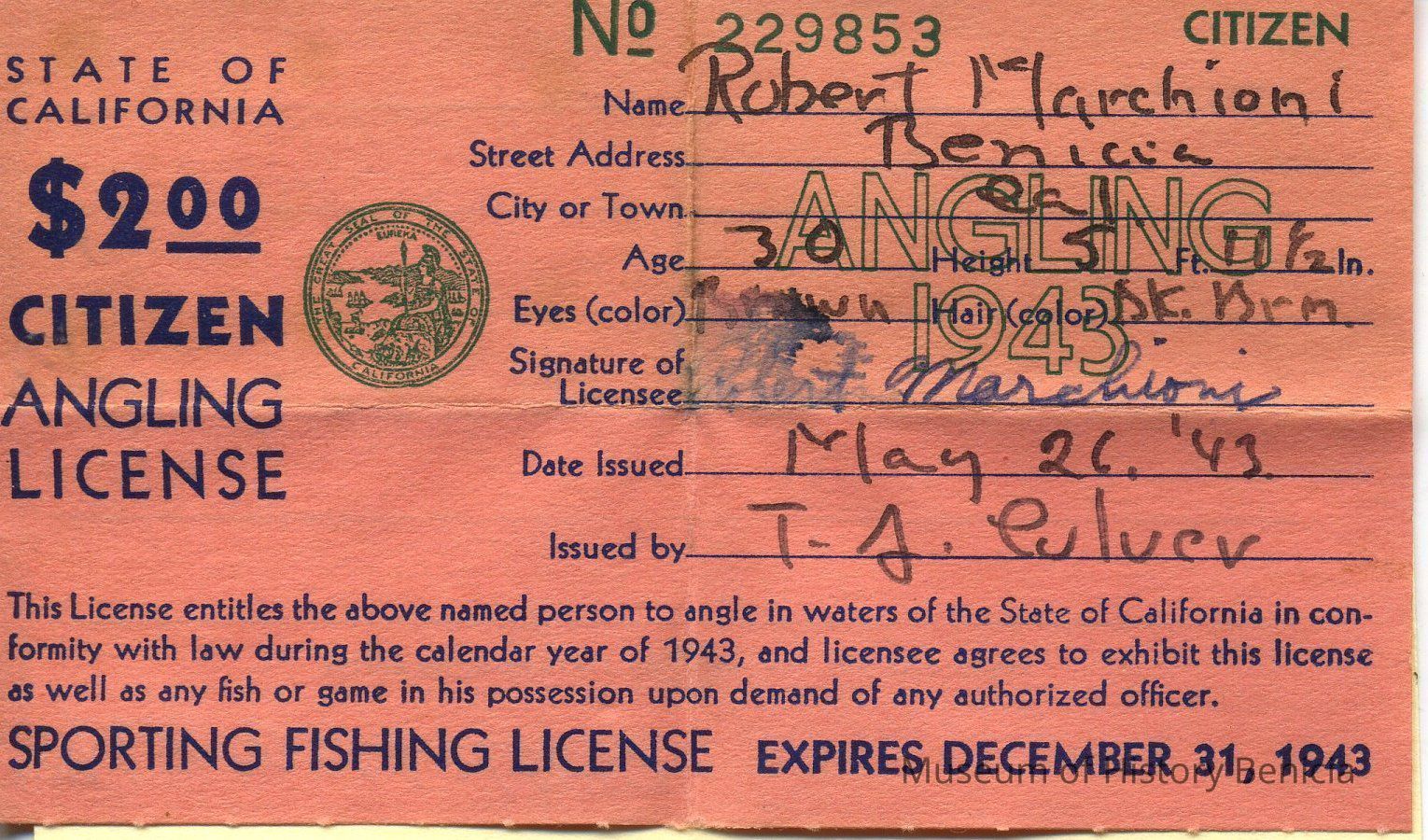 License - State of California Citizen Angling License $2.00 No. 229853