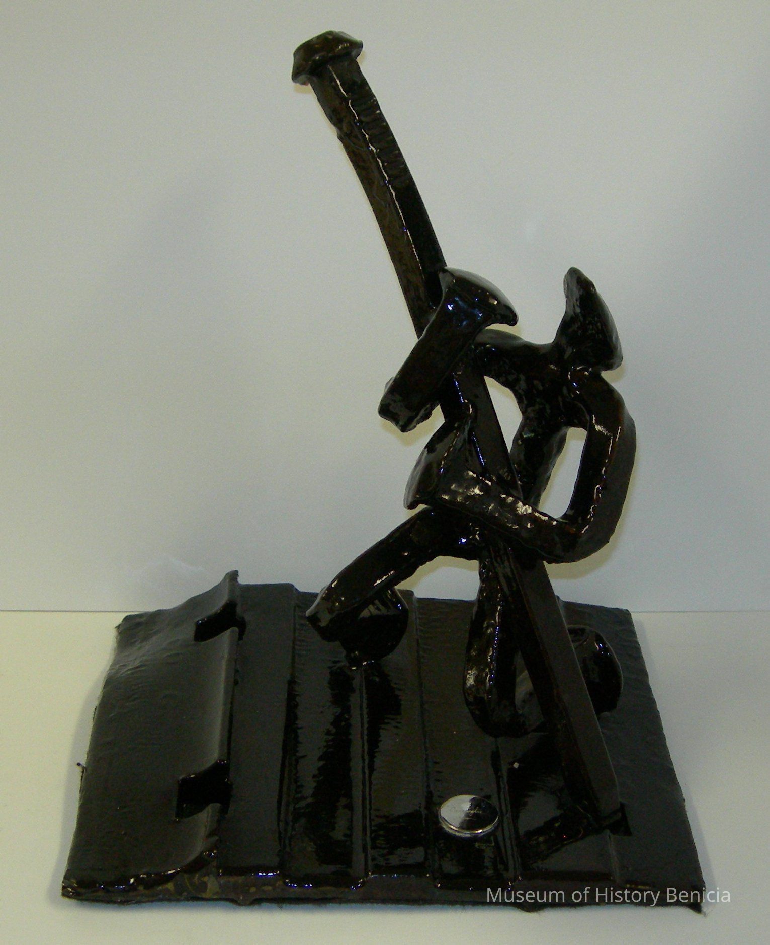 An original "railroad worker" welded steel sculpture made with railroad materials from the Northern California company town of "Hilt". The sculpture was created using railroad spikes, a section of track plate and an antique hand tool from the mill/logging area.Collection