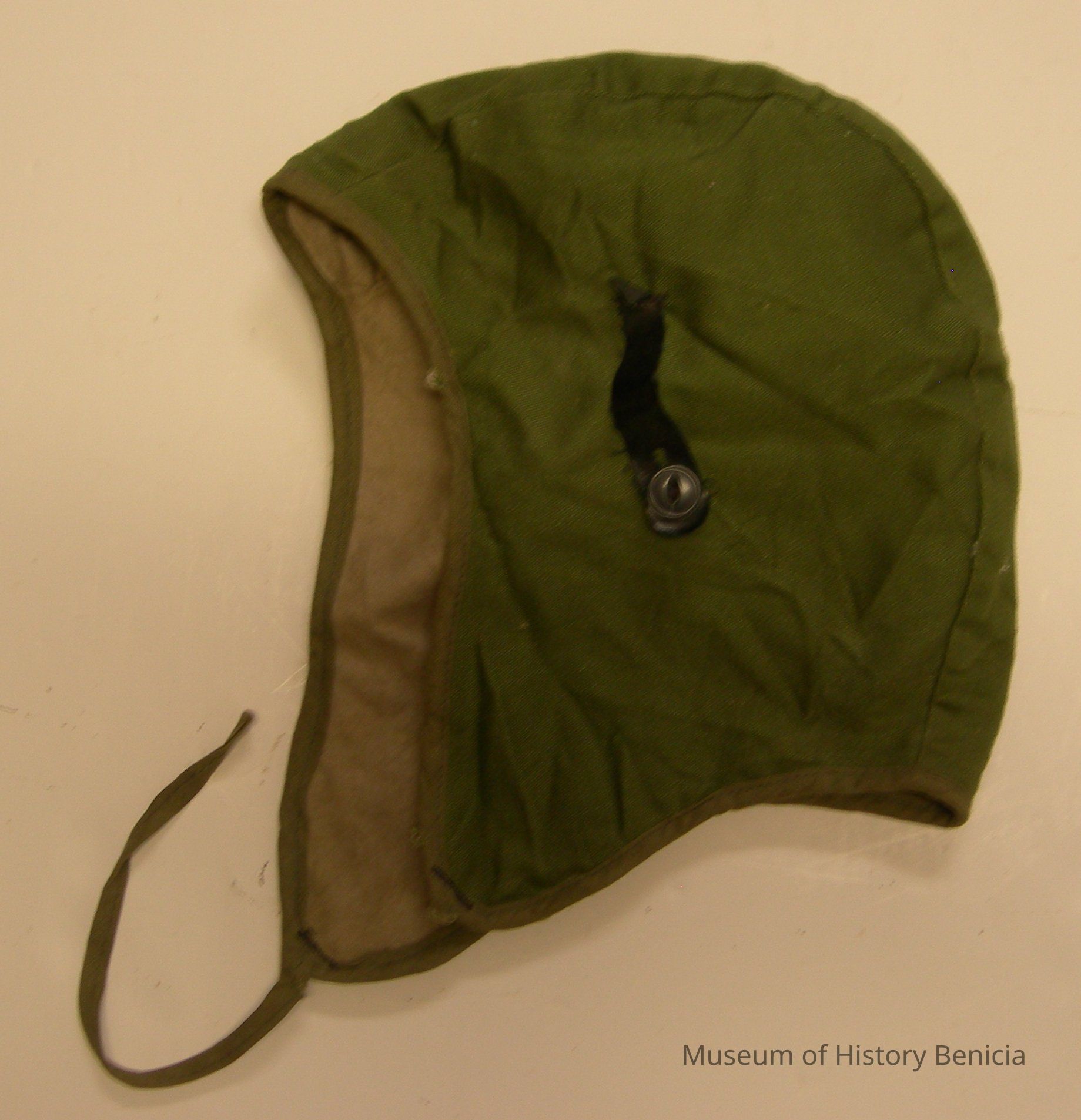Cap, helmet liner, twill and wool-flannel lining; green and gray, string ties under chin