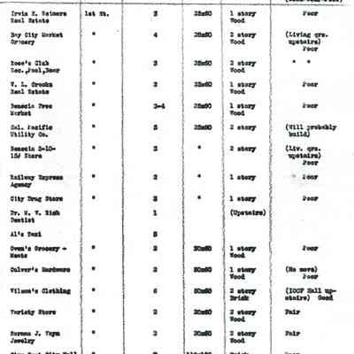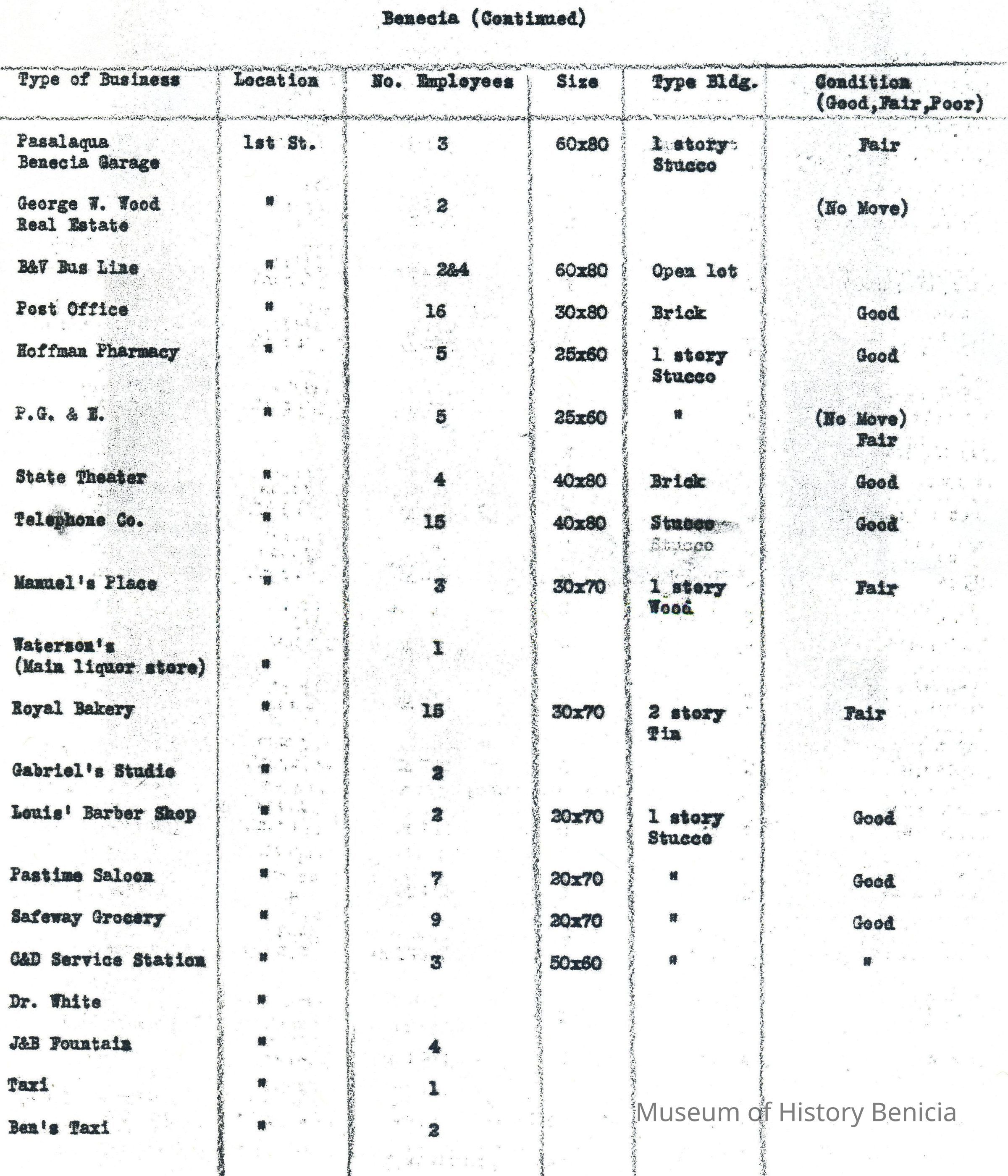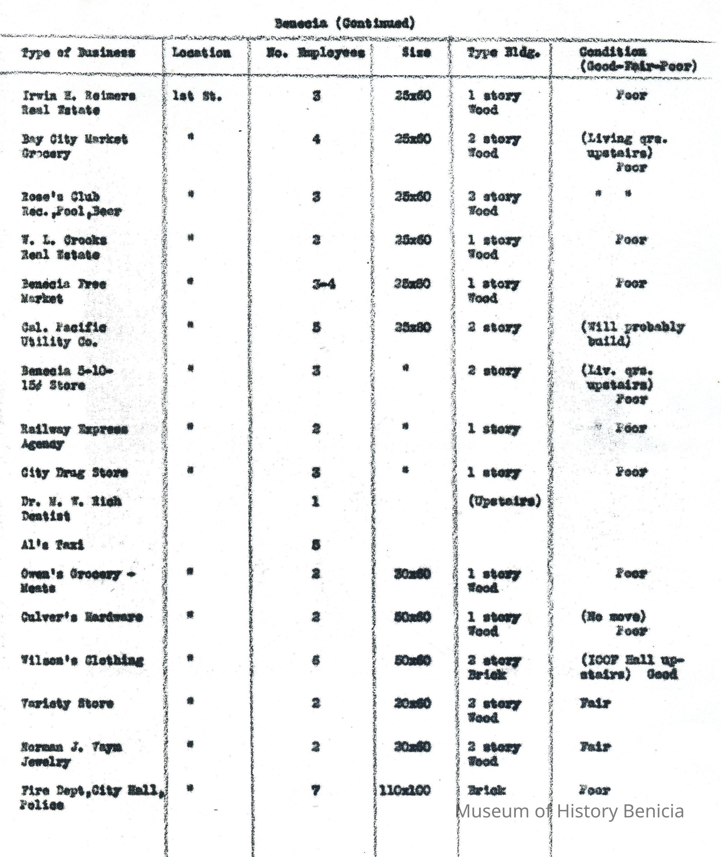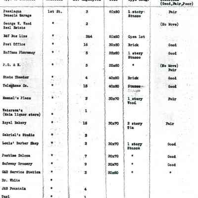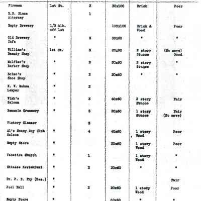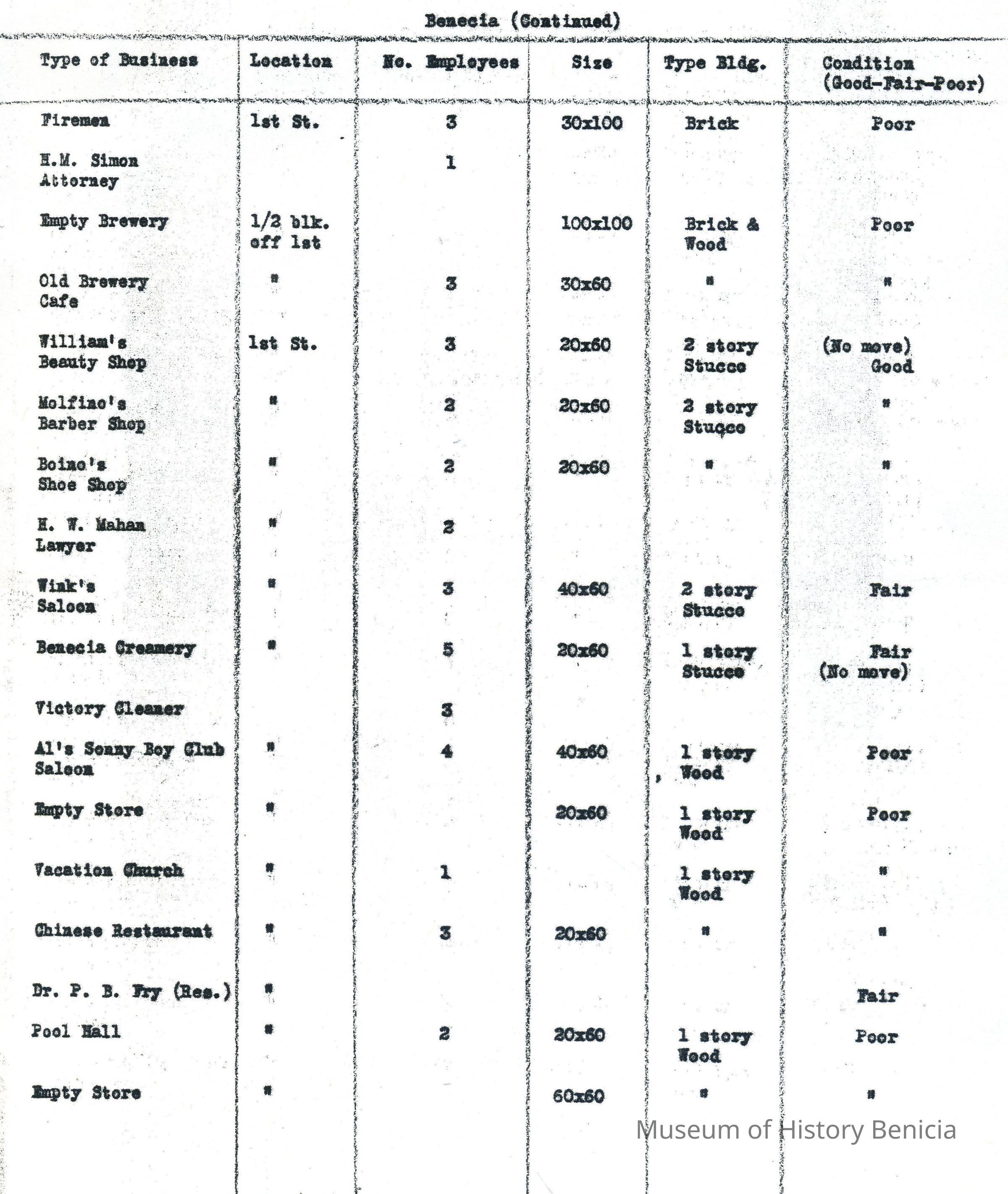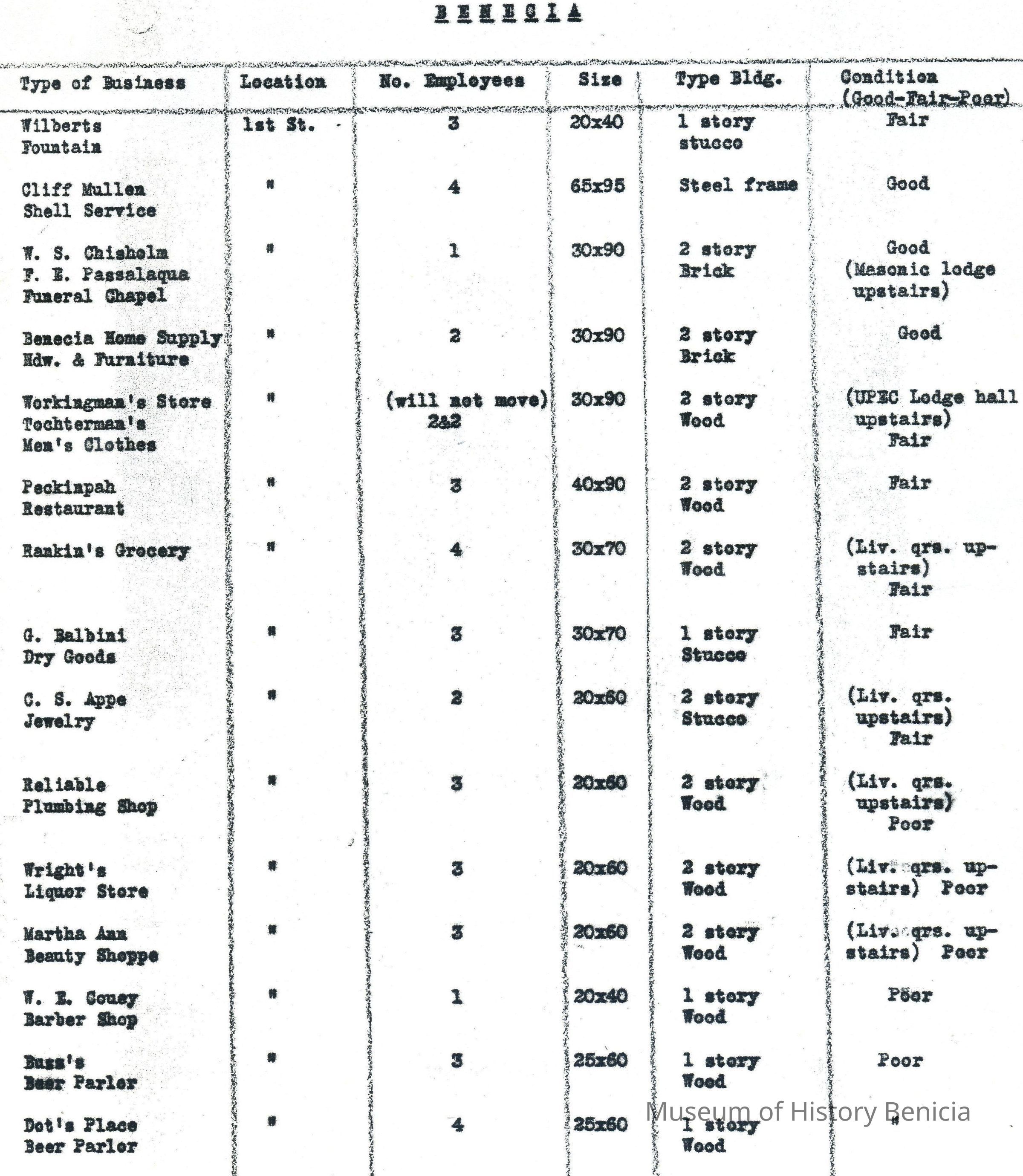 Columns of information: Type of Business, Location (no street number), Number of Employees, Size, Type of Building, and Condition (building - good/fair/poor)