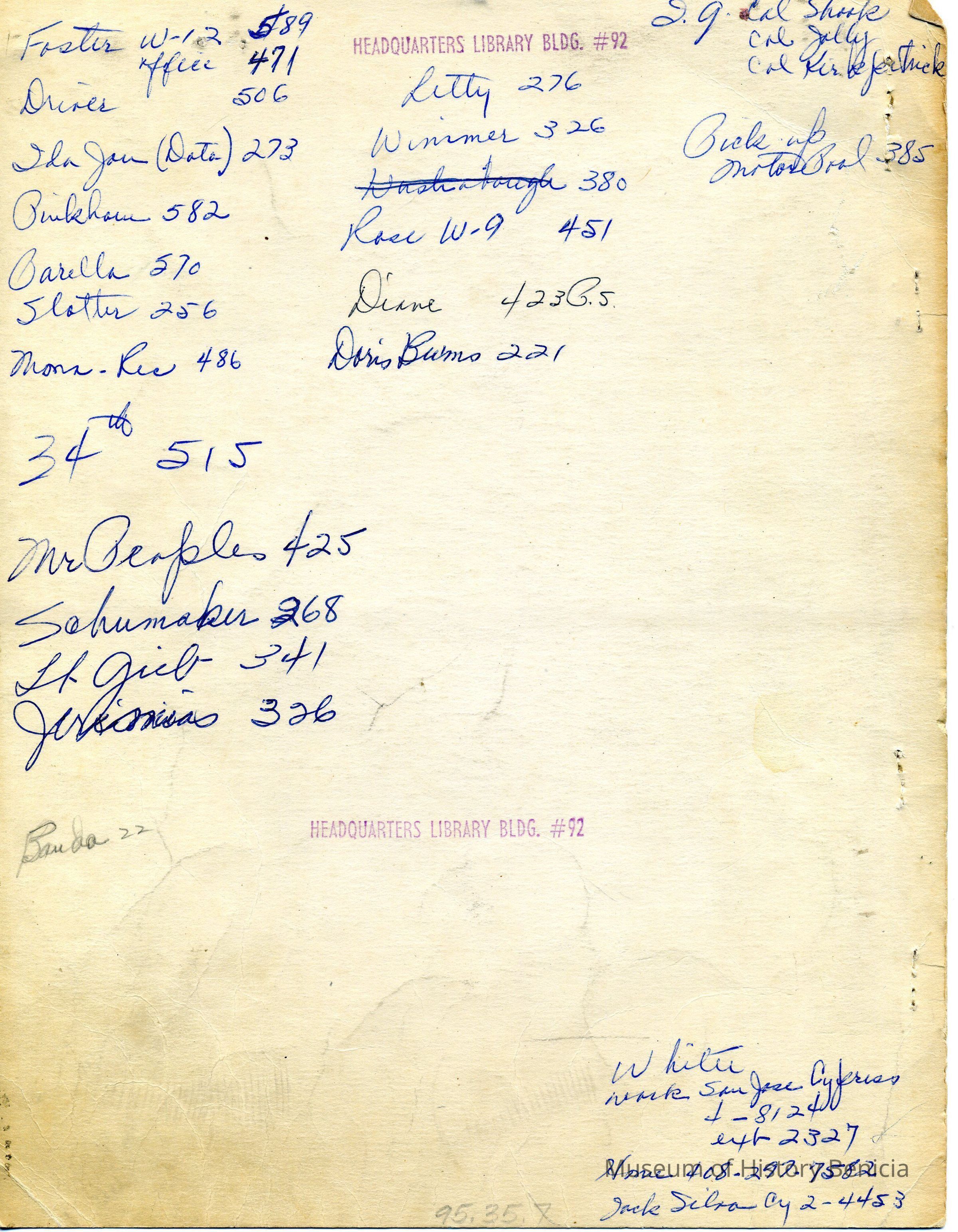 List of telephone numbers - Benicia Arsenal Back page only, stiff paper with staple holes on right side 8" x 10-1/2
