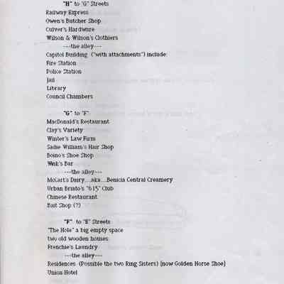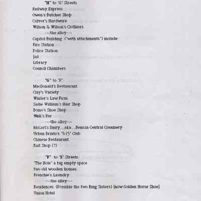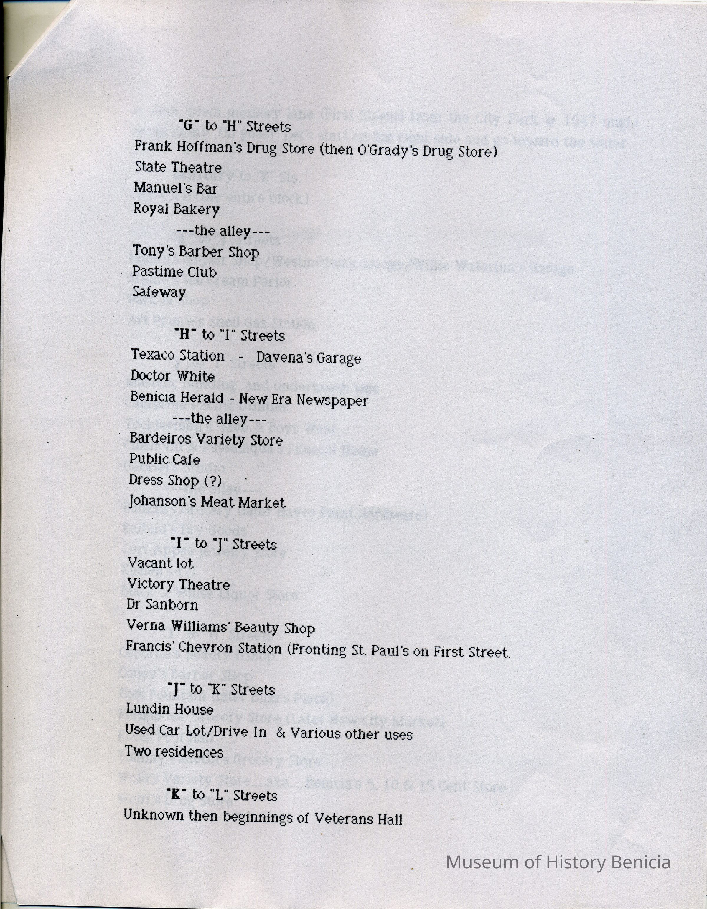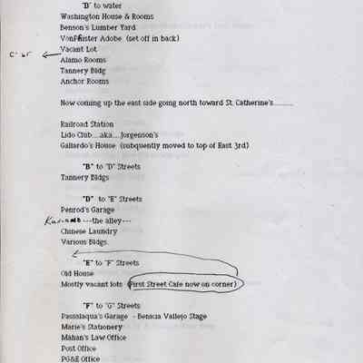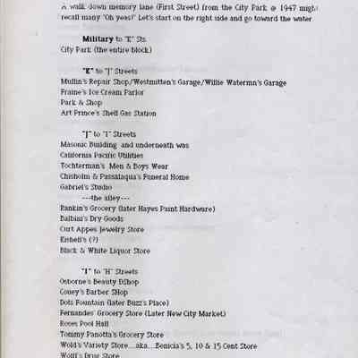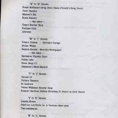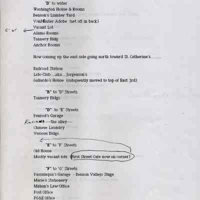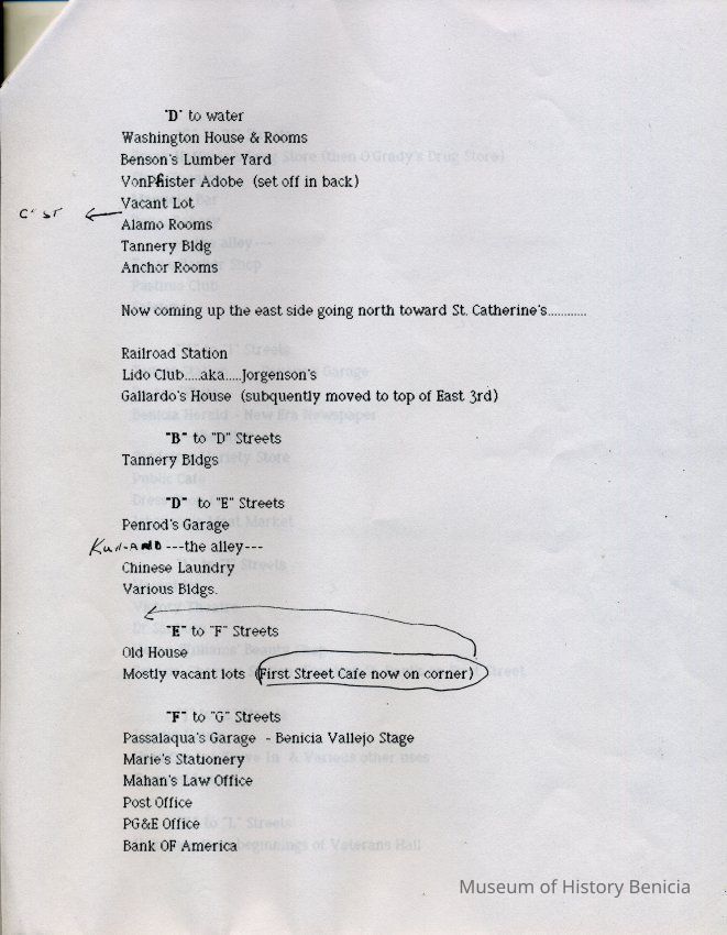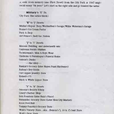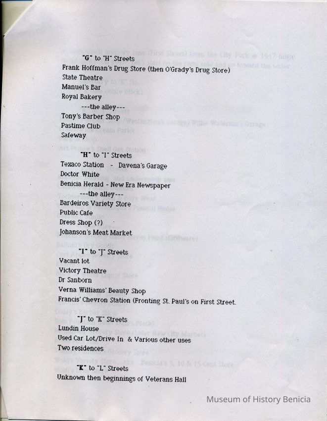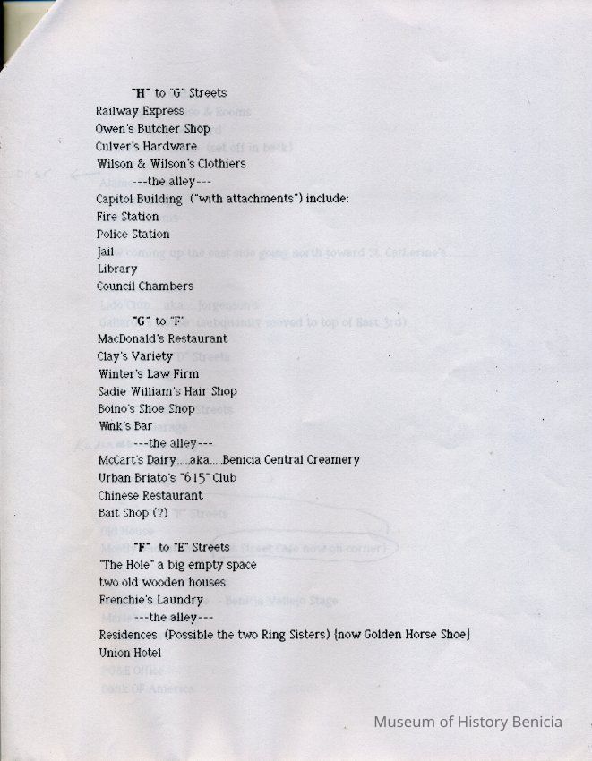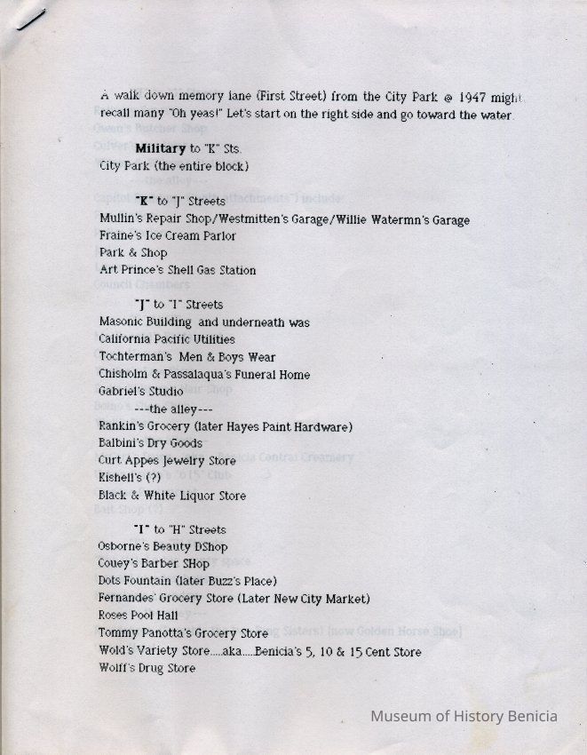 Information about the business on First Street in Benicia. This looks like a related list to 2012.018.0009. It shows what business was at a specific location on First Street in 1947. This may be a list that was said to have been created by the Benicia Historical Society.Collection