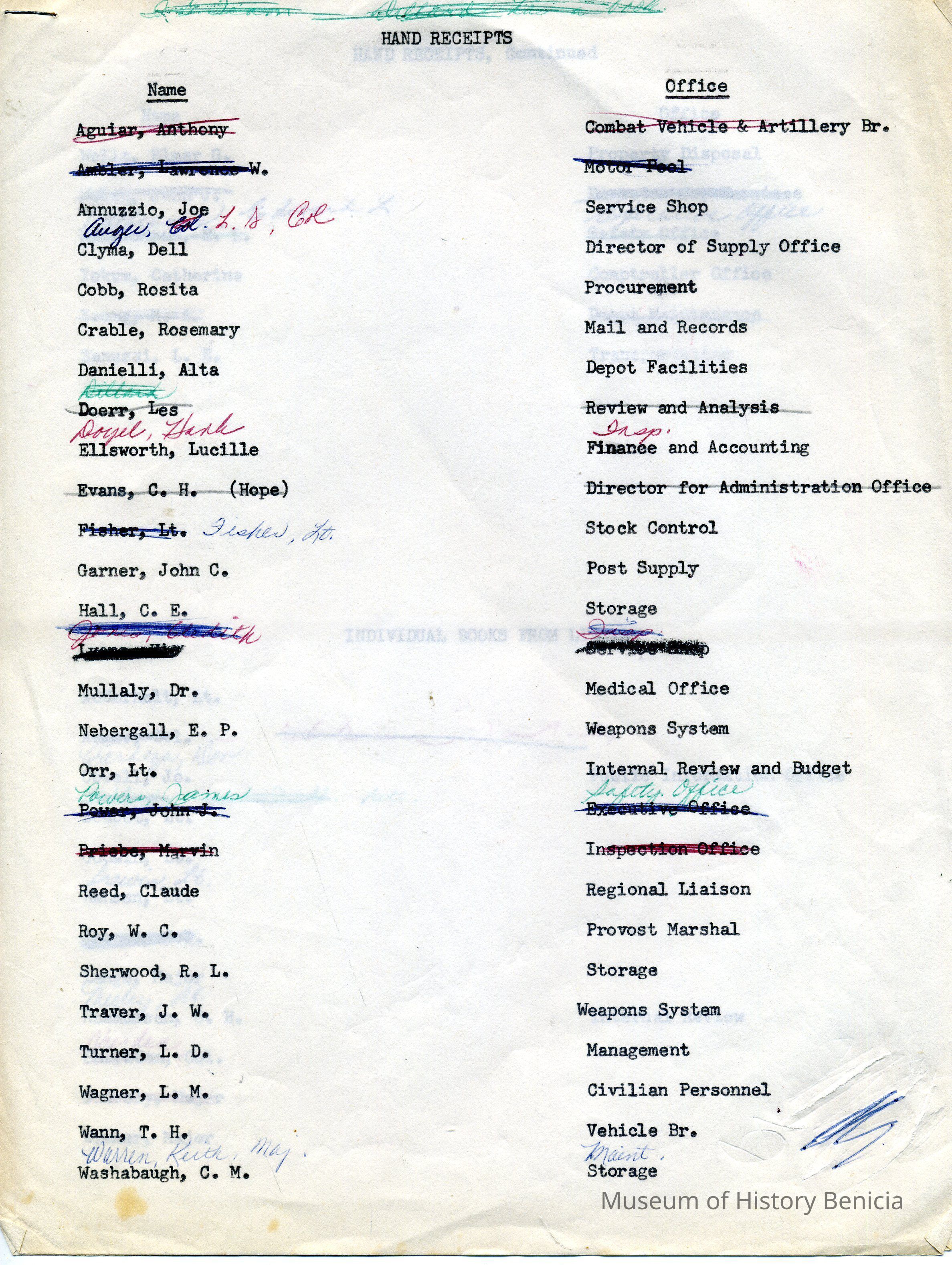 List - Hand Receipts Two columns: Name and Office 8" x 10-1/2"