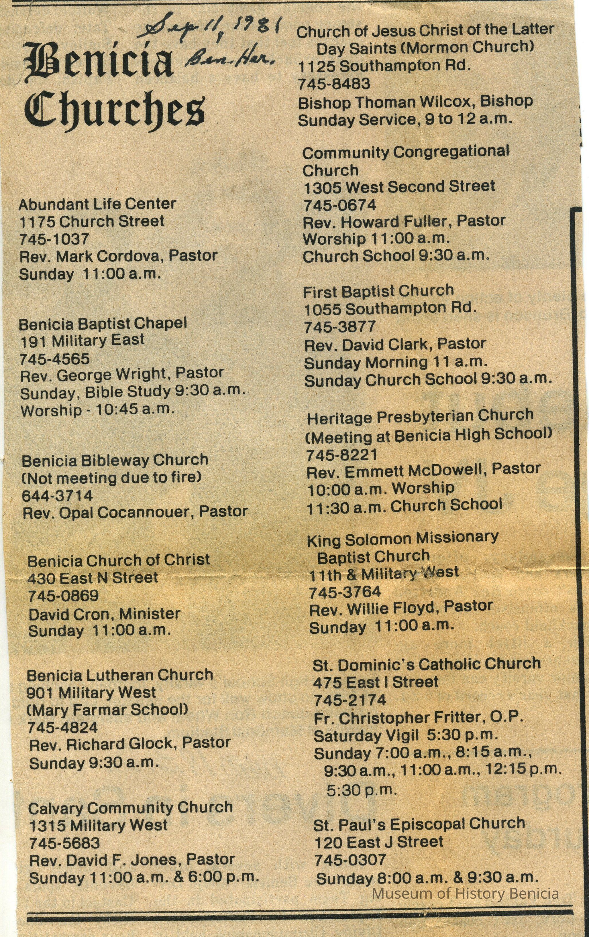 Listing of Benicia Churches from the September 11, 1981, Benicia Herald 13 Churches with addresses 5" x 8-1/2"