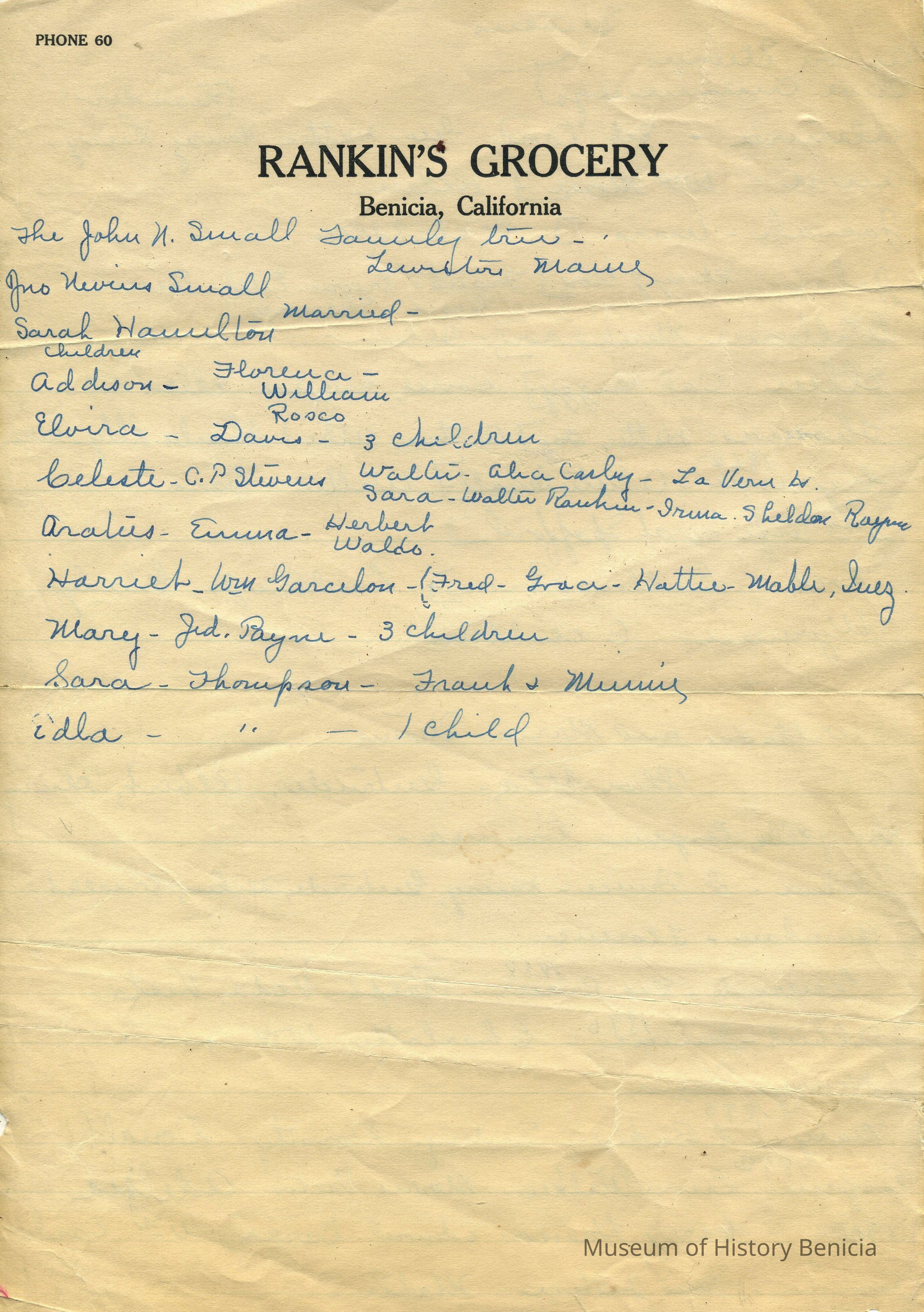 Family Tree written on two sides of a 7-1/4" x 11" lines sheet of stationery; "Rankin's Grocery / Benicia, California / Phone 60" List is as follows to the best of our translation skills: