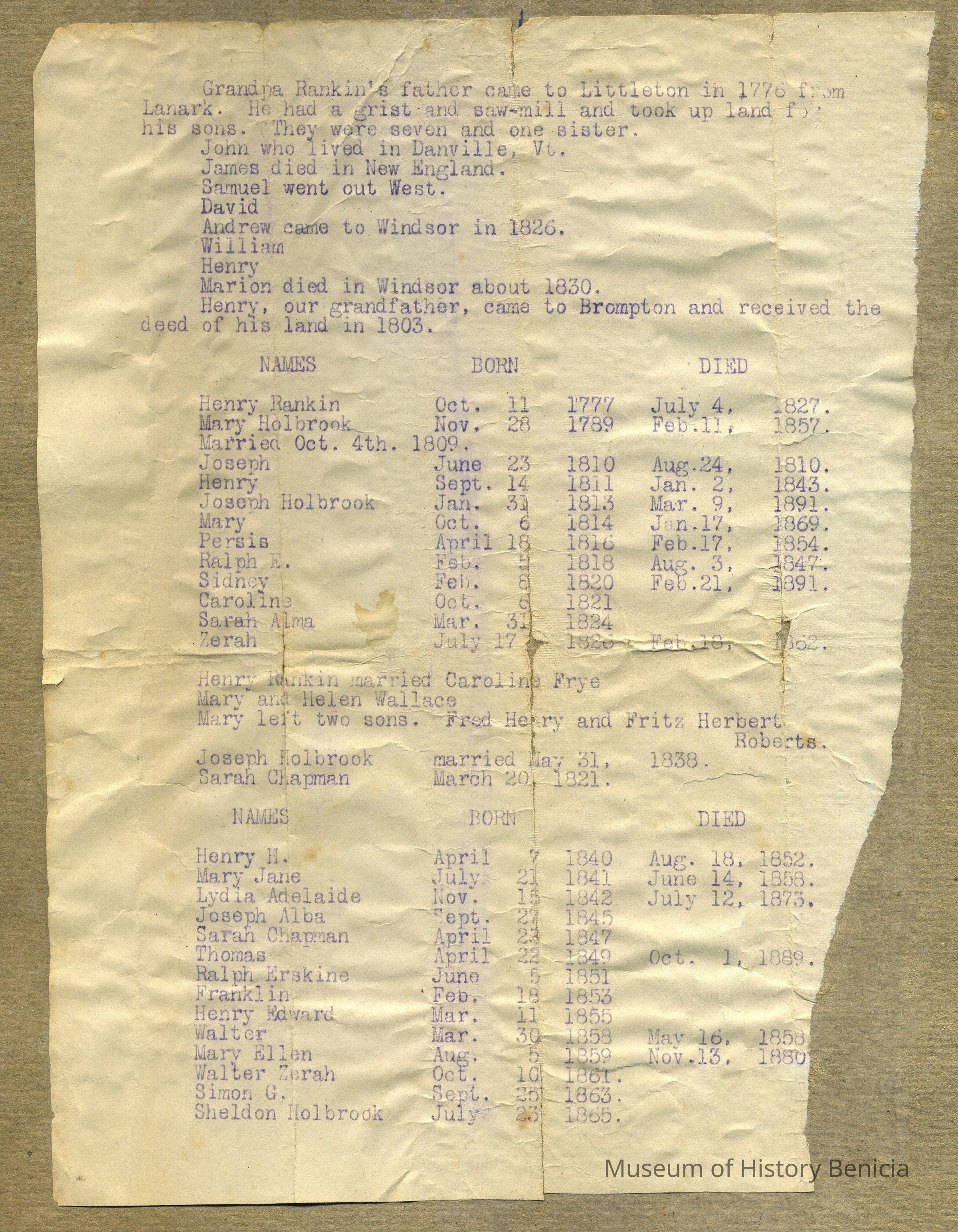 Side One: Grandpa Rankin's father came to Littleton in 1776 from Lanark. He had a grist and saw-mill and took up land for his soms. They were seven and one sister.