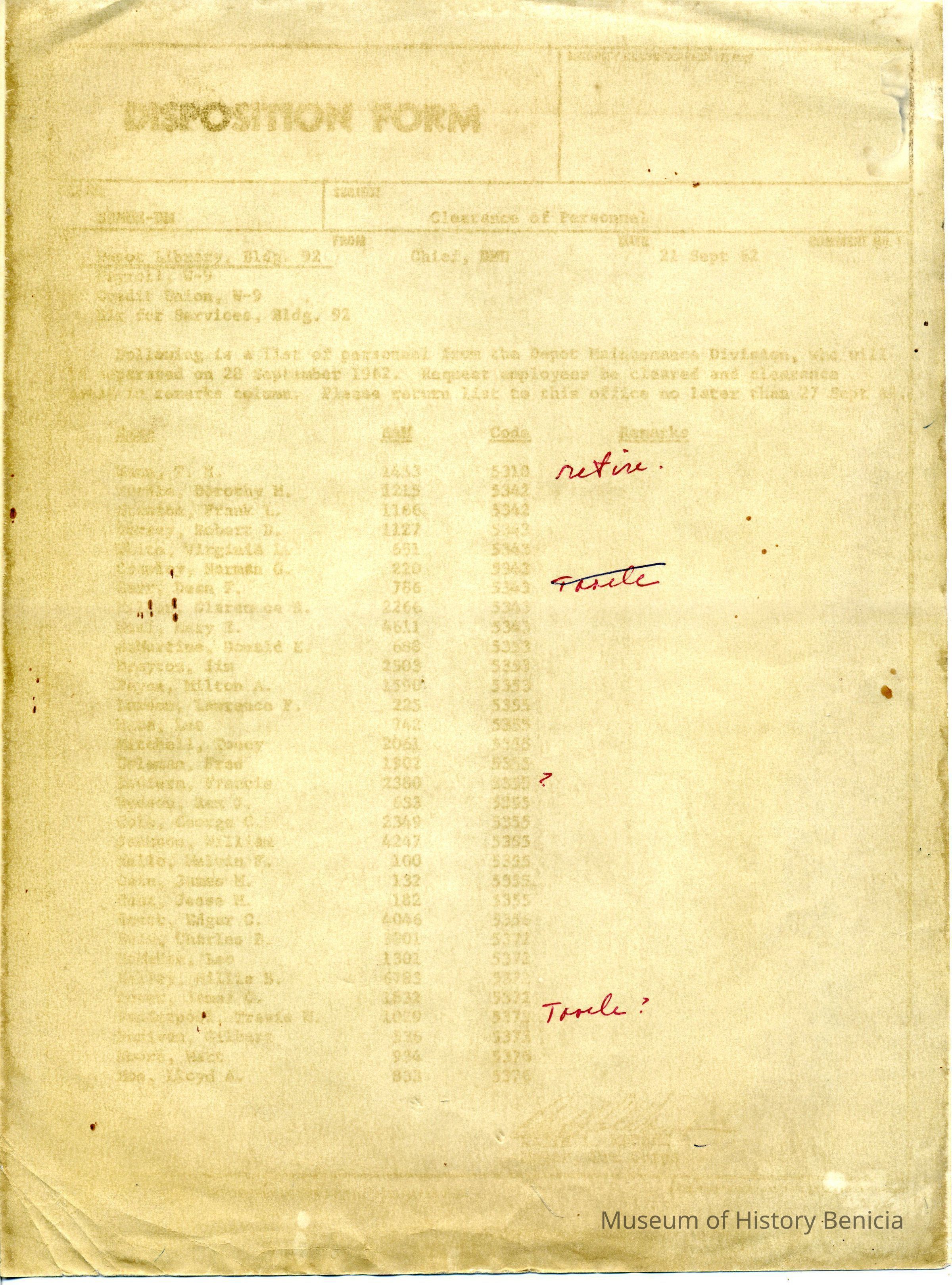 Benicia Arsenal List of Depot Maintenance Dept. Employees Terminated 28 September 1962 8" x 11"