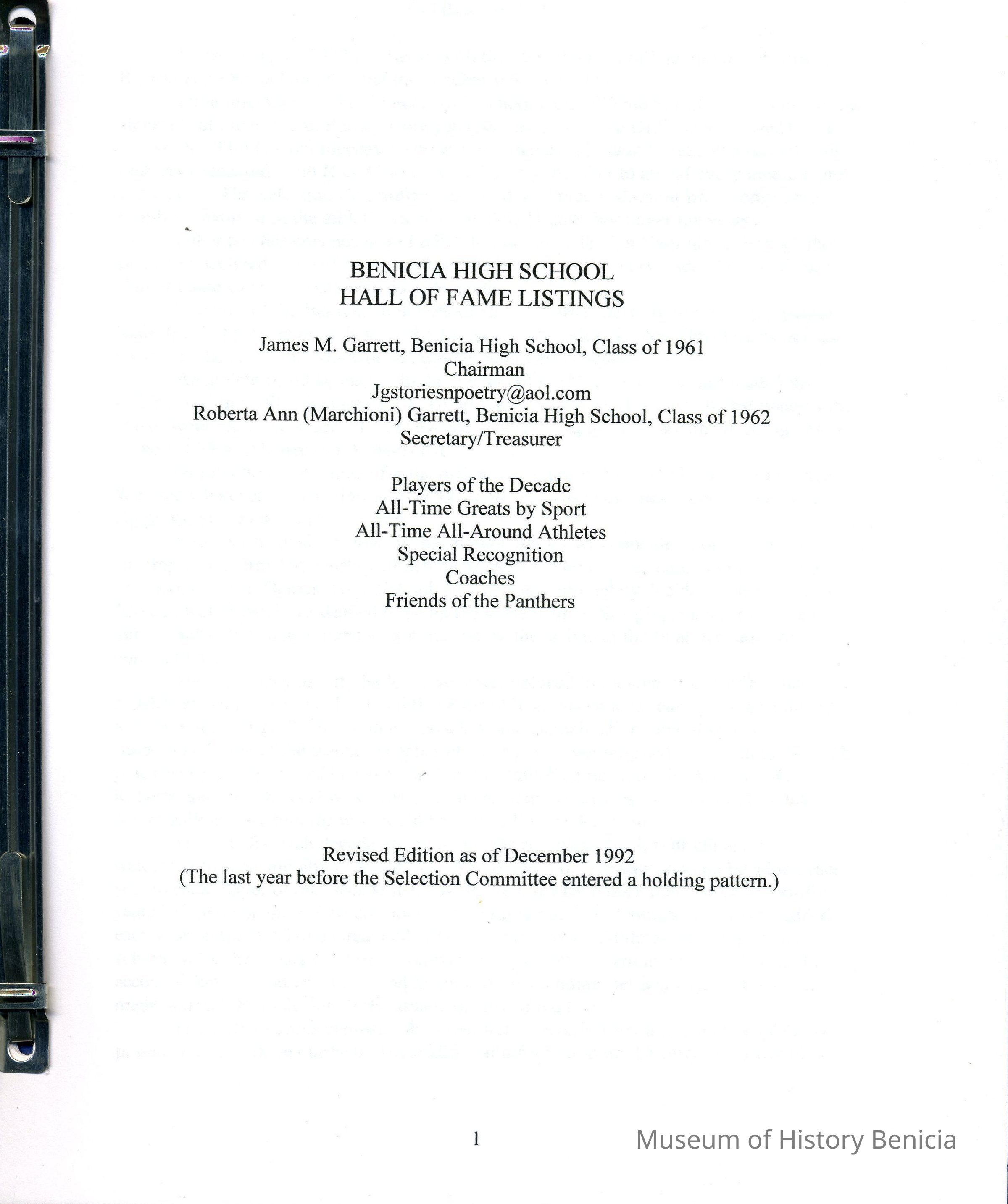 Booklet containing names of members of the Benicia High School Athletic Hall of Fame
